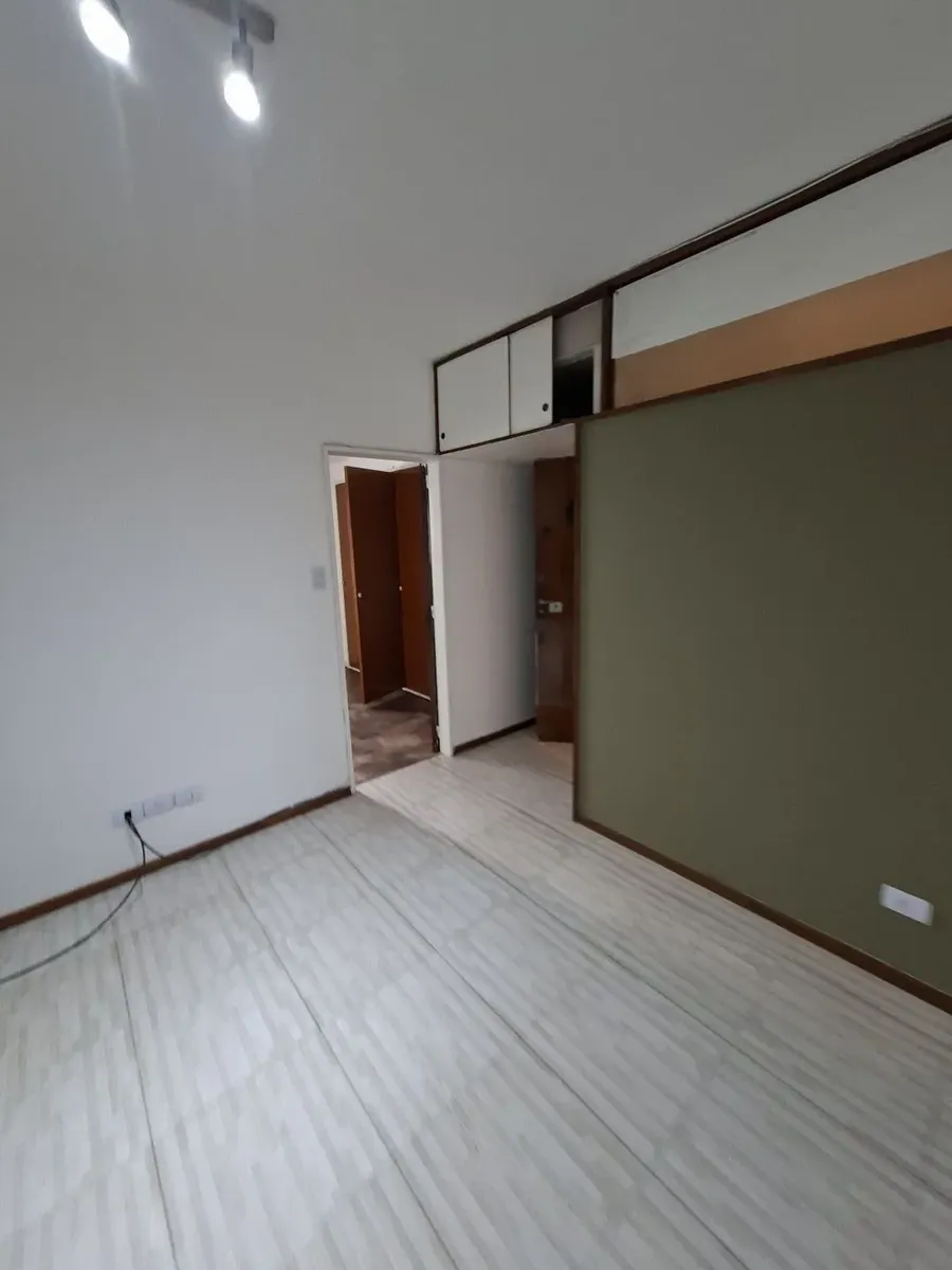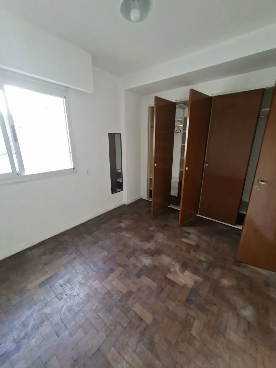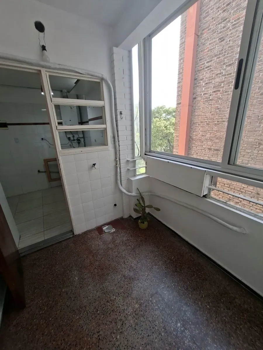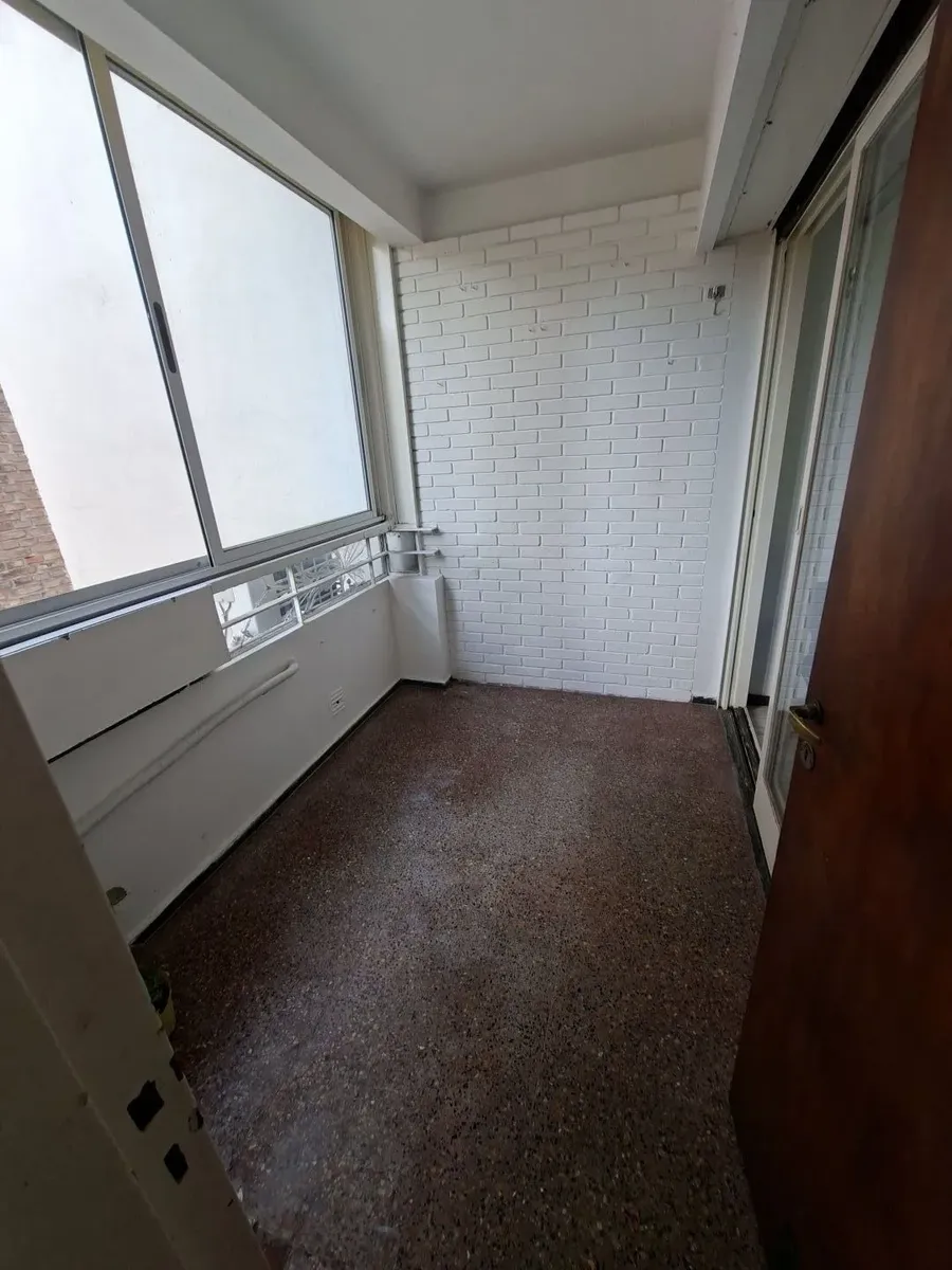 Квартира в Villa Devoto, 2 комнаты (1 спальня) без лифта, вход по лестнице. Площадь в описании не указана. Из прихожей вход в гостиную-столовую с керамическими полами, встроенным шкафом и выходом на балкон с остеклением; вид сбоку. Кухня полностью оборудована, частично объединена с гостиной и имеет отдельный выход на балкон. Ванная комната с ванной, душевой перегородкой и тумбой; спальня с паркетным полом, видом сбоку и большим встроенным шкафом. Квартира недавно окрашена, указано «в хорошем сос