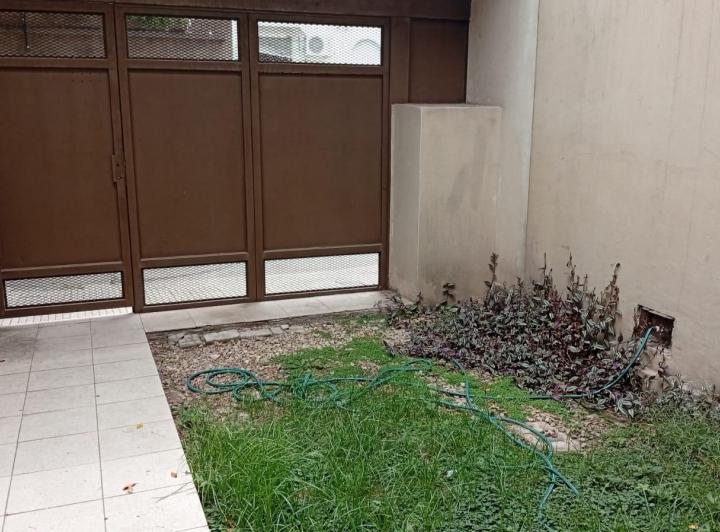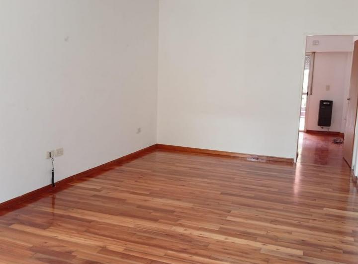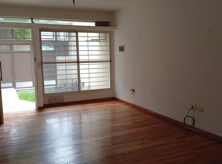 PH в Villa Devoto, 2 комнаты (1 спальня) на первом этаже, в здании на 4 квартиры. В жилой зоне паркет, кухня частично объединена, с газовой плитой и мебелью верх/низ. Спальня выходит окнами во двор, с встроенным шкафом; из неё есть выход в патио площадью около 15 m² и отдельная прачечная. Ванная комната с ванной и окном во двор. На территории у входа предусмотрено место для парковки (guardacoche). В объявлении указано «без коммунальных платежей здания».
