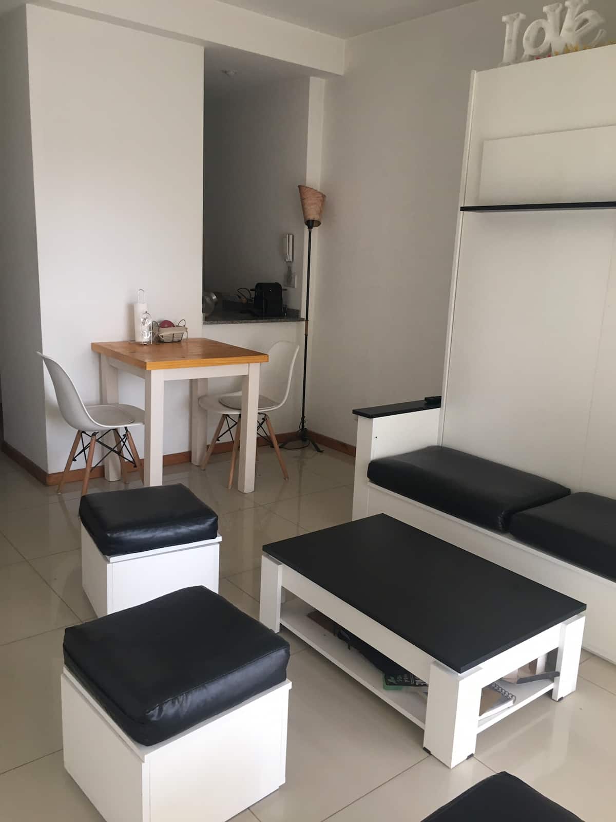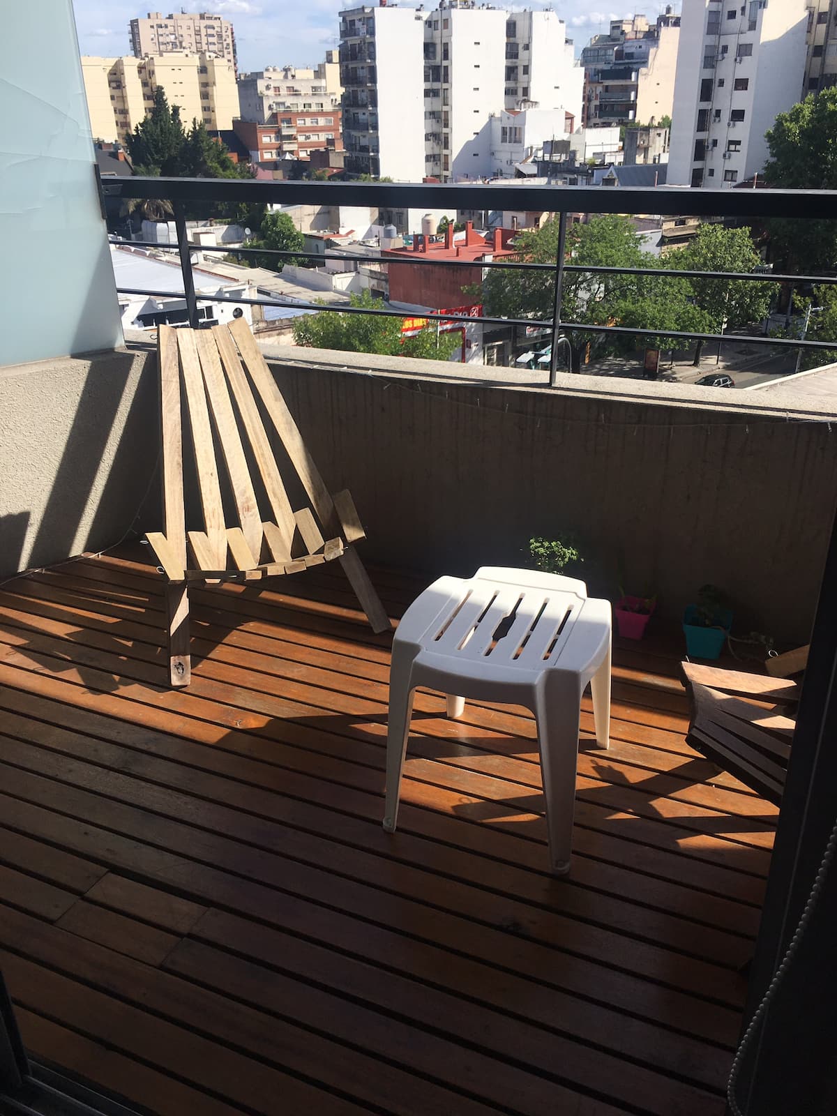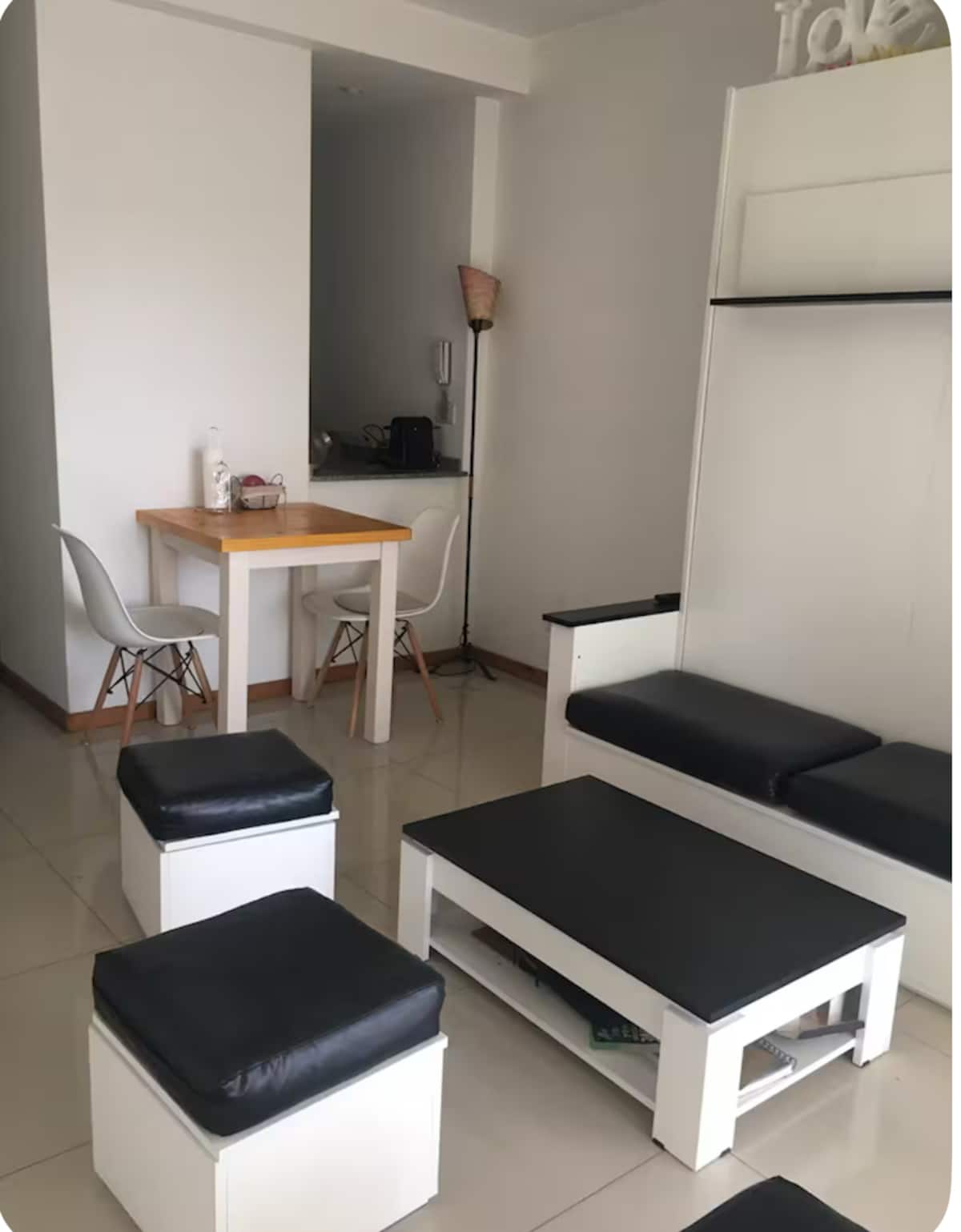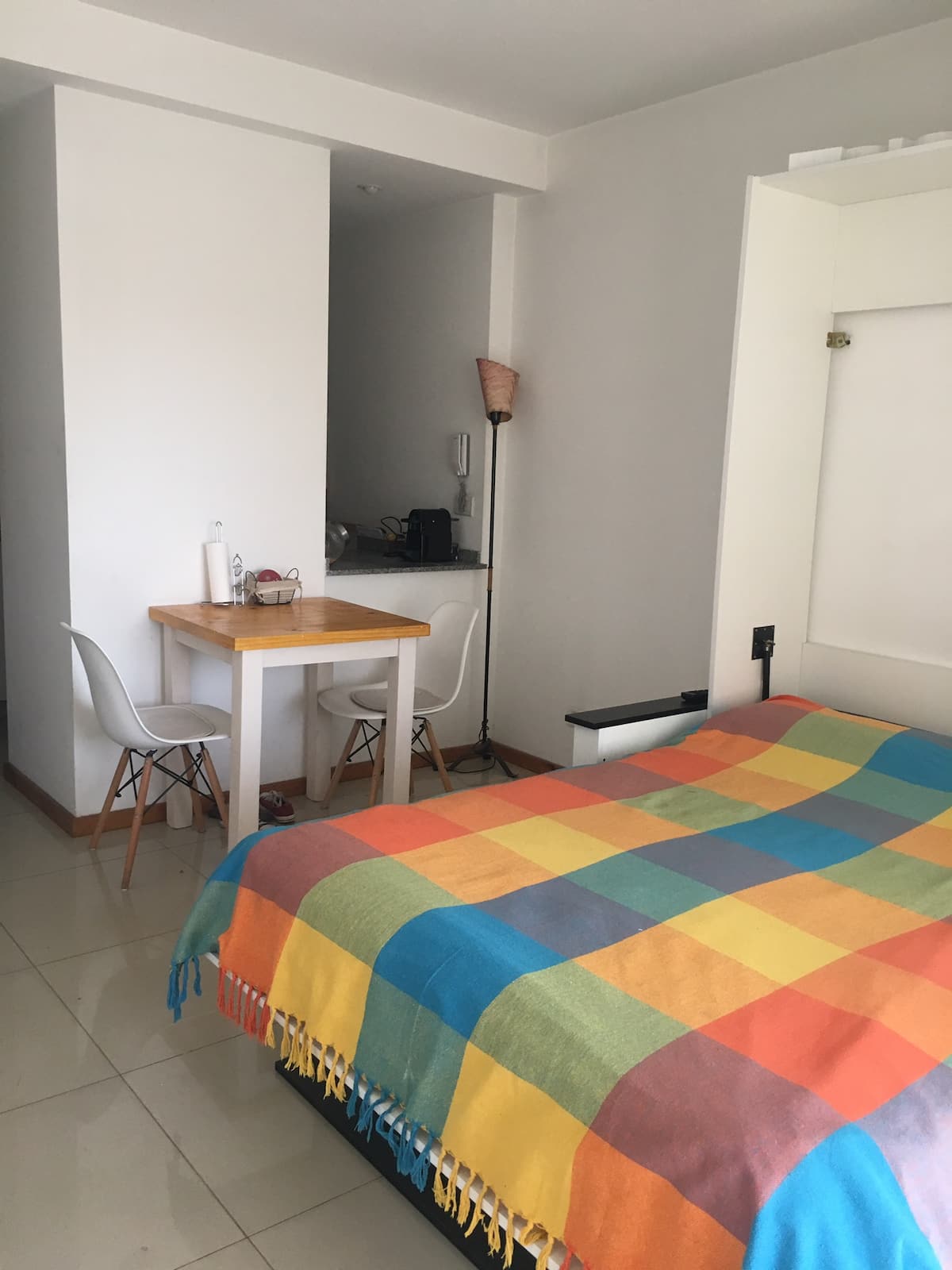 Квартира-студия в Villa Devoto. В помещении установлен двуспальный раскладной диван-кровать, который превращает пространство в гостиную. Площадь не указана, есть большой балкон с настилом. В студии отдельная кухня с холодильником, духовкой, электрической духовкой, электрическим чайником и микроволновой печью, а также кондиционер (холод/тепло). Предусмотрены Wi‑Fi и телевизор, обеденный стол на 2 места. Минимальный срок бронирования — 4 ночи. Транспорт: в 1 квартале от станции Subte Línea B, Inca