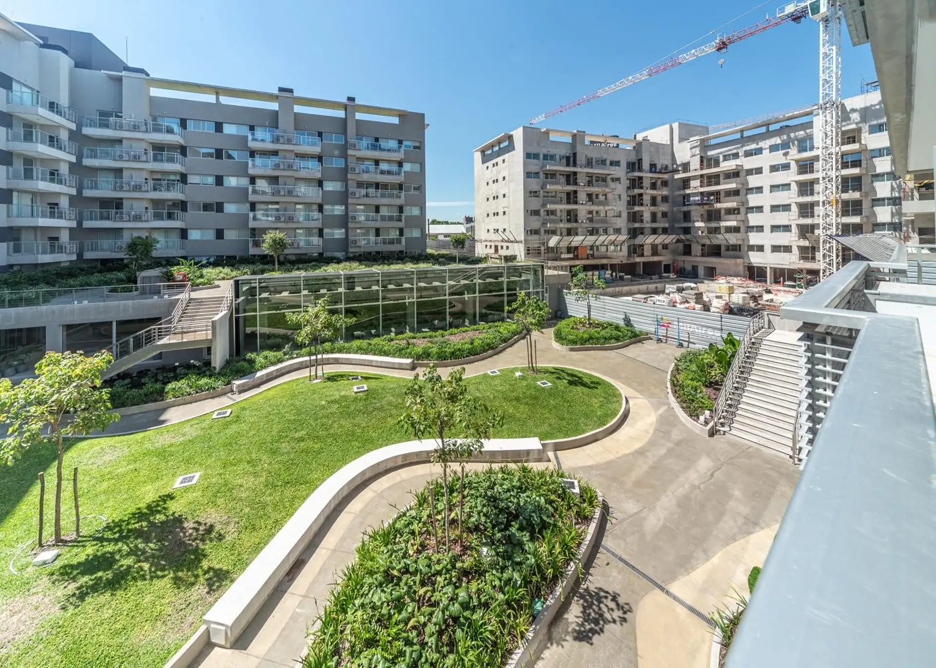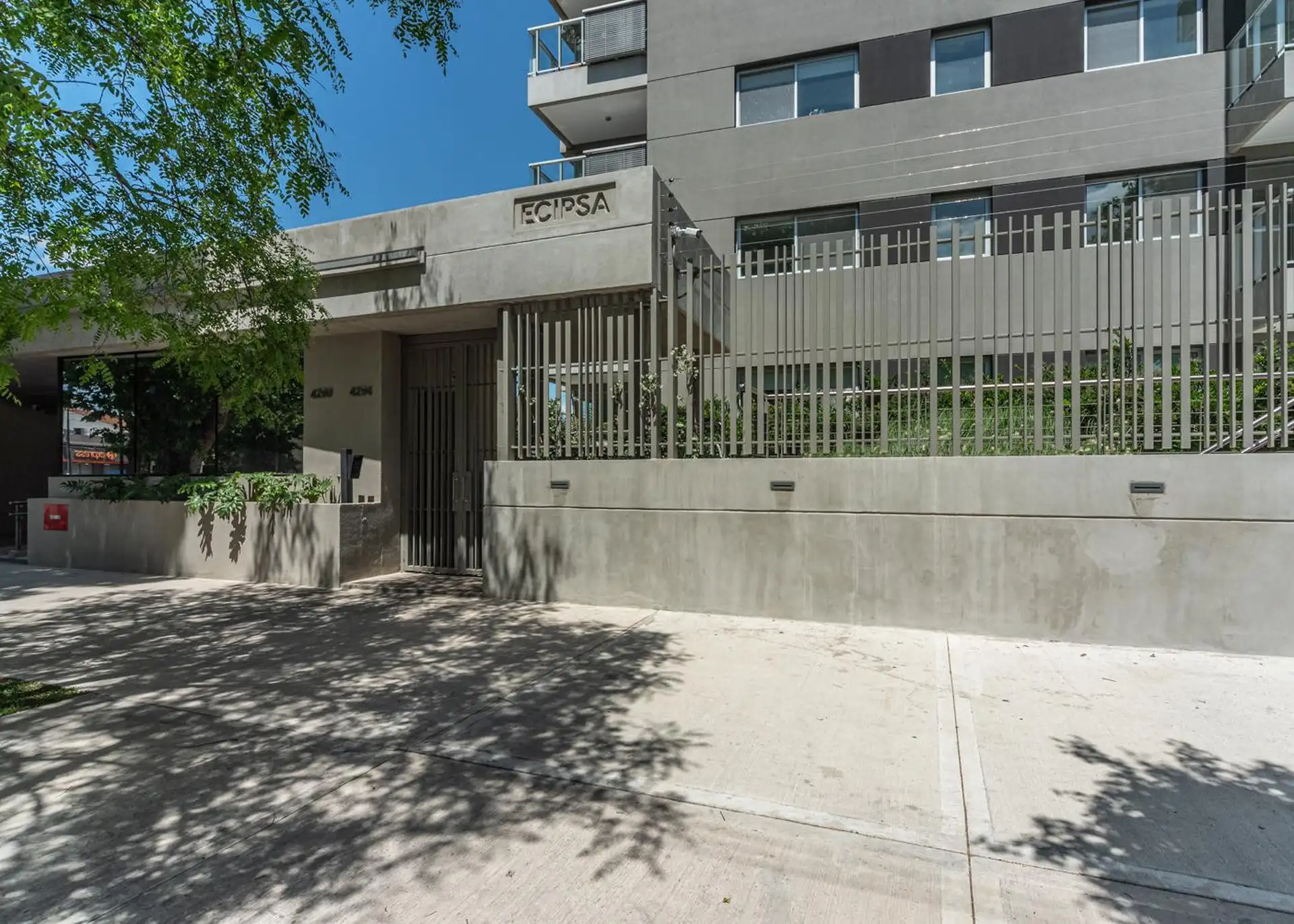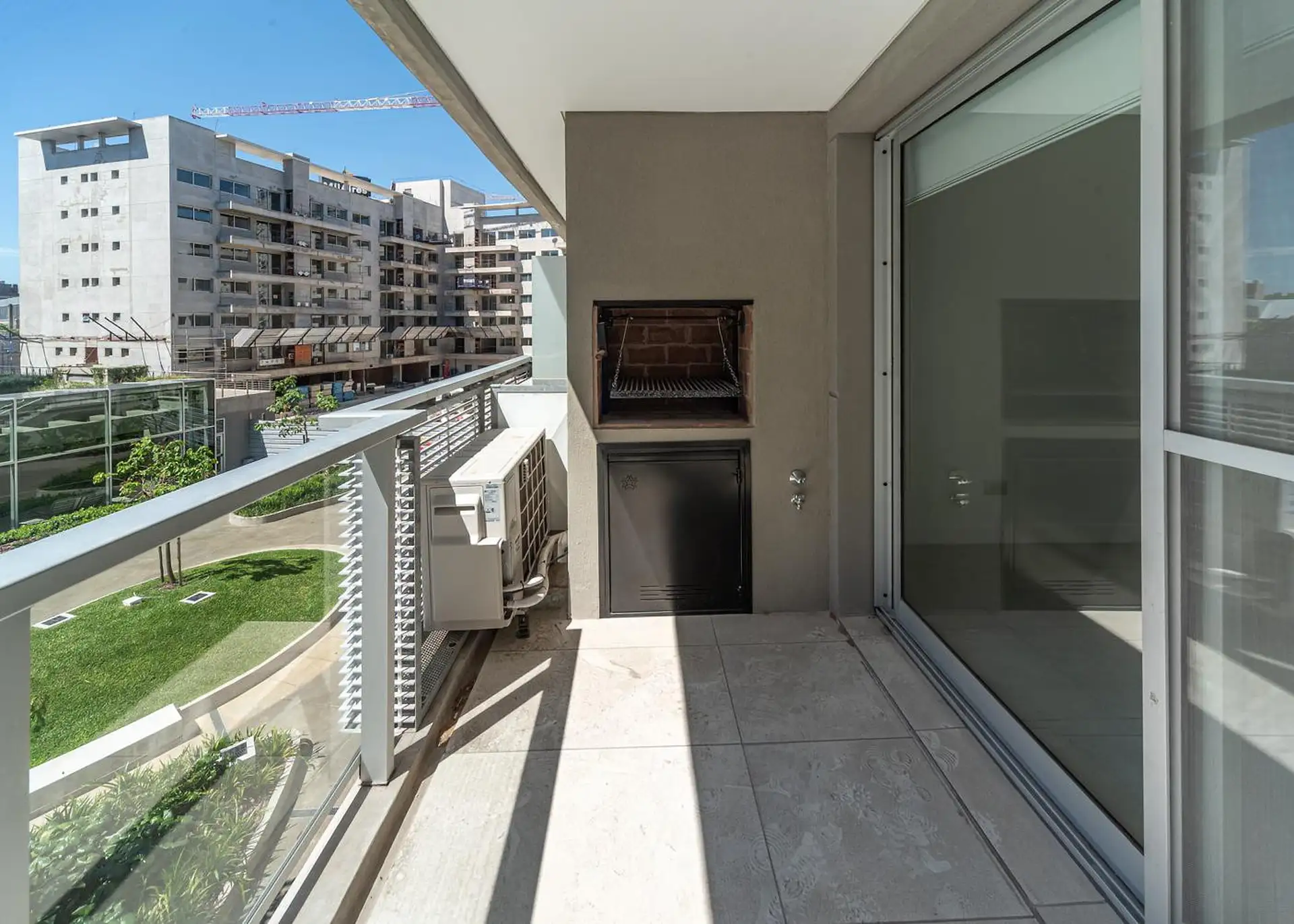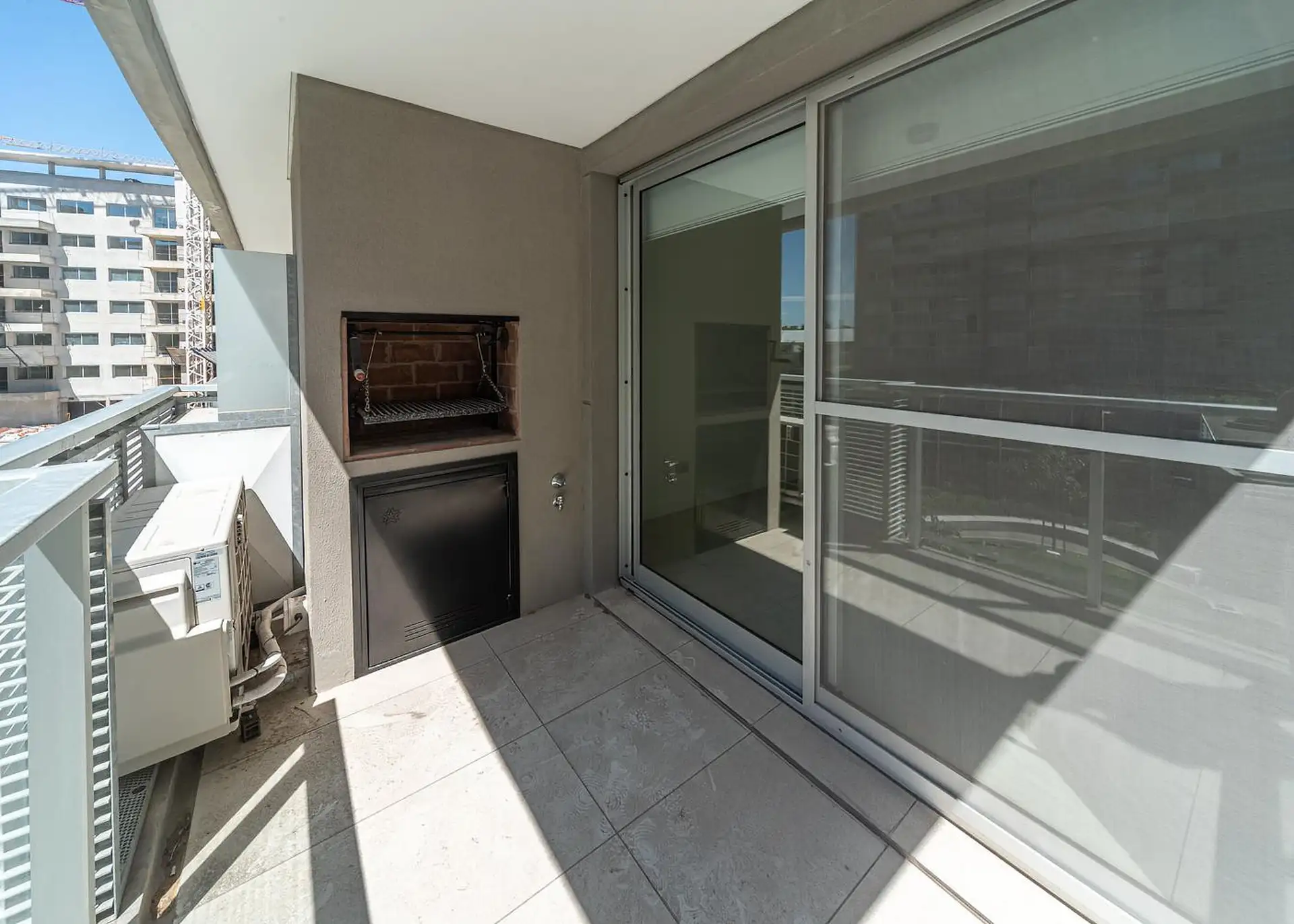 Квартира в Villa Devoto, 2 ambientes (1 спальня) в здании Edificio Lapacho, 1-й этаж, окна на восток, вид во внутренний двор квартала. Площадь в объявлении не указана. Балкон-терраса с зоной гриля, 1 полностью оборудованная ванная комната. Кондиционер в обоих помещениях; установлены шторы screen и blackout. Кухня с интеграцией, заявлены отделочные работы и возможность немедленного заселения. В комплексе: открытые и подогреваемые бассейны, тренажёрный зал, spa, сауна, coworking, общая гостиная дл