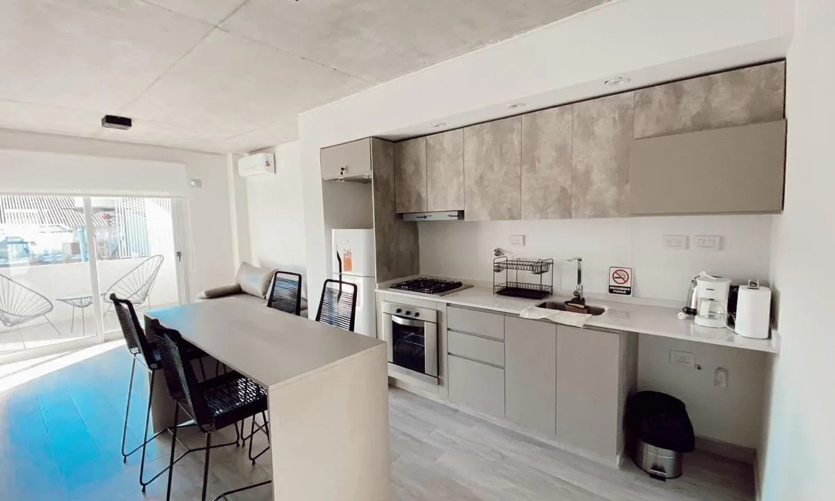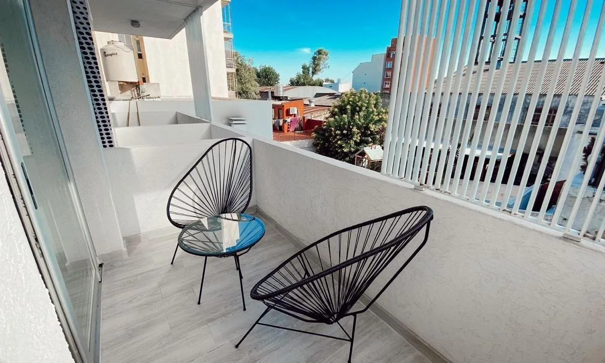 Квартира 2 ambientes в Villa Devoto, 4-й этаж, окна во двор (contrafrente). Кухня объединена с гостиной и выходом на балкон. Есть полноценная ванная, спальня, собственная терраса и зона гриля. Сдаётся с мебелью или без мебели; парковочное место возможно (cochera opcional). Дом расположен на Calle Desaguadero, вблизи Shopping de Devoto и в 2 кварталах от Av. Beiro.