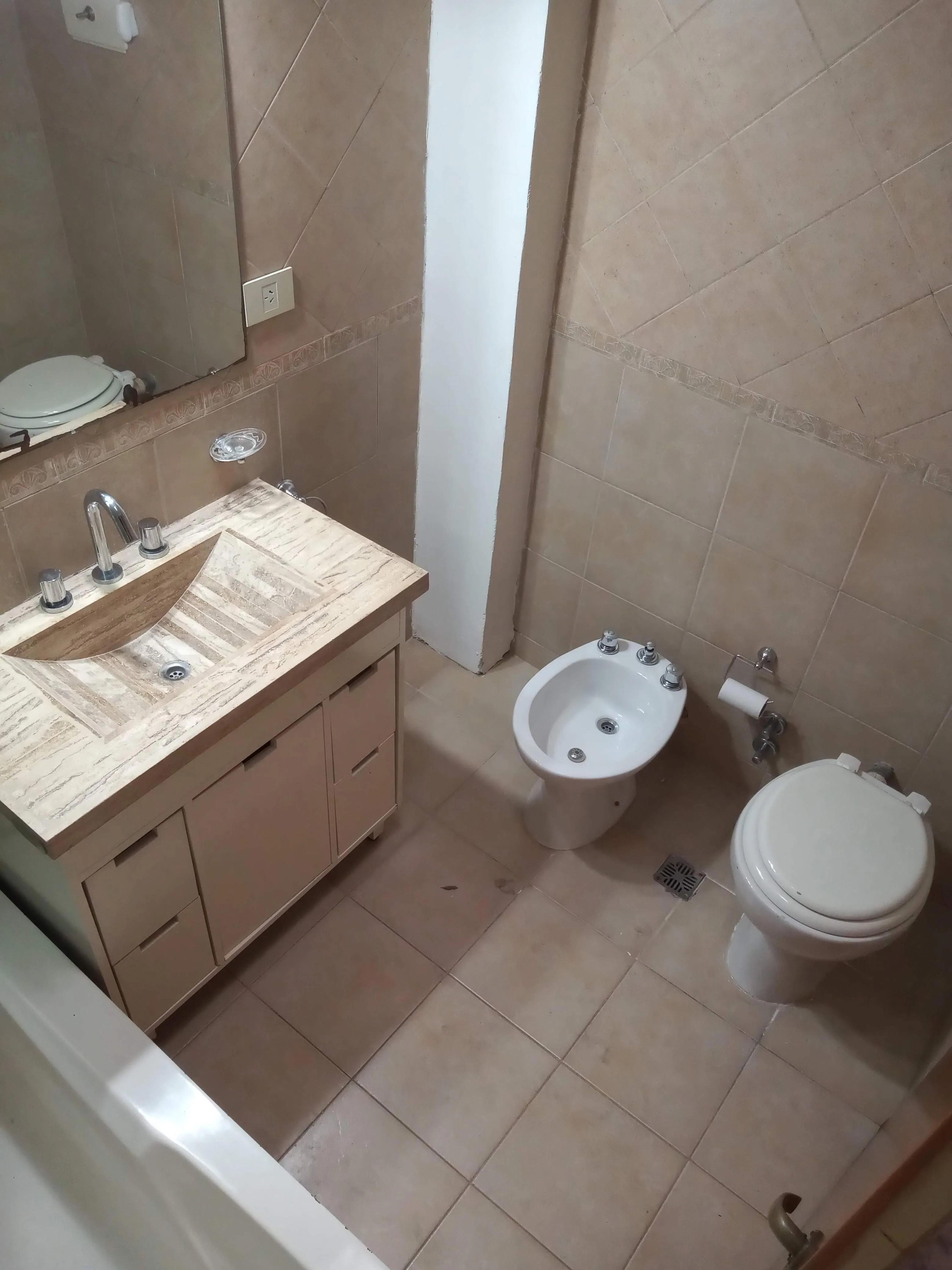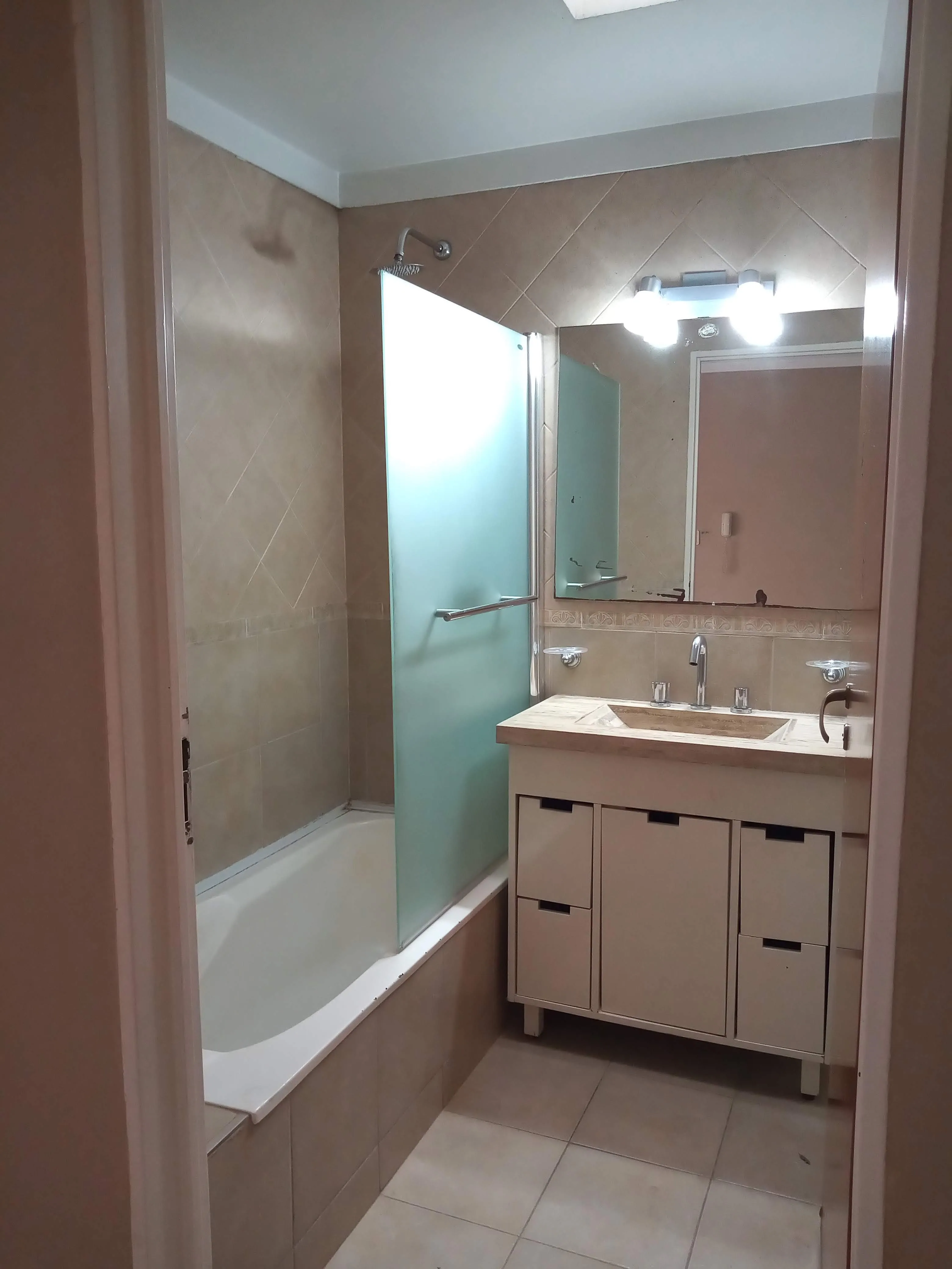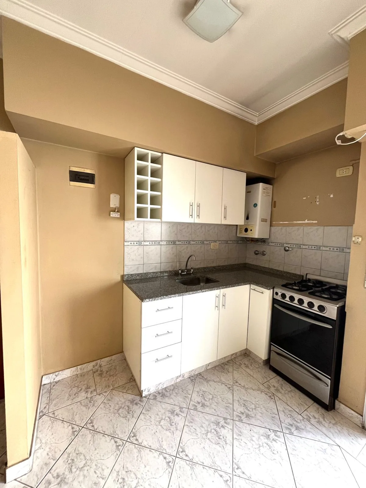 Квартира в Villa Luro, 2 комнаты, 1 спальня, с боковым балконом. Расположена на первом этаже по лестнице. При входе — гостиная-столовая, встроенная кухня с навесными шкафчиками и нижним ящиком, есть выход к прачечной. Спальня с шкафом, отдельная ванная комната. Кондиционер есть в обоих помещениях. Сообщается о низких коммунальных платежах здания. Без домашних животных; требуется подтверждение доходов и залог-страховка аренды (caución). Арендная плата корректируется раз в квартал по IPC.