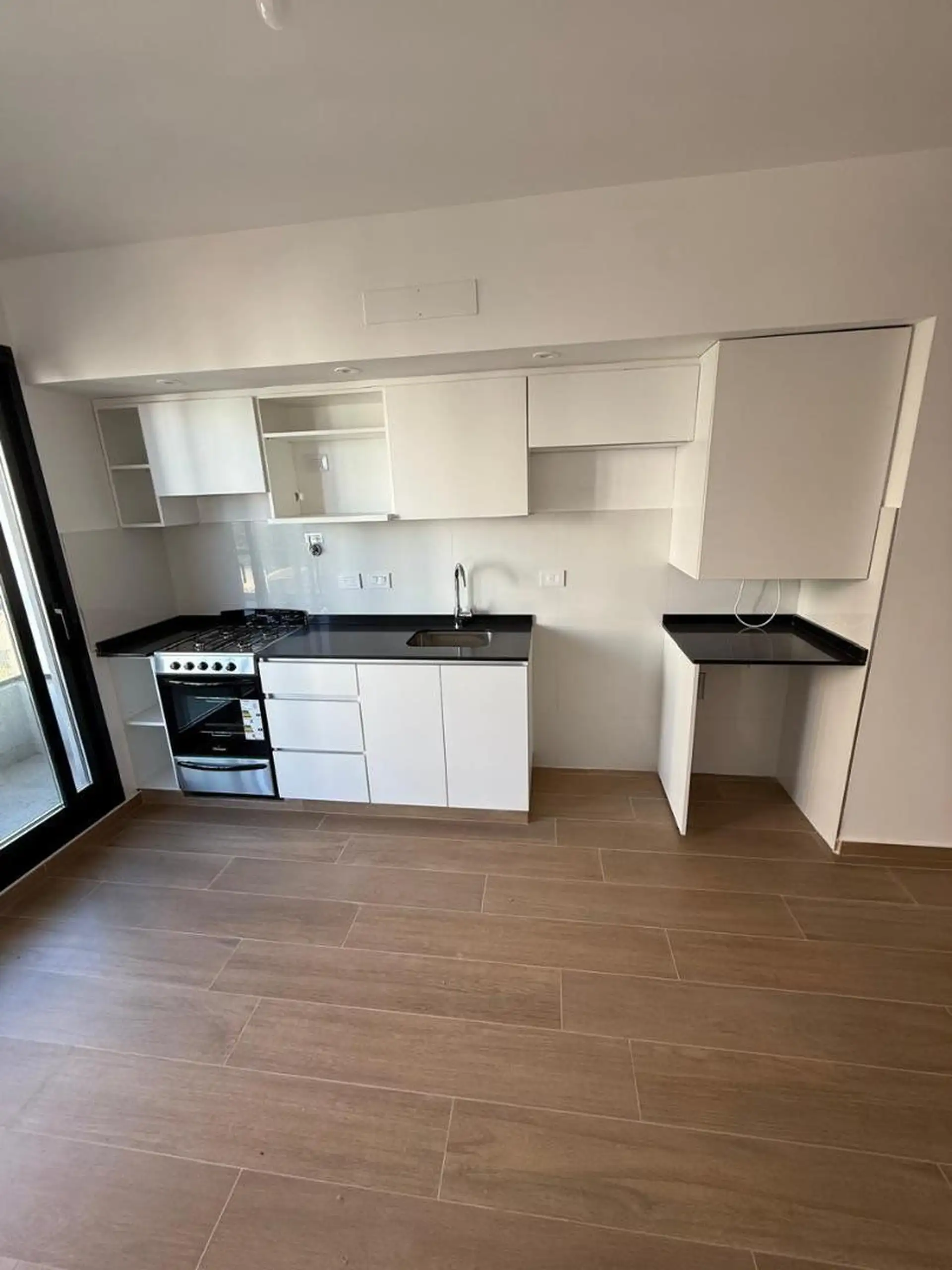 Квартира-студия площадью не указана, новая (никто не жил), с отдельной ванной комнатой. Кухня встроенная, с мебелью верхнего и нижнего яруса, чёрным мрамором «Brasil», газовой плитой; установлены стеклопакеты DVH, алюминиевые оконные конструкции. Предусмотрены установки для кондиционеров, установлен обогреватель с тягой «tiro balanceado» и водонагреватель (termotanque). В описании указаны низкие коммунальные платежи здания.