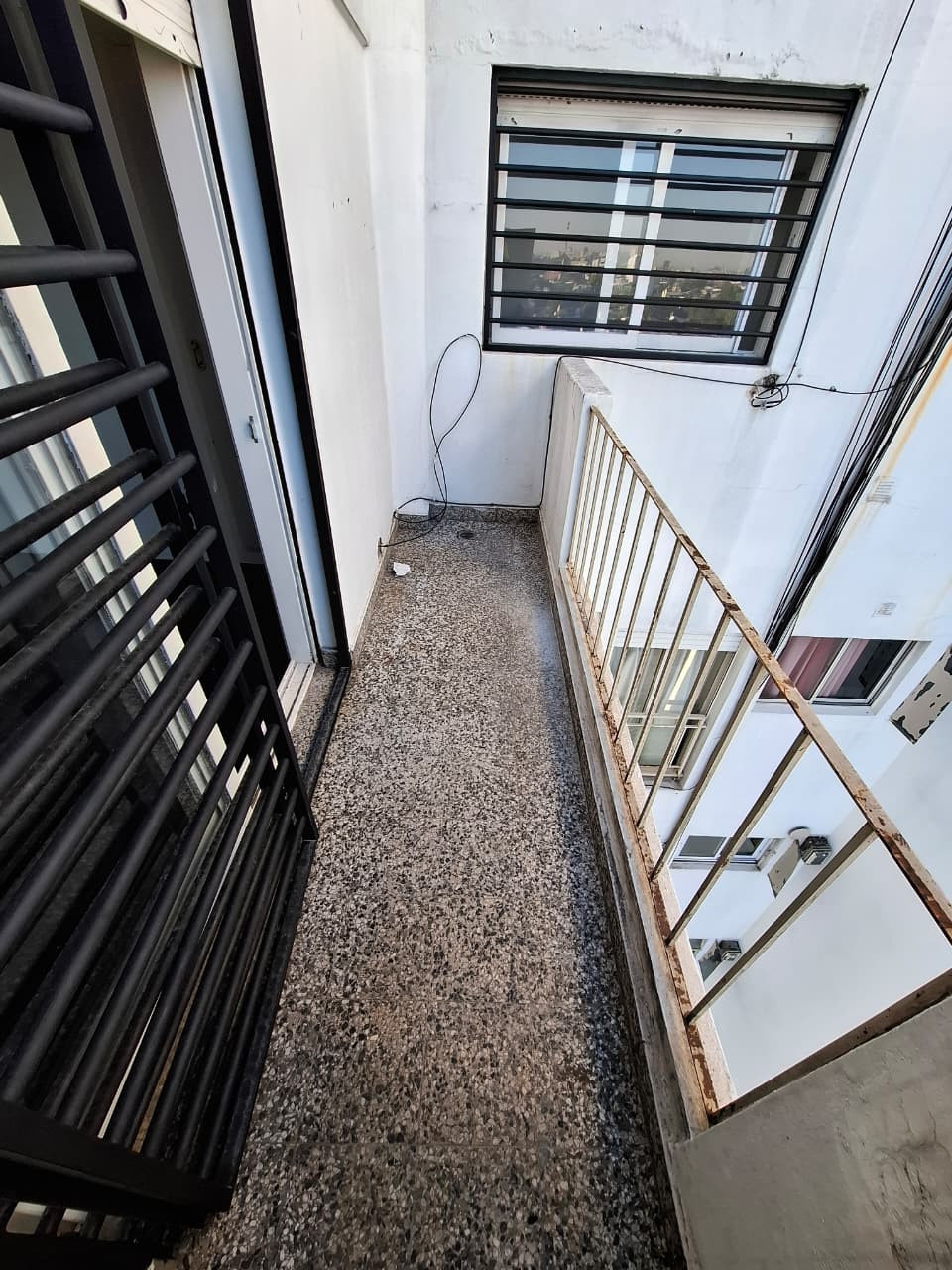 Квартира из двух комнат площадью 48 m² общих, на 8-м этаже, окна во двор (contrafrente). В квартире гостиная-столовая, отдельная кухня с нижними шкафами, навесным шкафом, кухонной плитой, бойлером (termotanque), водонагревателем Spar и подключением для стиральной машины. Полная ванная с ванной, спальня с встроенным шкафом и выходом на балкон, есть протяжённый балкон с видом. На крыше предусмотрена общая терраса с зоной для сушки белья (terrazа comun de colgado). Коммунальные платежи здания в объ