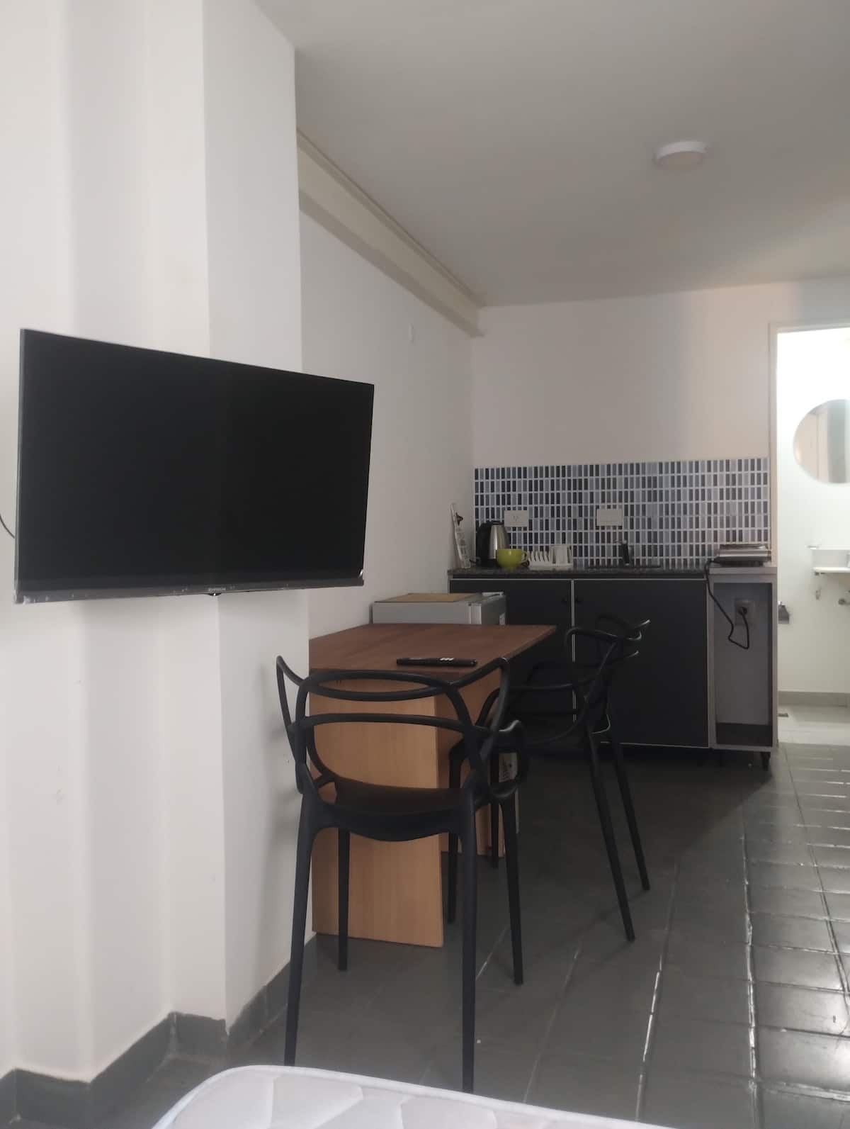 Квартира-студия в Villa Ortúzar, в нескольких метрах от станции Subte B Los Incas. Горячая вода в ванной и на кухне доступна 24 часа в сутки. Есть полностью оборудованная кухня и ванная, холодильник под новой столешницей. В студии стоят стол и два стула, книжный стеллаж, двухместный раскладной матрас и светильник; установлены шторы black-out и базовый набор кухонной утвари.