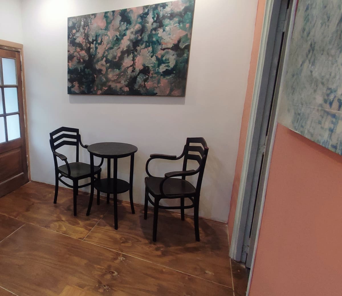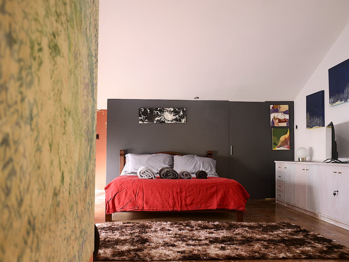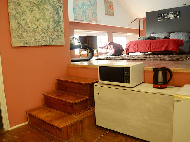 Квартира-студия на 1-м этаже, вход по лестнице, на отдельных от остального здания условиях. Внутри есть собственная ванная и обеденная зона. На первом этаже здания работают мастерские по искусству и дизайну.