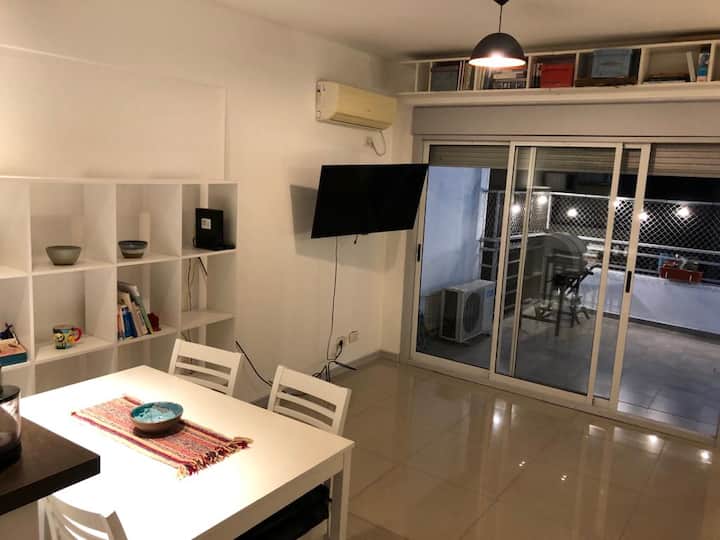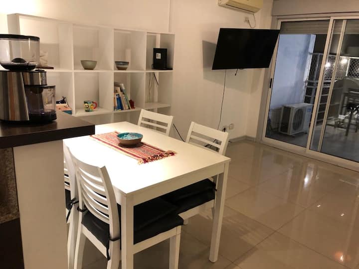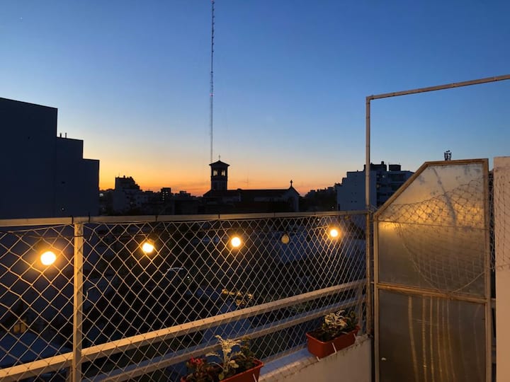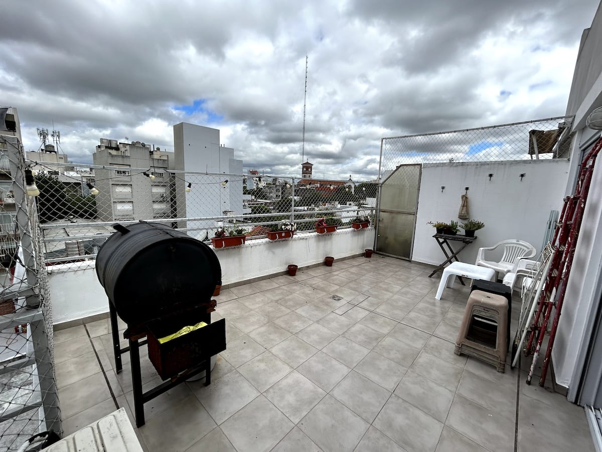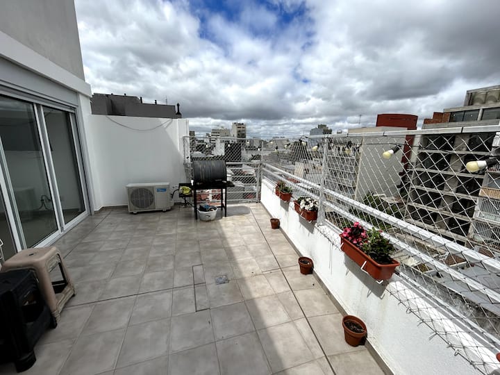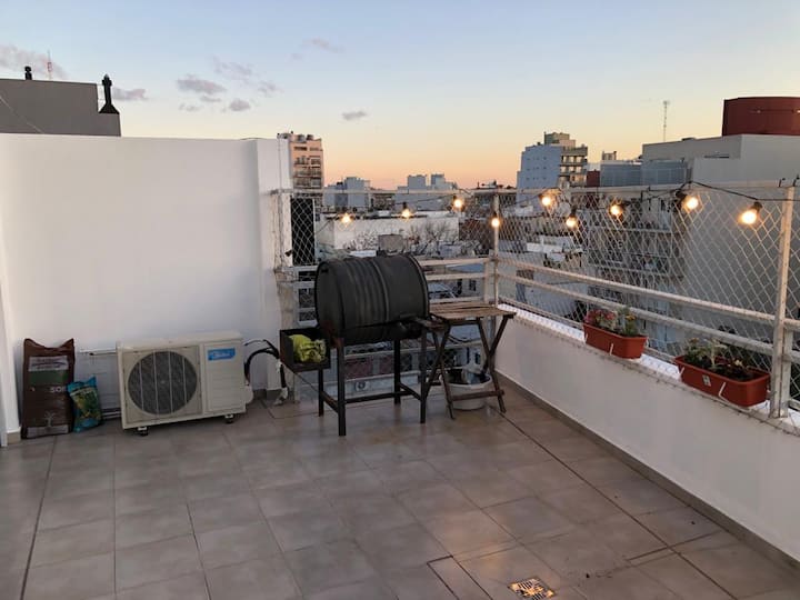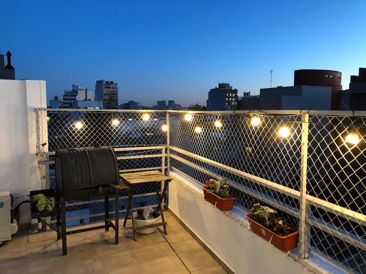 Квартира в Villa Ortúzar с выходом на террасу. В описании отмечаются тишина и открытое планировочное решение. Расстояние до подземки Línea B: 1 квартал. Терраса используется для отдыха и приготовления блюд на зоне гриля.