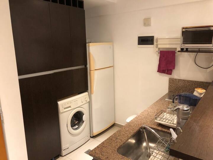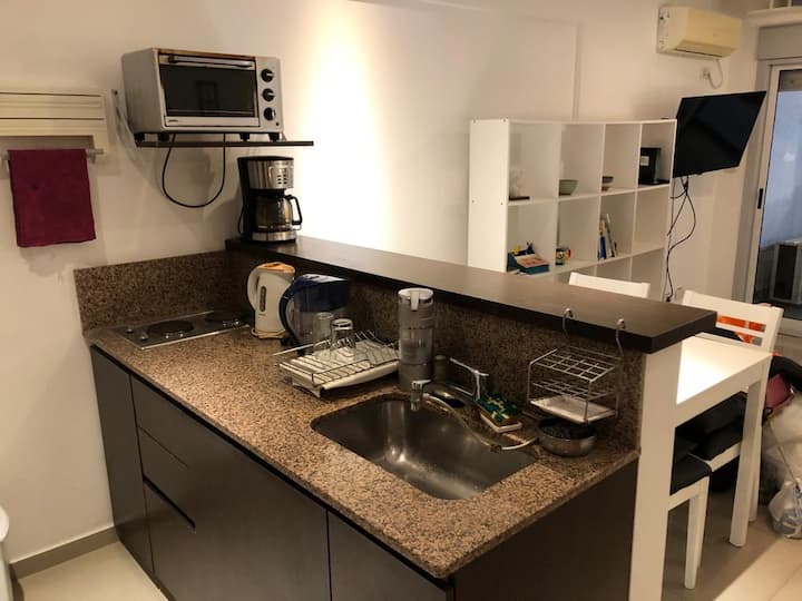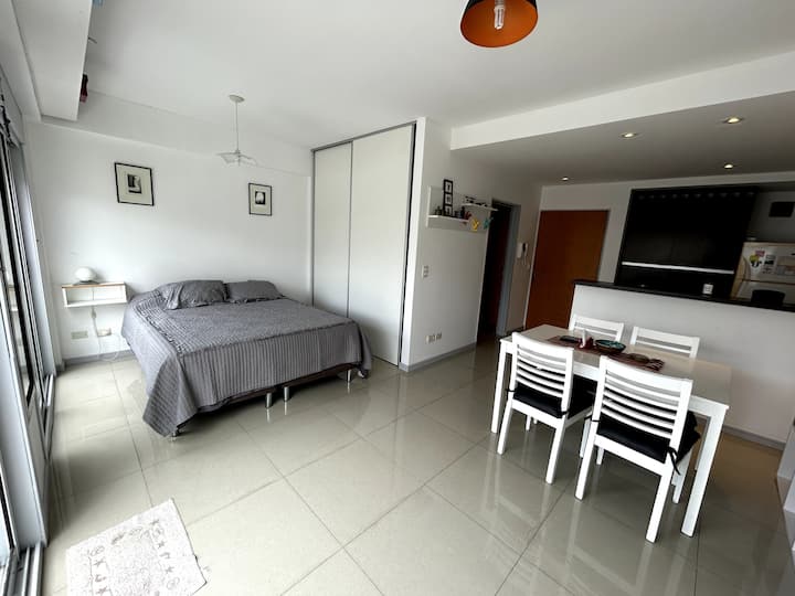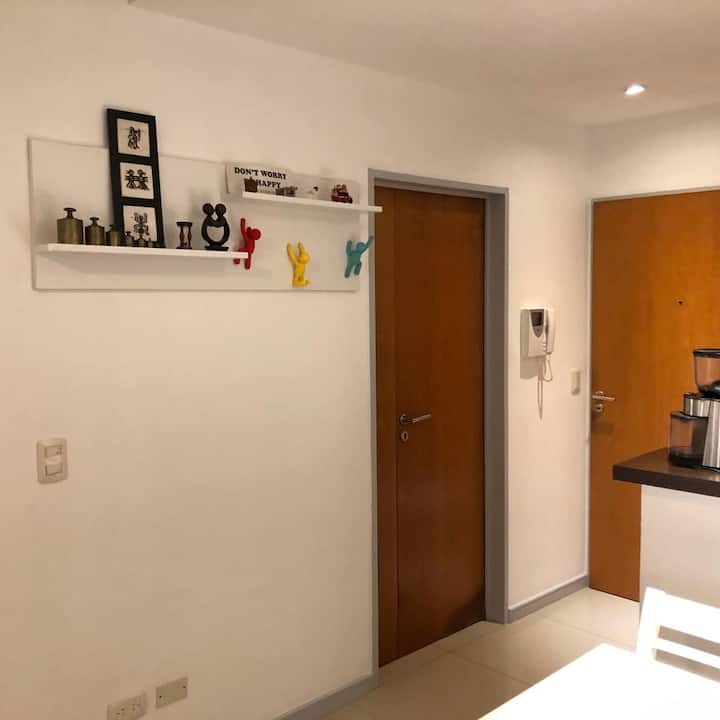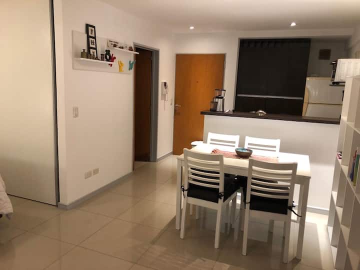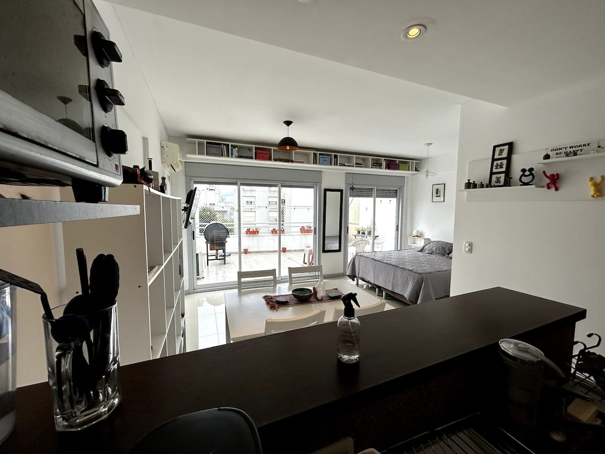 Квартира в Villa Ortúzar с выходом на террасу. В описании отмечаются тишина и открытое планировочное решение. Расстояние до подземки Línea B: 1 квартал. Терраса используется для отдыха и приготовления блюд на зоне гриля.