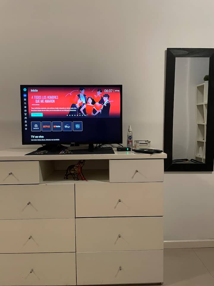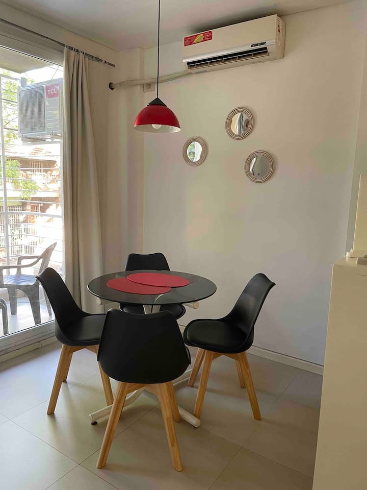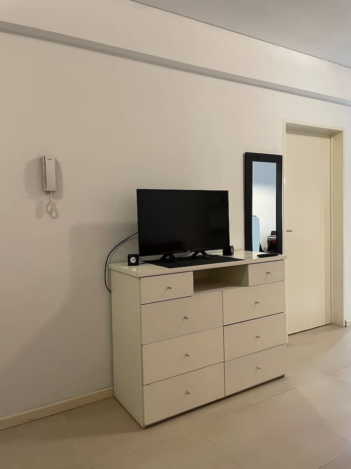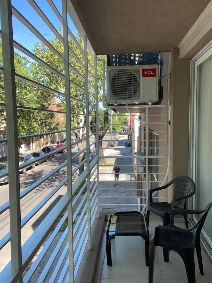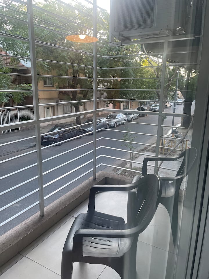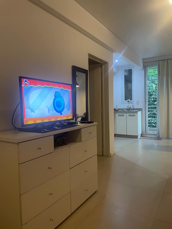 Квартира-студия площадью не указана в Villa Urquiza, 3-этажное здание, окна на улицу, восточная ориентация. Есть балкон для двух человек, с кухней с 2 конфорками и духовкой. В кухне указаны холодильник с морозильной камерой, кофеварка, тостер, электрочайник; на балконе — место для стиральной машины и сушилка для белья. В ванной комнате предусмотрены шампунь, кондиционер и фен. Сообщается о Wi‑Fi, TV Flow, радио, центральном горячем водоснабжении в здании и общей террасе с зоной гриля.