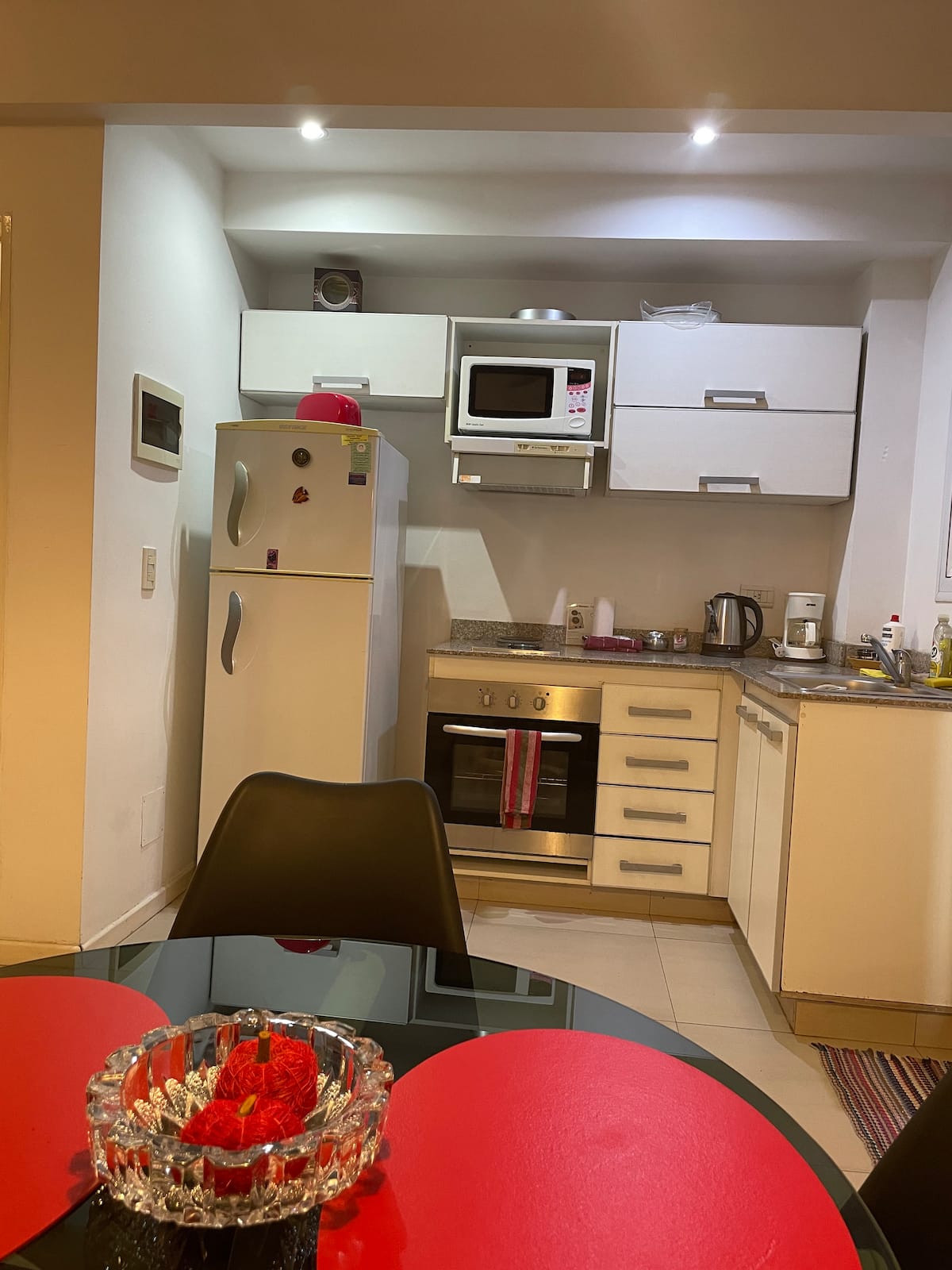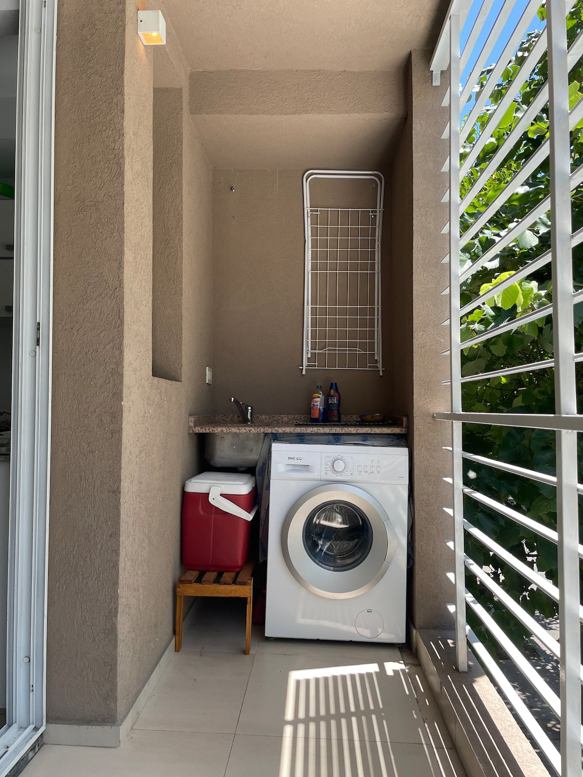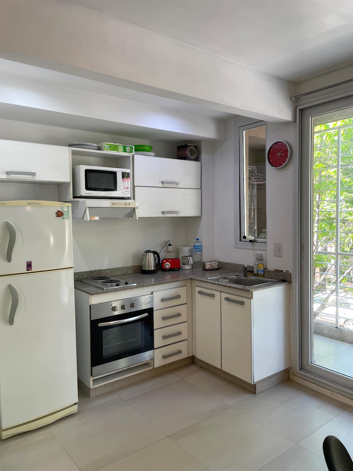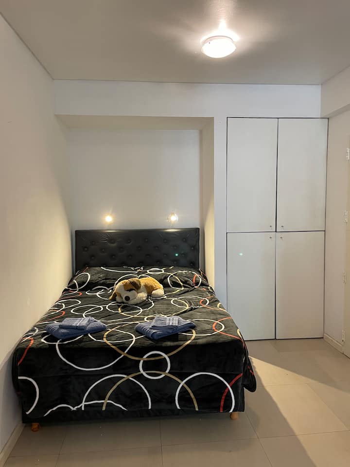 Квартира-студия площадью не указана в Villa Urquiza, 3-этажное здание, окна на улицу, восточная ориентация. Есть балкон для двух человек, с кухней с 2 конфорками и духовкой. В кухне указаны холодильник с морозильной камерой, кофеварка, тостер, электрочайник; на балконе — место для стиральной машины и сушилка для белья. В ванной комнате предусмотрены шампунь, кондиционер и фен. Сообщается о Wi‑Fi, TV Flow, радио, центральном горячем водоснабжении в здании и общей террасе с зоной гриля.