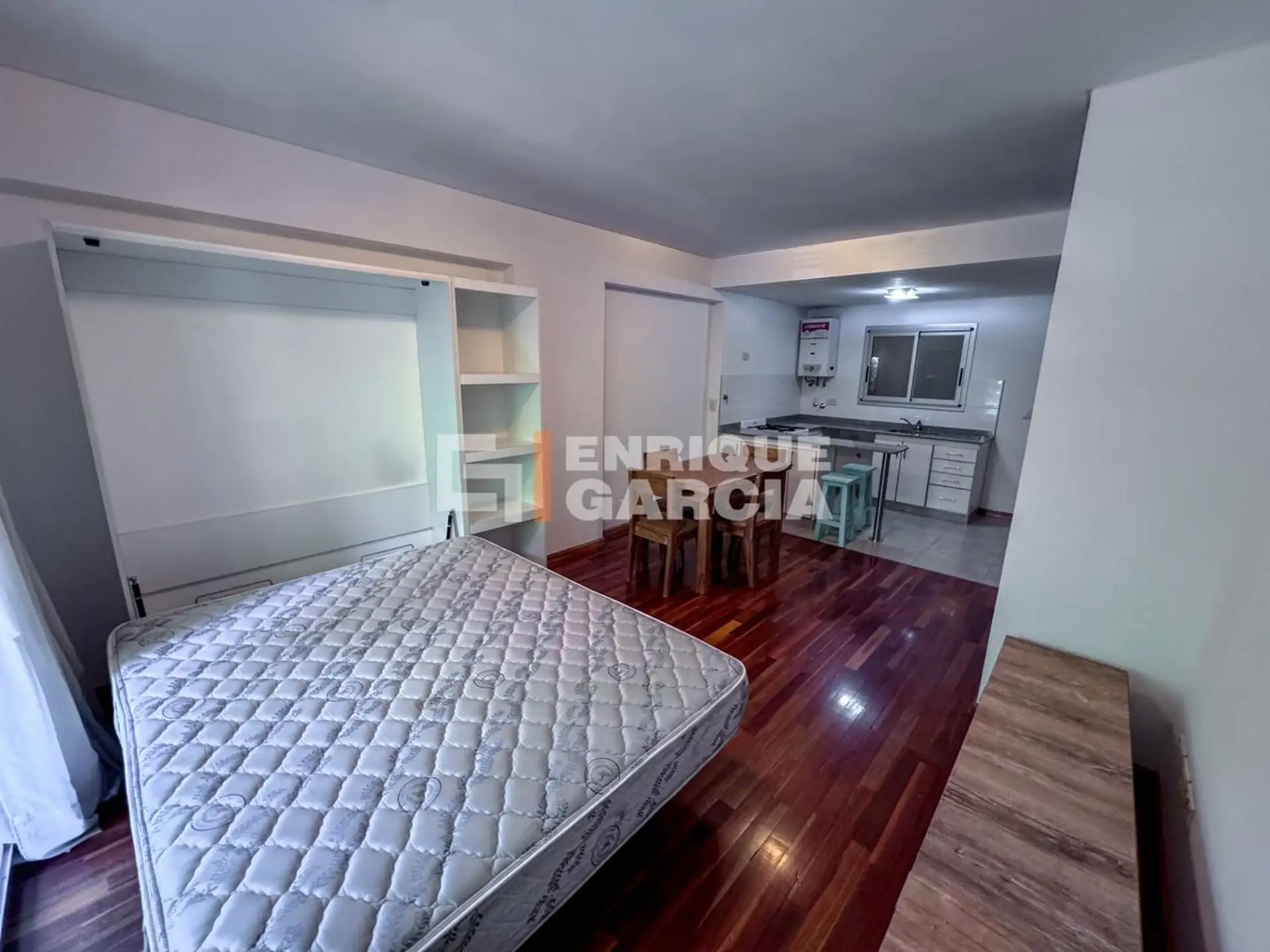 Квартира-студия в Villa Urquiza, окна на улицу, с балконом. Помещение с индивидуальными счетчиками, подходит под профессиональное использование. Полы из паркета, установлены газовый водонагреватель (calefón) и газовая плита, отопление через систему с тягой. Есть встроенный шкаф, встроенная прачечная. Квартира с мебелью: раскладная кровать, деревянный стол на 4 стула, тумба под телевизор, банкетки для барной стойки и декоративные картины. Размещение с домашними животными не предусмотрено. Коммуна