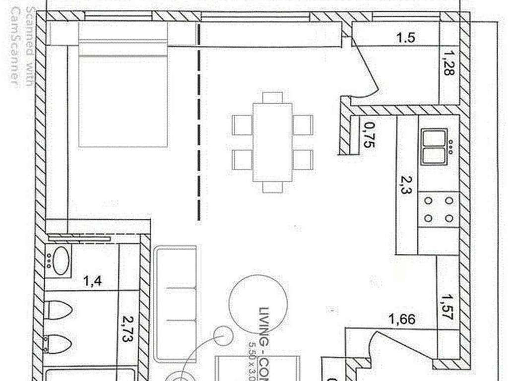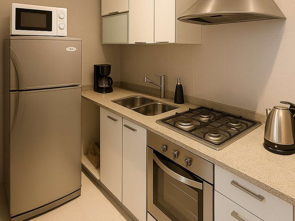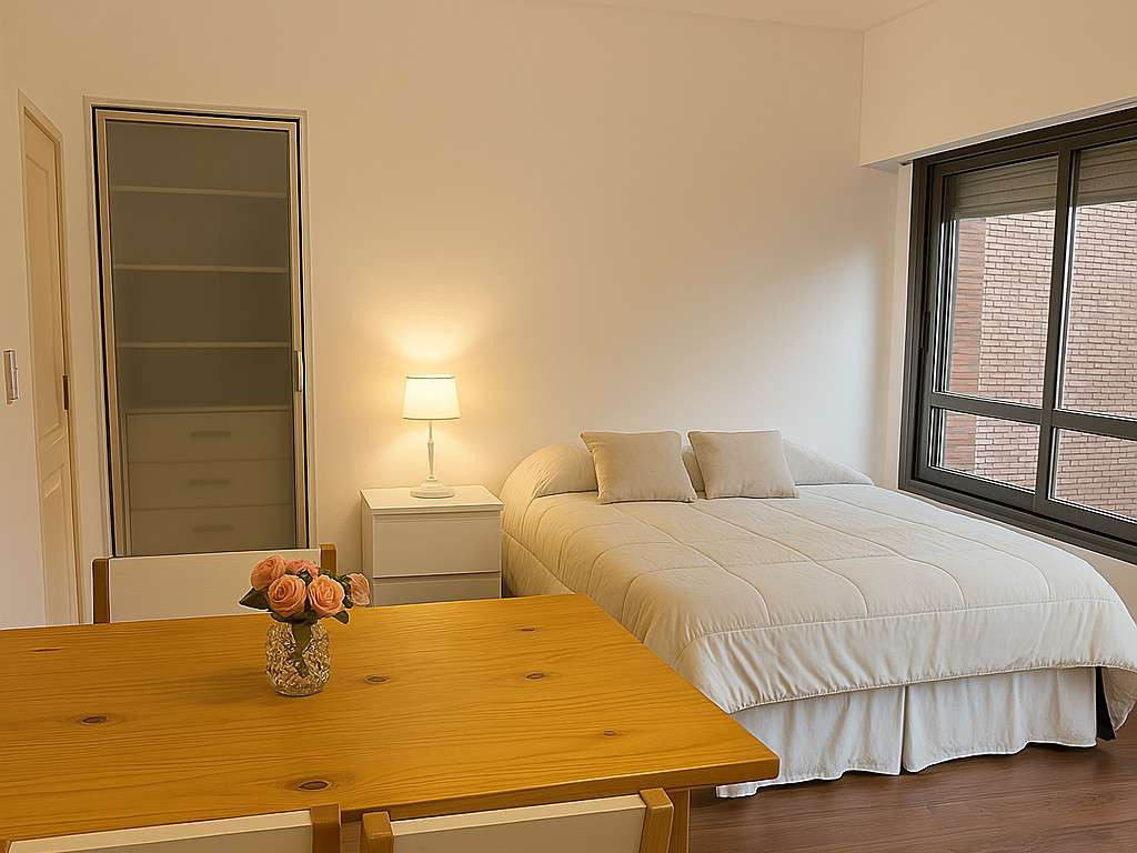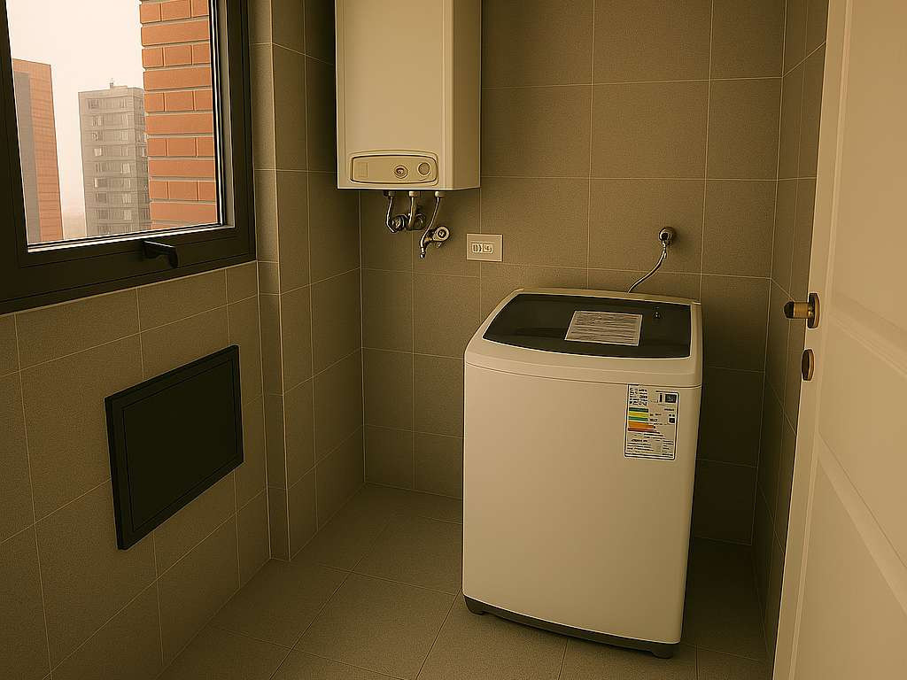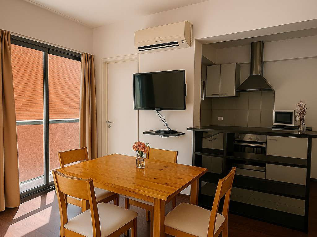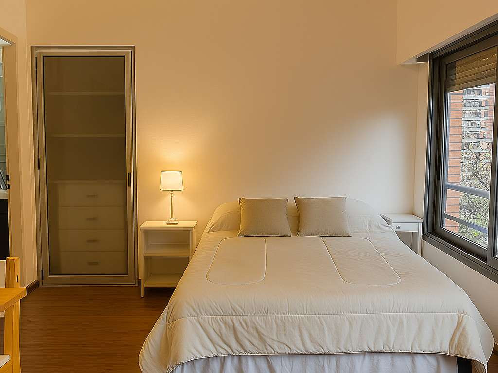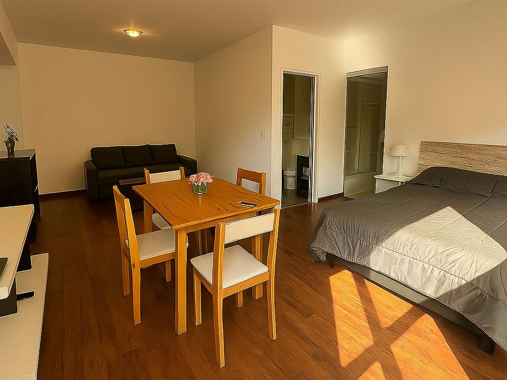 Квартира-студия в Villa Urquiza, план с возможностью разделения на 2 комнаты. Радиаторное отопление и двухконтурный газовый котёл. Ванная комната с ванной, душевой перегородкой и арматурой Ferrum. Кухня интегрирована: тумбы, навесные шкафы, газовая варочная панель Longvie, отдельная духовка и вытяжка. Есть французский балкон и отдельная прачечная. В здании 14 этажей, 6 квартир на этаже, есть SUM на последнем этаже. Коммунальные платежи указаны как «низкие».
