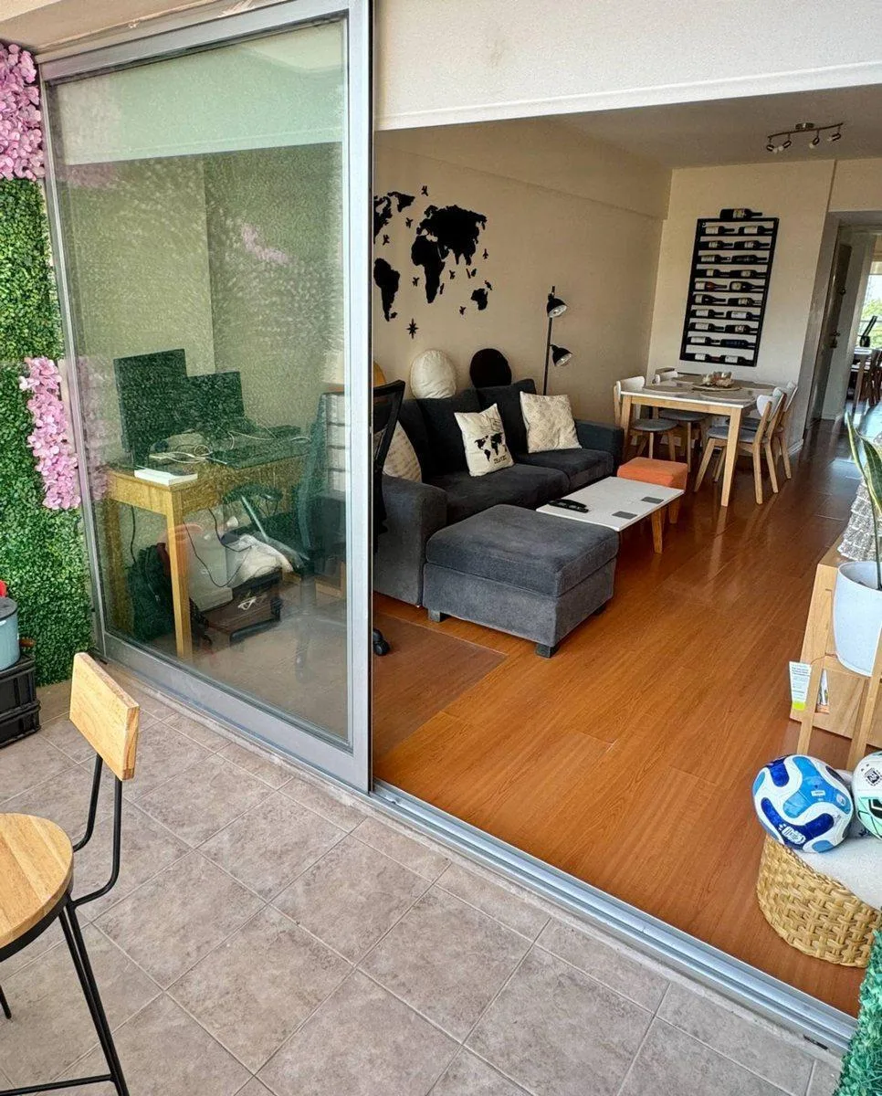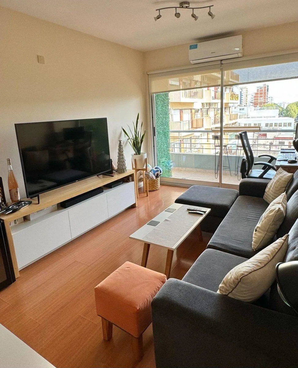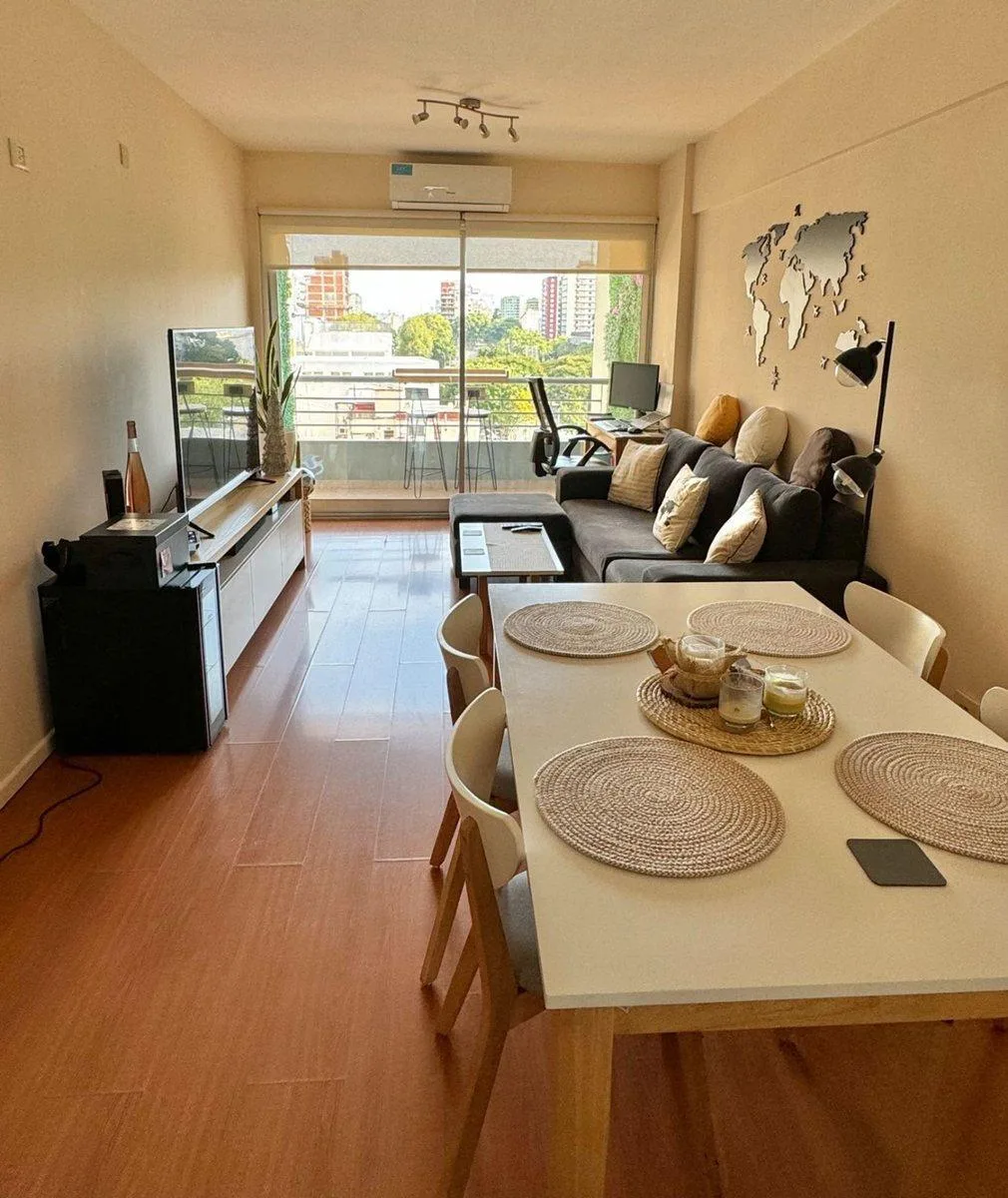 Квартира в формате 2 ambientes площадью 54,38 m² (49,35 m² крытых и 5 m² полукрытых балкона) находится на 6-м этаже, окна во двор (contra frente) с открытым видом. Окна на западную сторону. Квартира полностью меблирована; в гостиной-столовой кондиционер F/C. Спальня с балконом, встроенным шкафом (placar) и кондиционером F/C; отдельная кухня с зоной для стирки (lavadero) и полноценной ванной комнатой с вентиляцией. Отопление — радиаторная плита (losa radiante) и двухконтурный котёл. В доме 15 лет