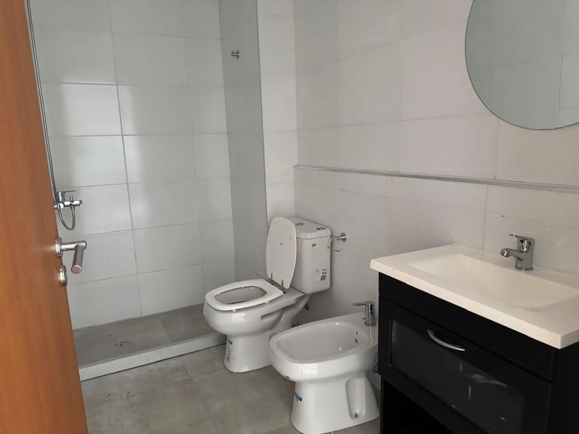 Квартира в новостройке с 3 комнатами на 1-м этаже, окна на улицу, с балконом и патио. Гостиная-столовая в Г-образной планировке, кухня в одном пространстве с гостиной, оборудована духовкой и электрической варочной панелью на 4 конфорки Domec, с верхними шкафами, нижними тумбами и предусмотренным подключением для стиральной машины или посудомоечной машины. В главной спальне встроенный шкаф и вид на полосу озеленения, вторая спальня или кабинет также со встроенным шкафом и выходом на балкон. Ванна