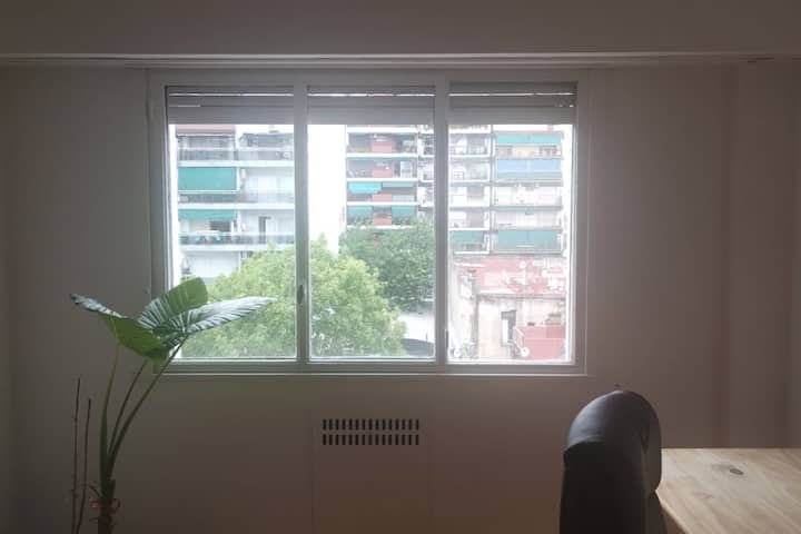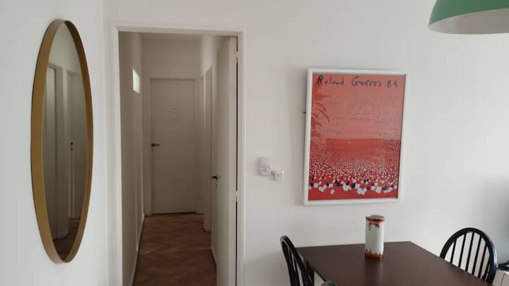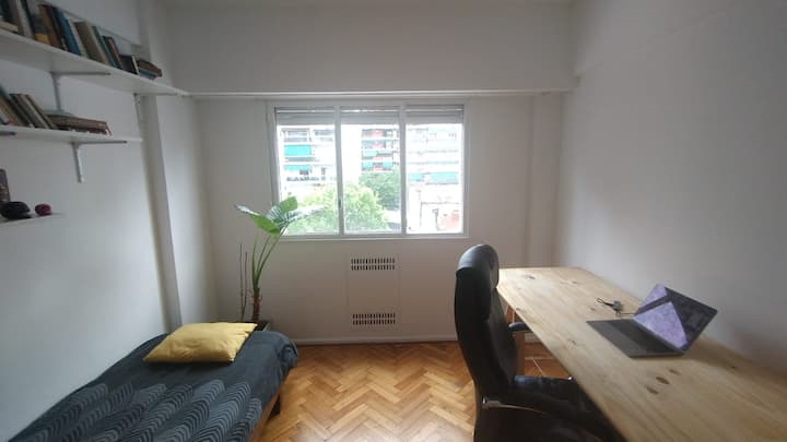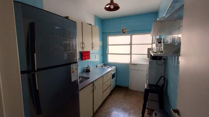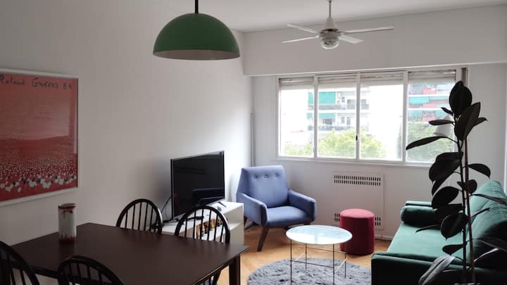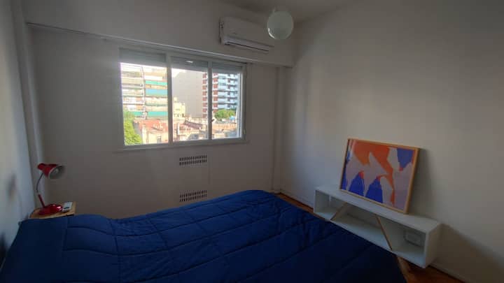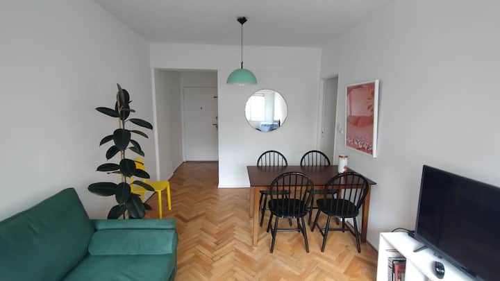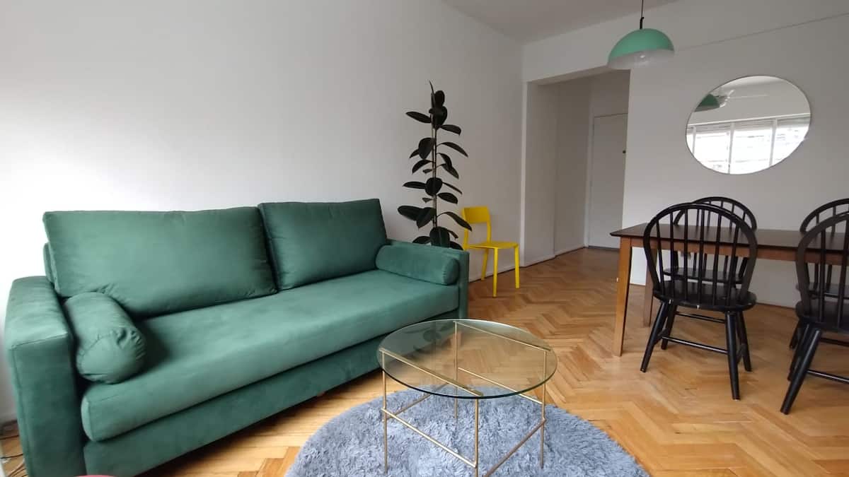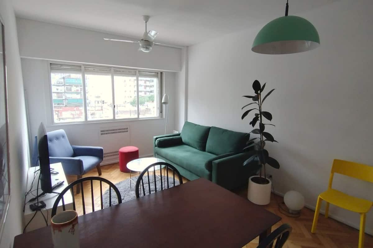 Квартира с 2 спальнями в Almagro. Указана как расположенная в географическом центре города. В описании отмечается близость к метро Línea B, с поездкой за 10 минут до Obelisk, а также 15 минут пешком до Palermo. Рядом упоминаются магазины, зоны гриля и пиццерии, а также несколько кварталов до танго-милонг.