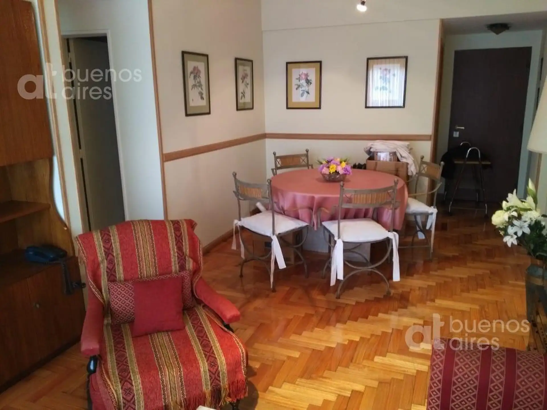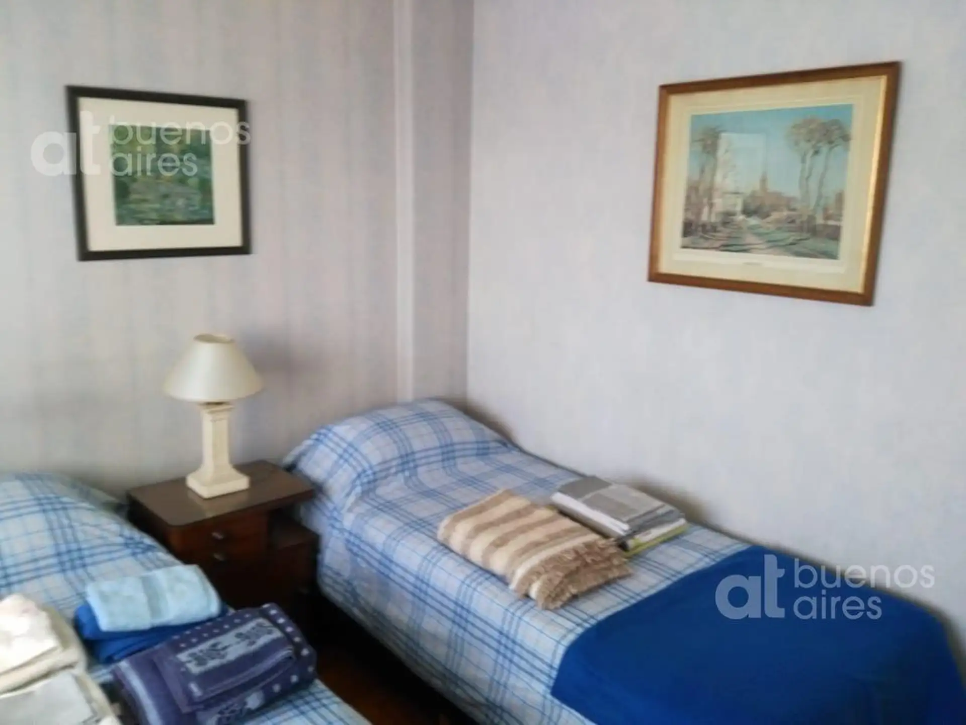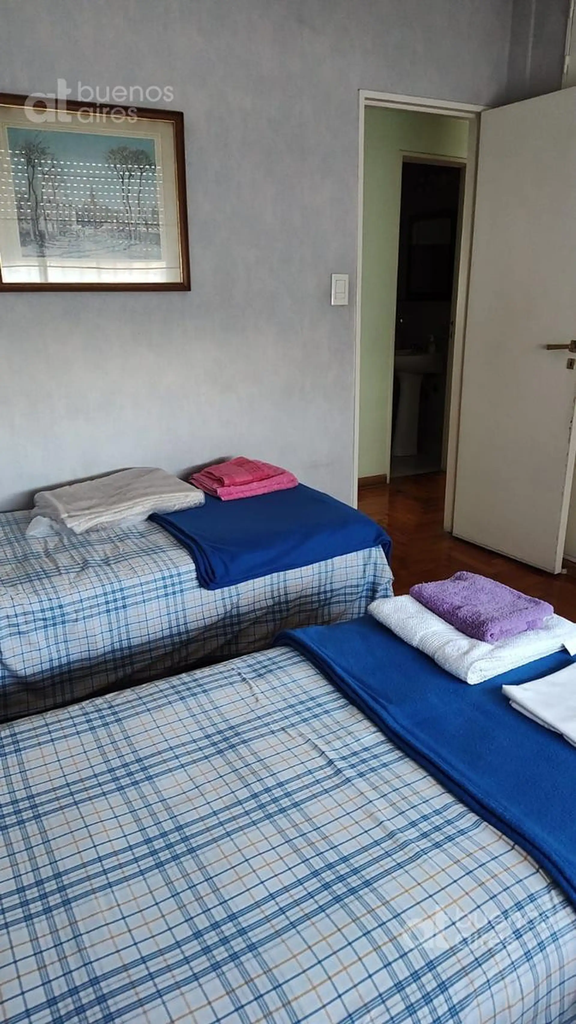 Квартира в Almagro с 2 спальнями, площадью 3 комнаты (3 ambientes). Доступна с 10/05/2026. Жилая зона с обеденным столом и стульями на 4 человека, диван и выход на балкон во фронтальном направлении. Кухня оборудована холодильником с морозильной камерой, газовой духовкой, электрическим чайником и полным комплектом посуды. В главной спальне двуспальная кровать и встроенный шкаф; во второй спальне 2 односпальные кровати, встроенный шкаф и письменный стол. Два санузла. Коммунальные платежи здания вк