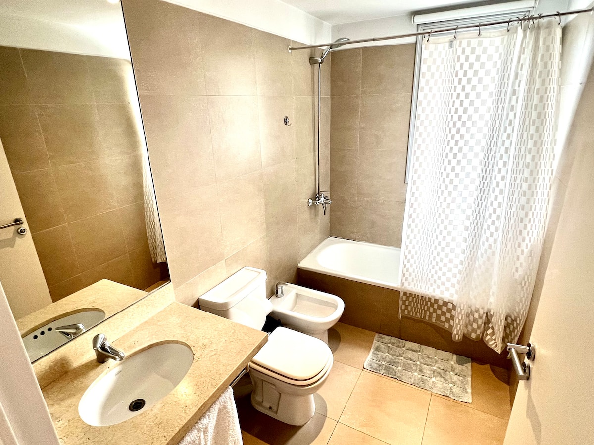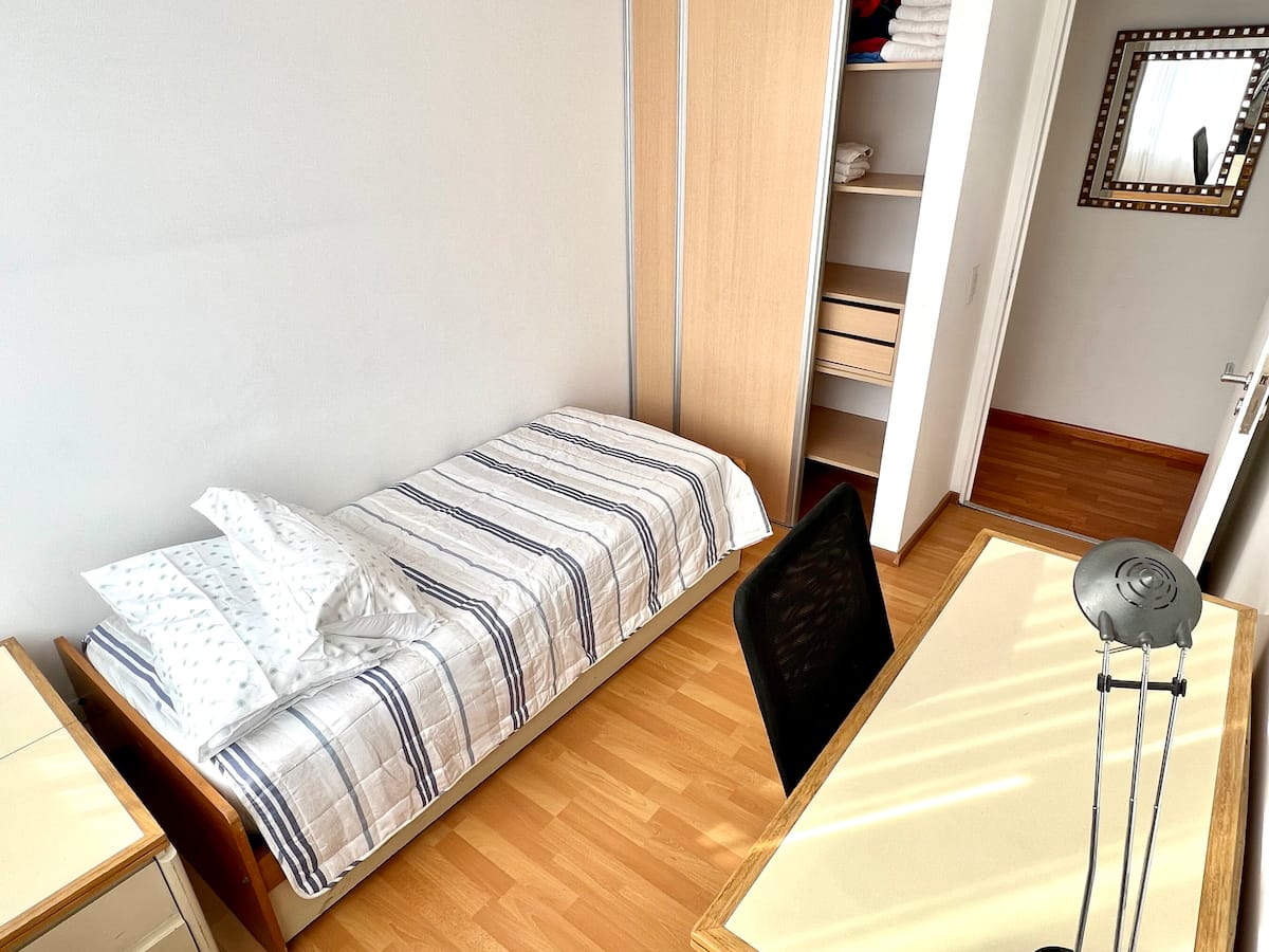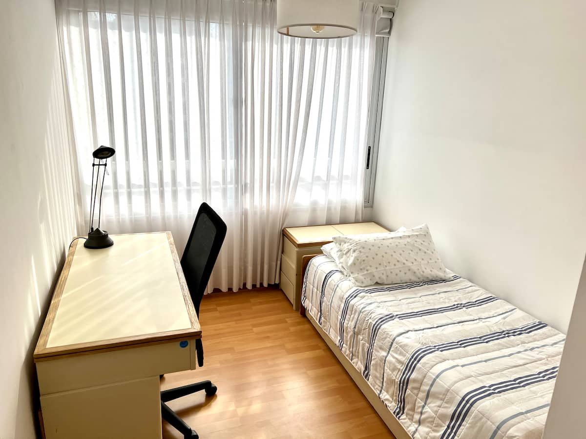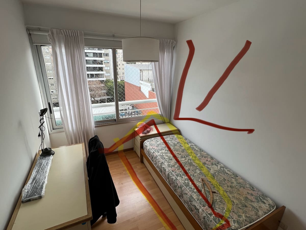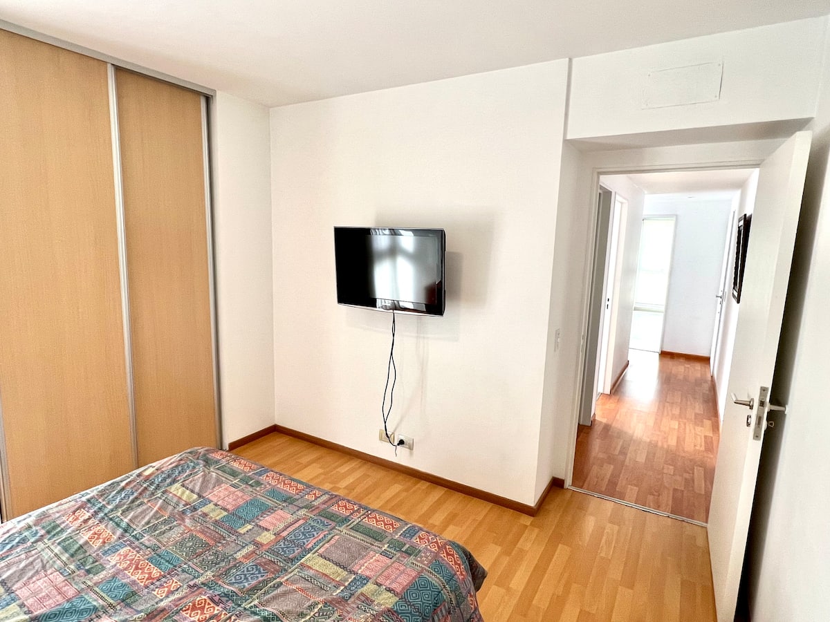 Квартира в Almagro с 2 спальнями, окна на улицу или во двор не указаны. В главной спальне установлены двуспальная кровать и телевизор. Во второй спальне кровать для одного с тележкой для выдвижной второй кровати, а также рабочий стол и стул. В здании есть бассейн, спортзал и круглосуточная охрана; в стоимость включено (закреплённое) парковочное место в гараже.