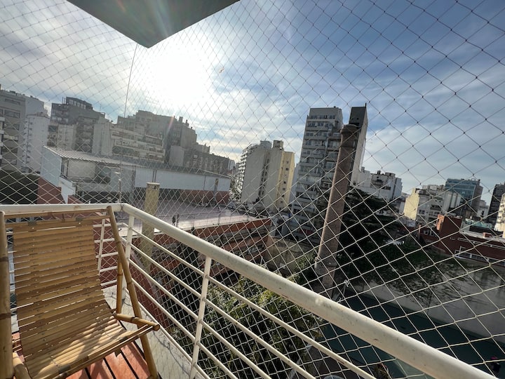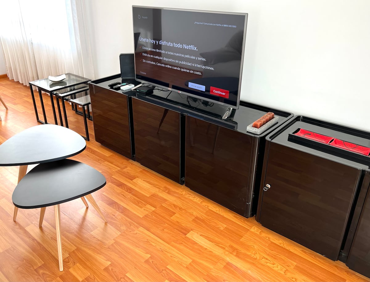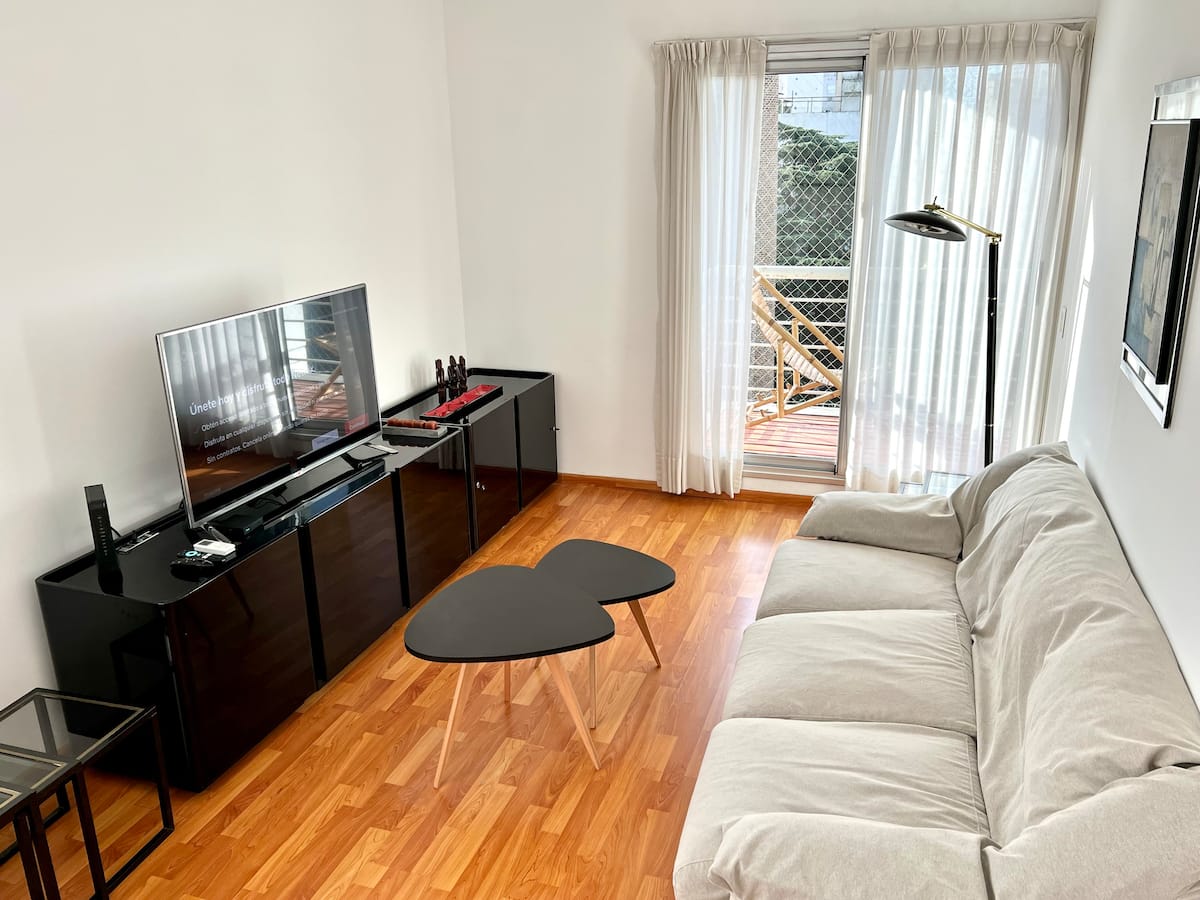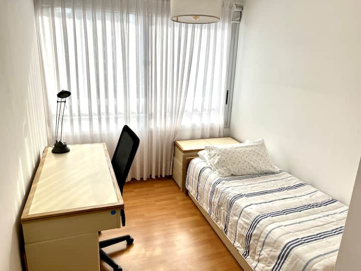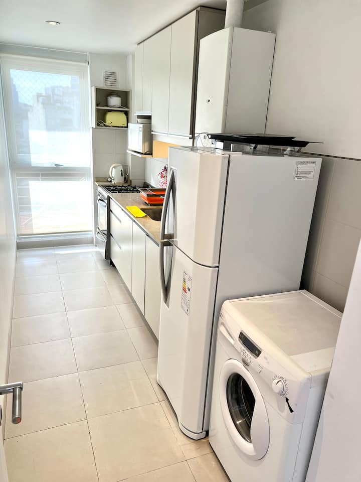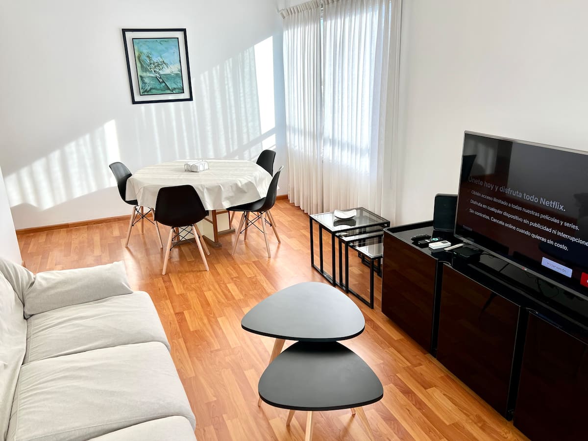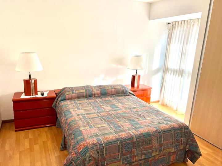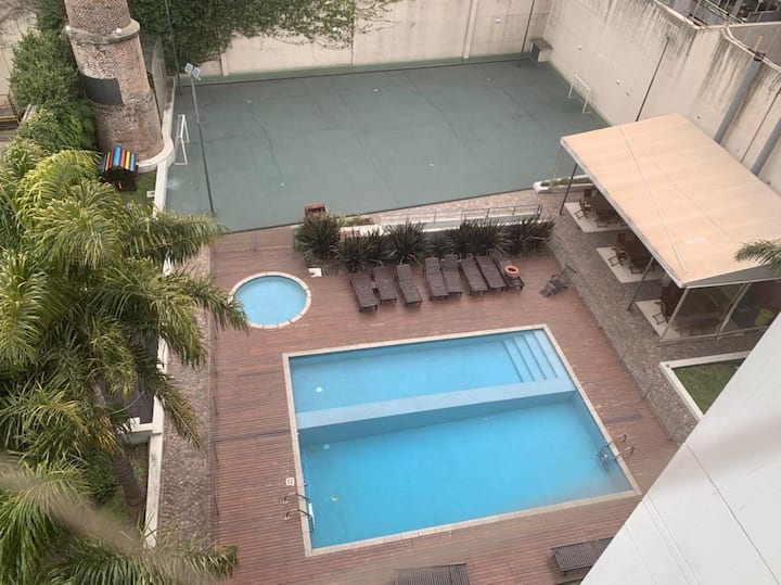Квартира в Almagro с 2 спальнями, окна на улицу или во двор не указаны. В главной спальне установлены двуспальная кровать и телевизор. Во второй спальне кровать для одного с тележкой для выдвижной второй кровати, а также рабочий стол и стул. В здании есть бассейн, спортзал и круглосуточная охрана; в стоимость включено (закреплённое) парковочное место в гараже.