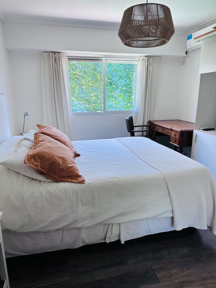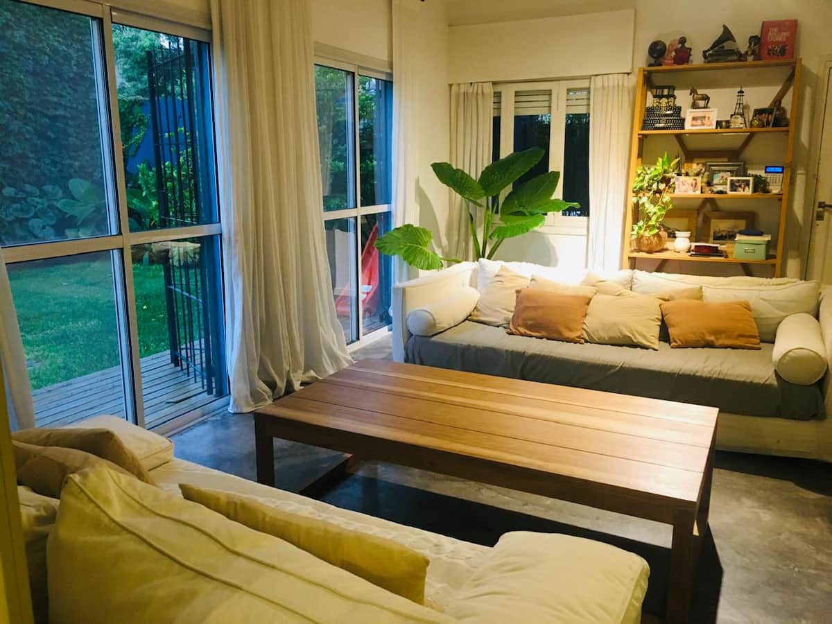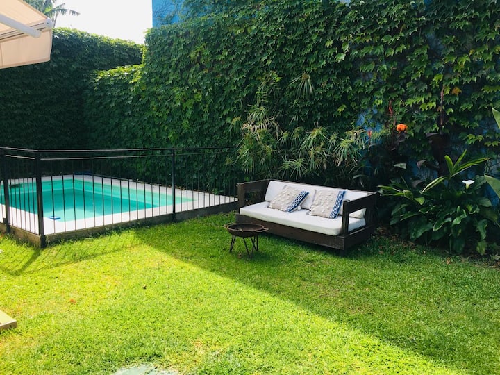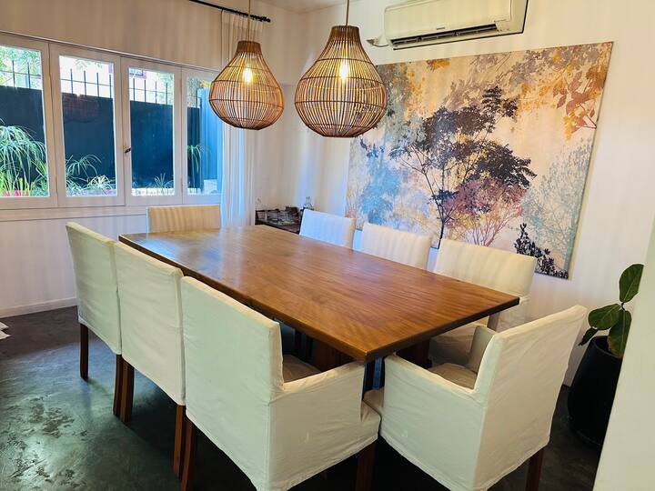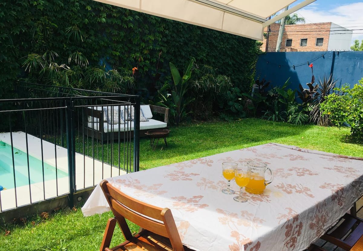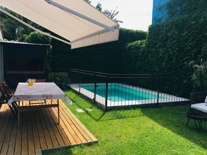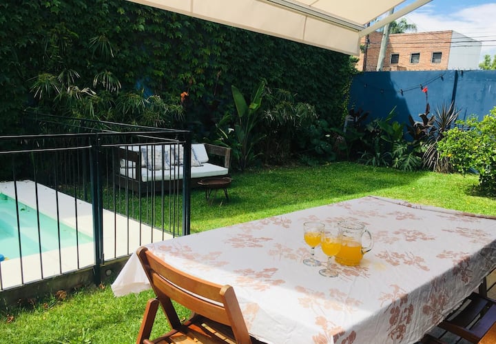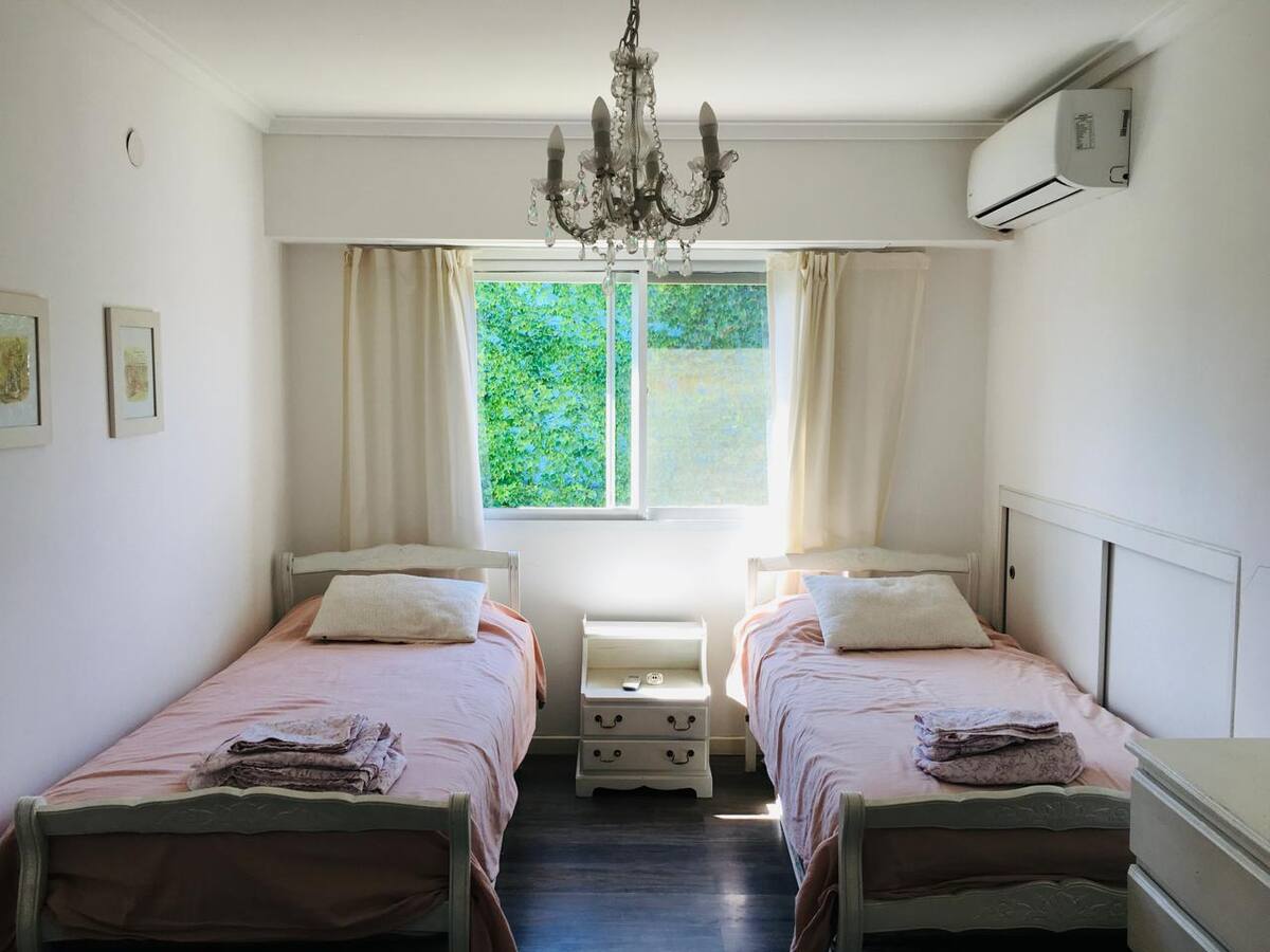 Квартира в Beccar с садом, бассейном и зоной гриля. На первом этаже: гостиная-столовая с видом на сад, игровая комната с прямым выходом к зоне гриля, полностью оборудованная кухня, ванная комната, прачечная. На втором этаже: спальня с двуспальной кроватью, телевизором и рабочим столом, вторая спальня с двумя односпальными кроватями, вторая ванная комната. Во всех помещениях установлены кондиционеры; указаны быстрый Wi‑Fi и сервисы для сада и бассейна, условия согласуются.