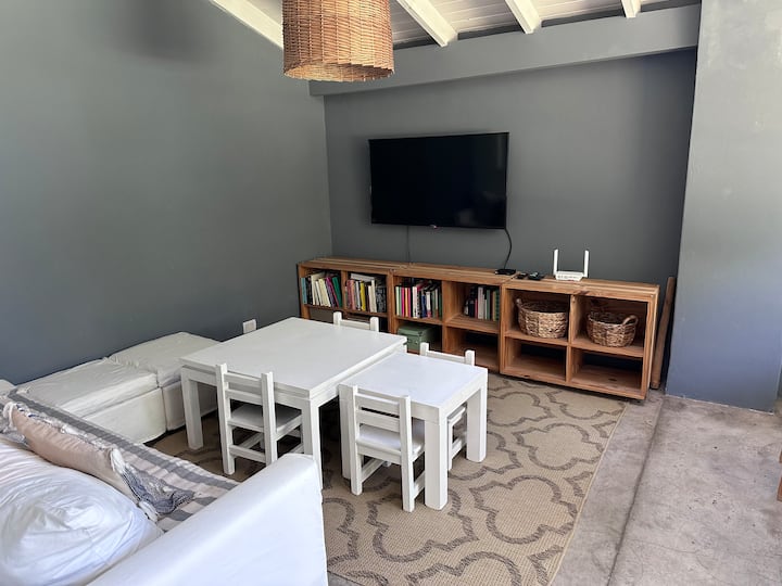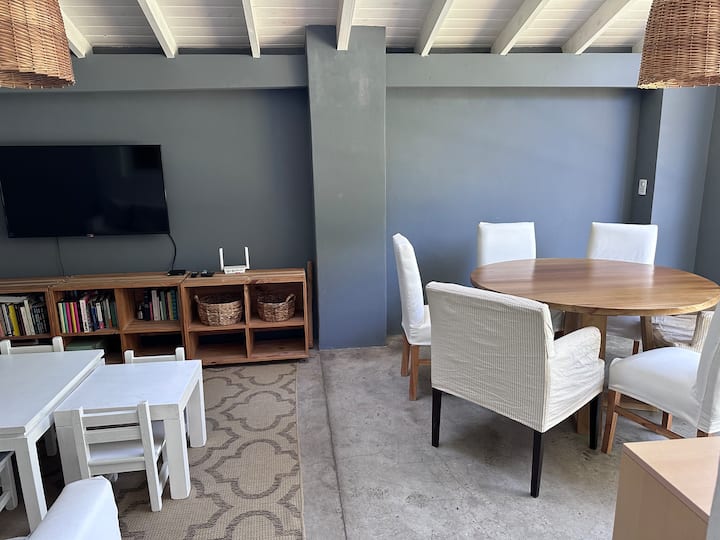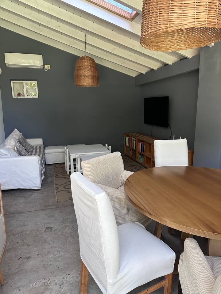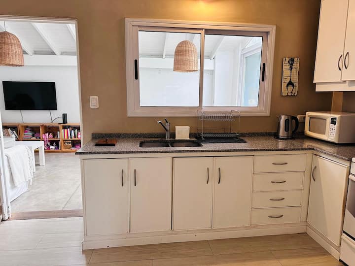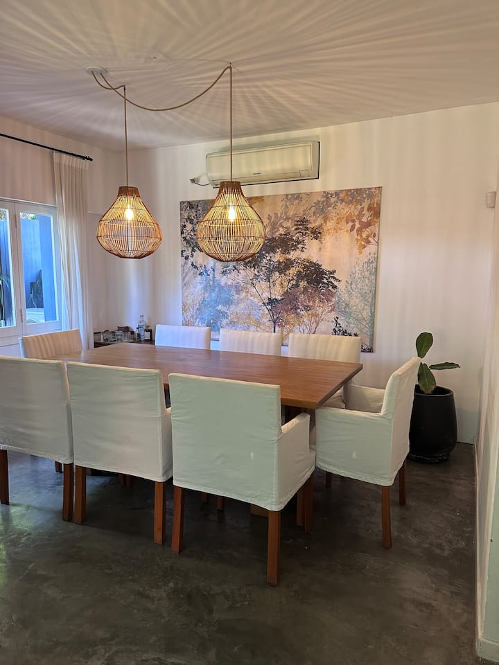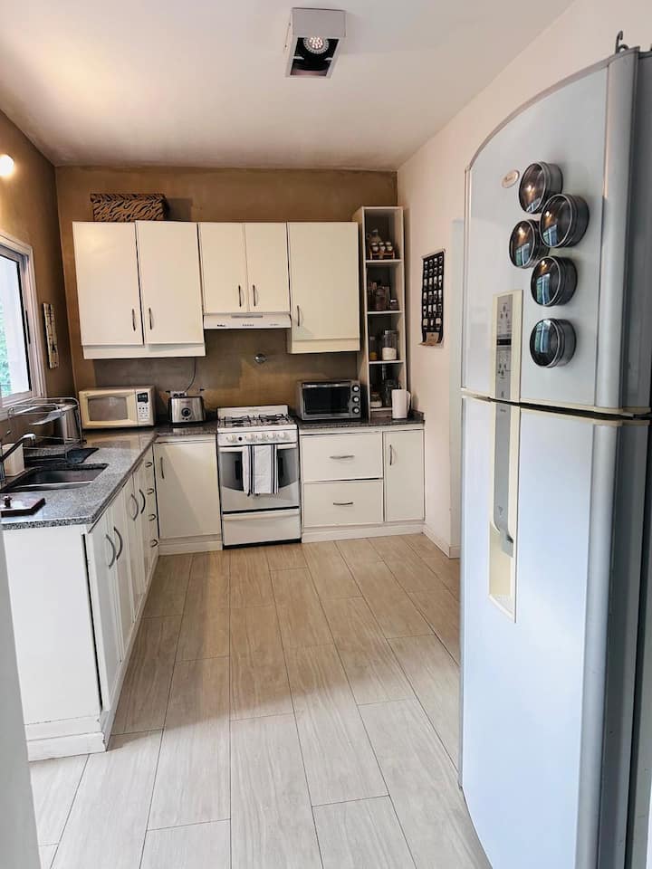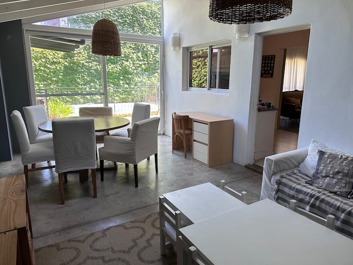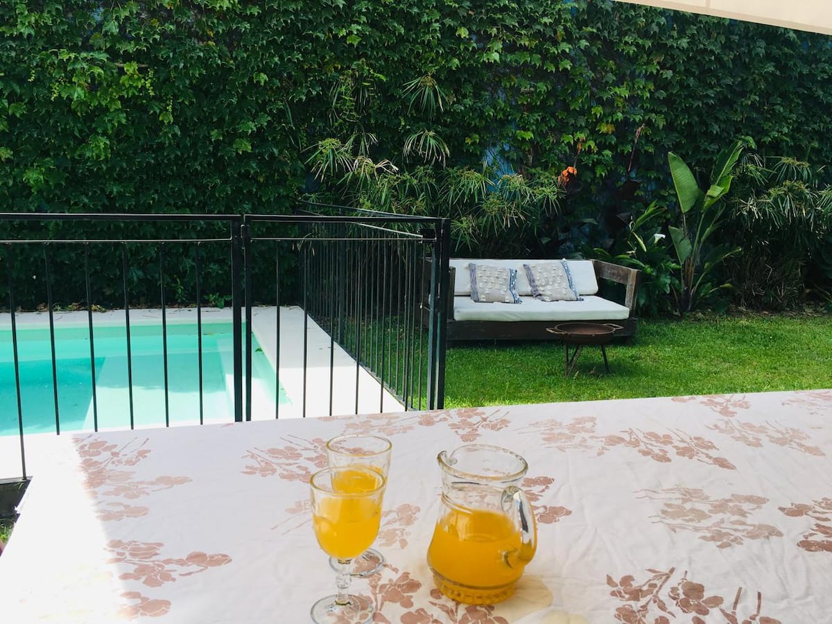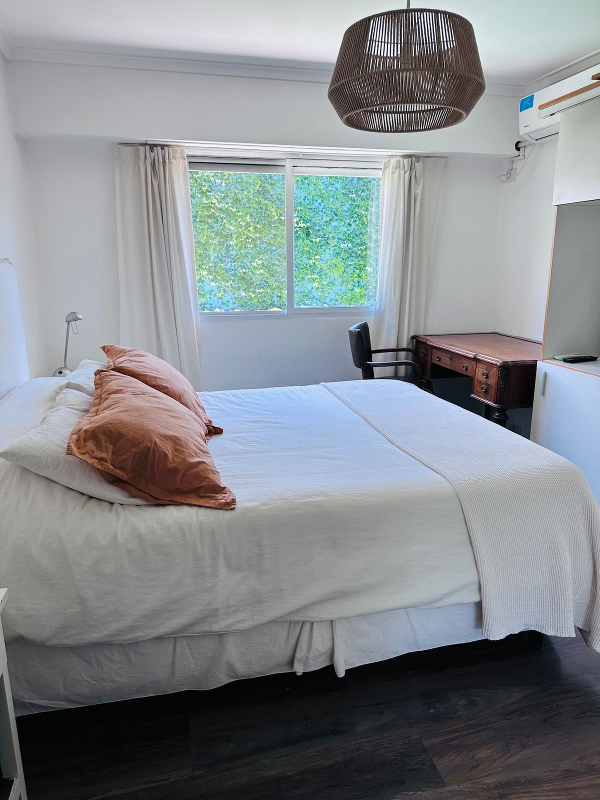 Квартира в Beccar с садом, бассейном и зоной гриля. На первом этаже: гостиная-столовая с видом на сад, игровая комната с прямым выходом к зоне гриля, полностью оборудованная кухня, ванная комната, прачечная. На втором этаже: спальня с двуспальной кроватью, телевизором и рабочим столом, вторая спальня с двумя односпальными кроватями, вторая ванная комната. Во всех помещениях установлены кондиционеры; указаны быстрый Wi‑Fi и сервисы для сада и бассейна, условия согласуются.