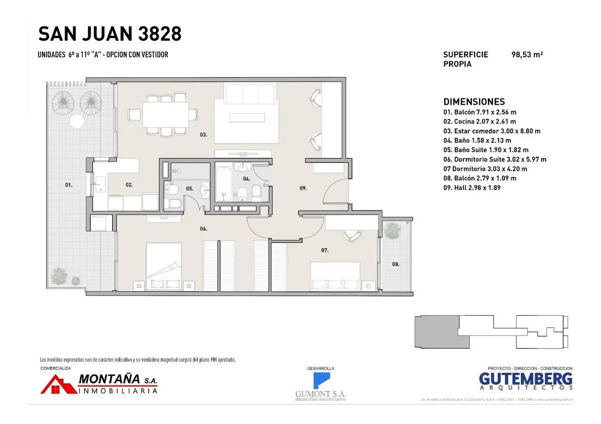 Квартира в новом доме в Boedo, 3 комнаты общей площадью 101,41 m². Квартира с выходом на террасный балкон: окна на улицу и во двор, ориентация на север, высокий этаж. В планировке 1 спальня с ванной в suite и гардеробной, вторая спальня с балконом. Установлены 3 кондиционера (в гостиной-столовой и в обеих спальнях). В здании предусмотрены бассейн с подогревом, тренажёрный зал, общая гостиная для 40 человек, зал в формате винного погреба для 12 человек и зона коворкинга. Аренда указана без учёта