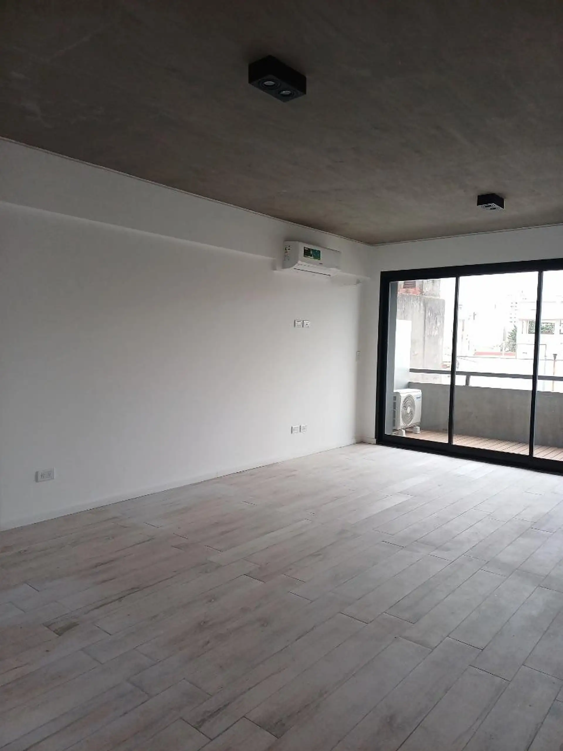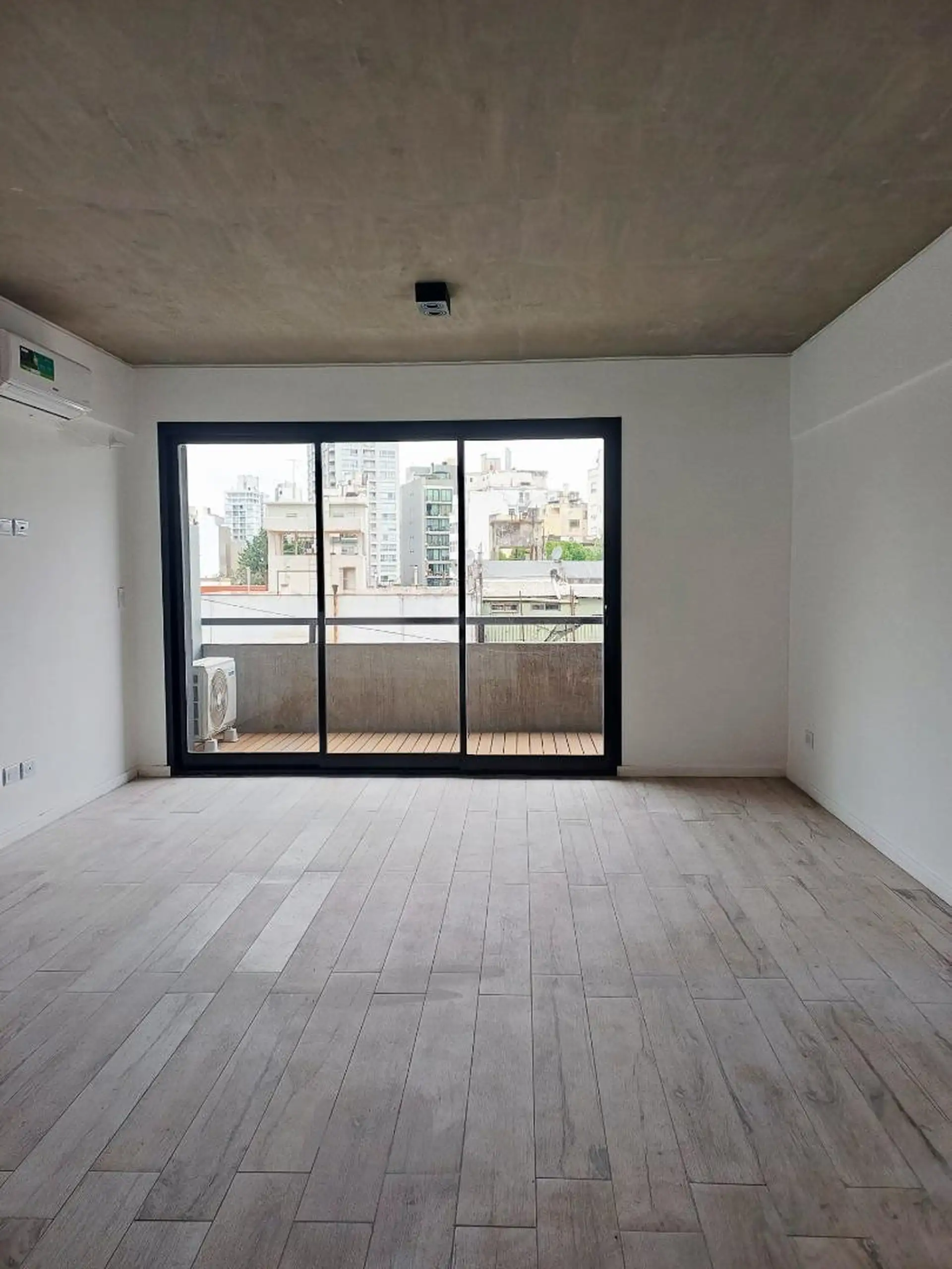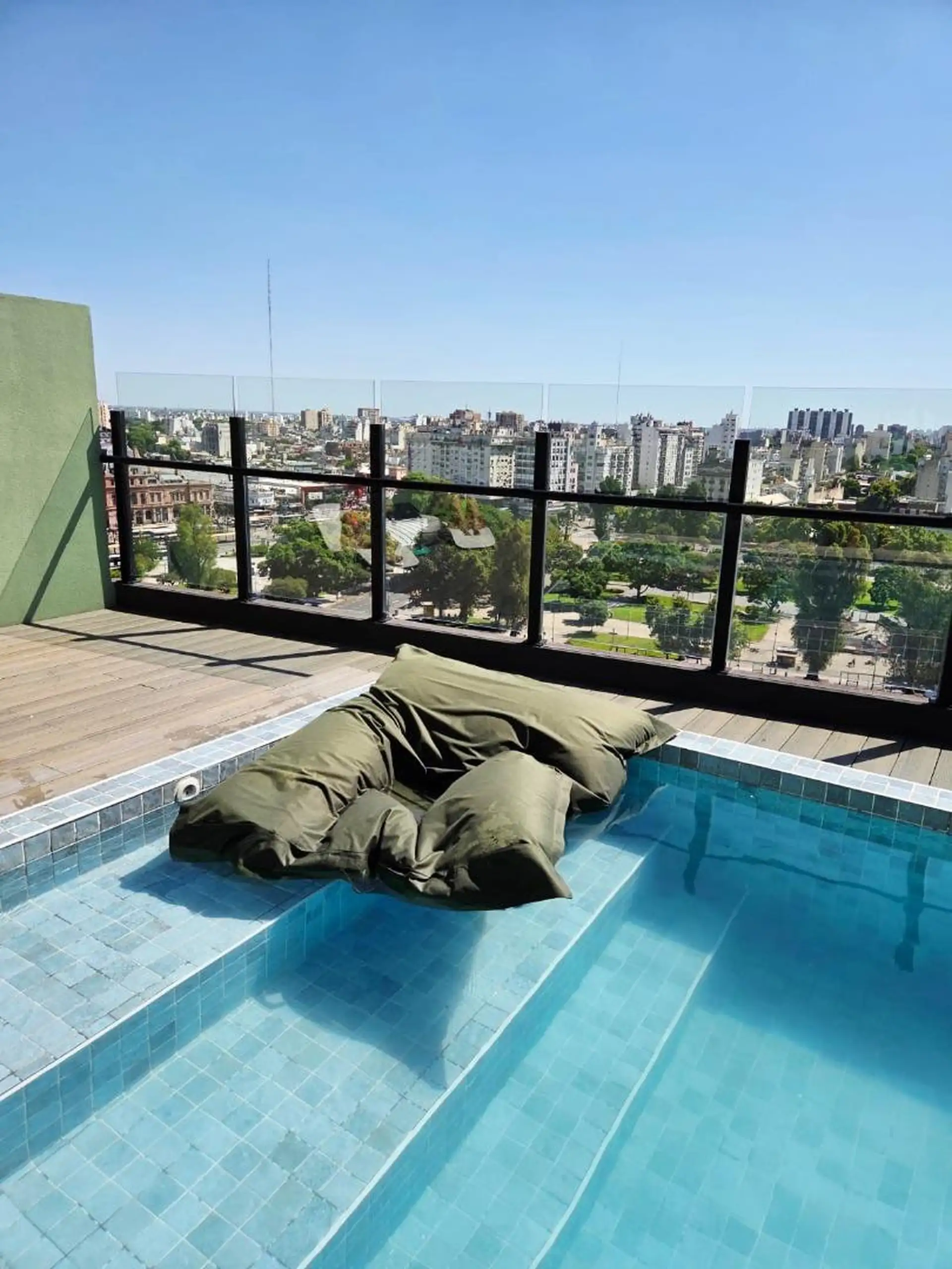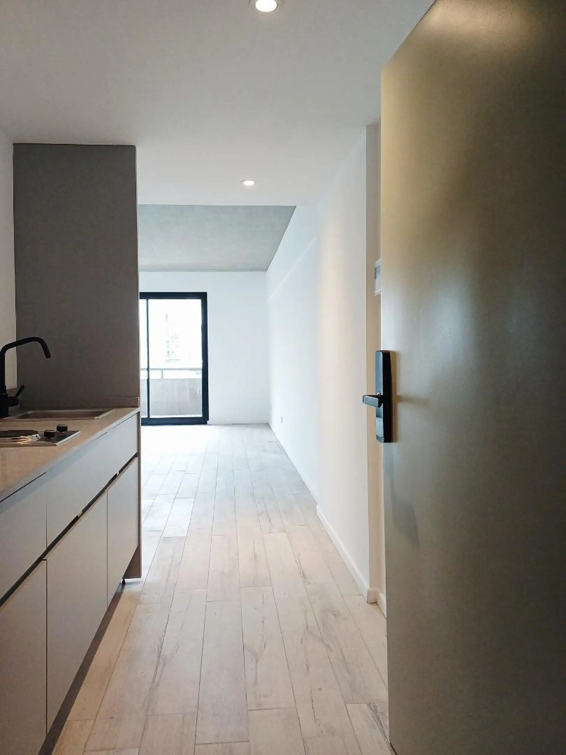 Квартира-студия новая, 40 m² общих, окна во двор (contrafrente). Полы из керамогранита под дерево, в кухонной зоне установлен anafe с двумя конфорками. В ванной полный комплект с душевой лейкой, предусмотрен сплит холод/тепло. Есть балкон с настилом (decks) с ориентацией на восток. В здании: бассейн на 15-м этаже с солярием и душевыми, прачечная на 15-м этаже, общая гостиная (SUM) на 15-м этаже, тренажёрный зал на первом полуподвальном уровне с естественным светом, пространство для Cowork на пер