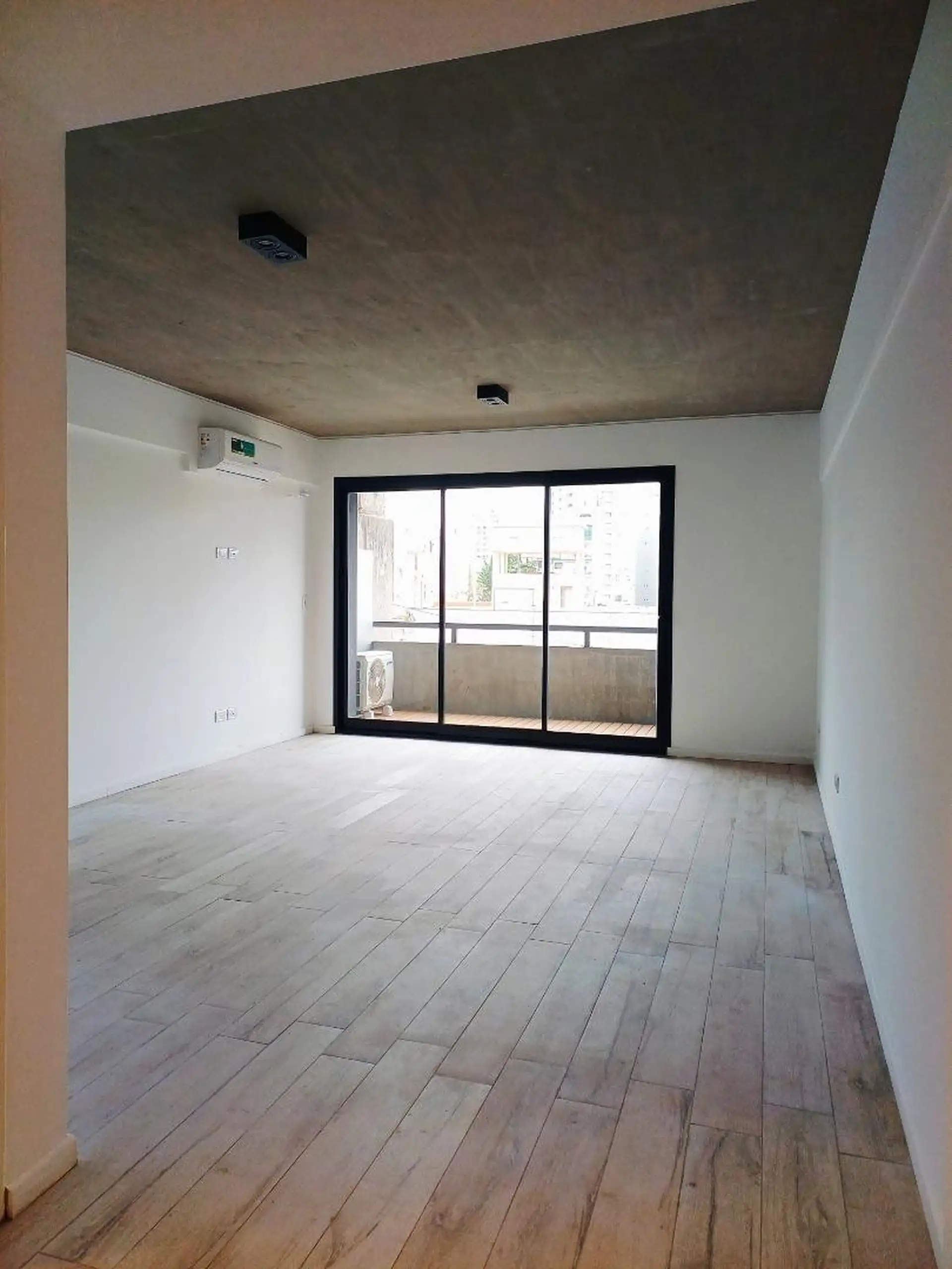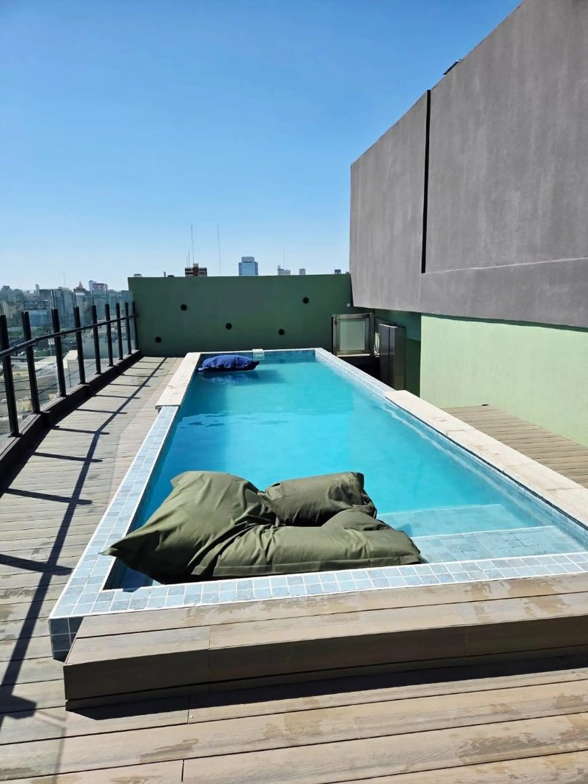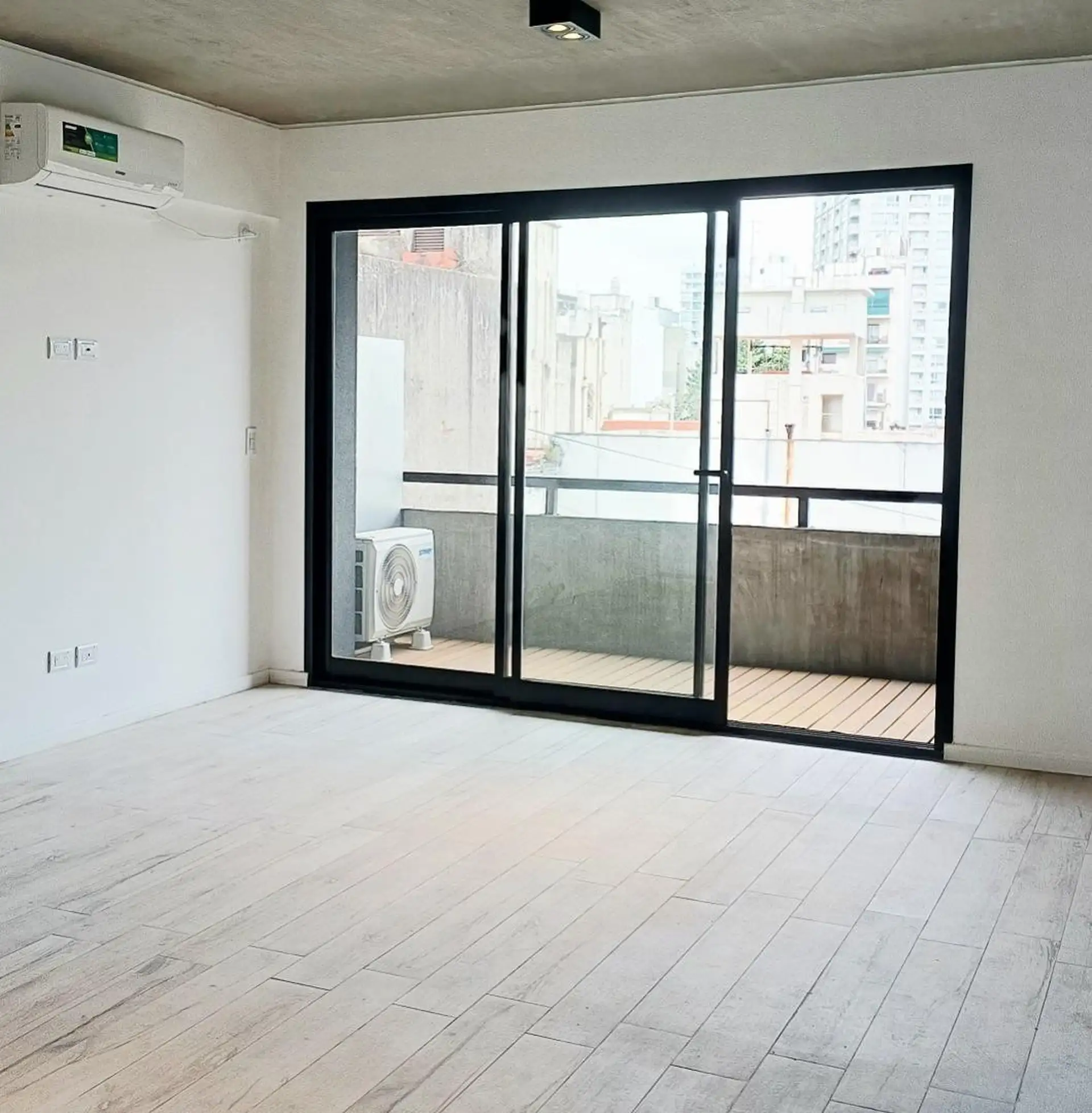 Квартира-студия новая, 40 m² общих, окна во двор (contrafrente). Полы из керамогранита под дерево, в кухонной зоне установлен anafe с двумя конфорками. В ванной полный комплект с душевой лейкой, предусмотрен сплит холод/тепло. Есть балкон с настилом (decks) с ориентацией на восток. В здании: бассейн на 15-м этаже с солярием и душевыми, прачечная на 15-м этаже, общая гостиная (SUM) на 15-м этаже, тренажёрный зал на первом полуподвальном уровне с естественным светом, пространство для Cowork на пер