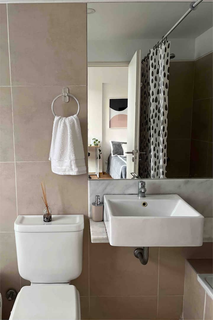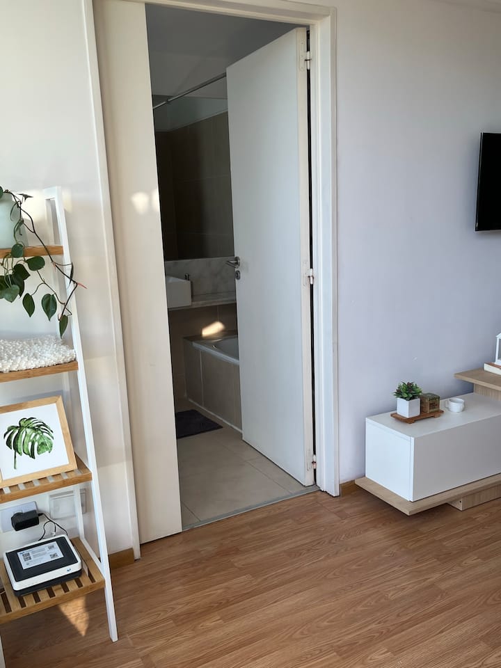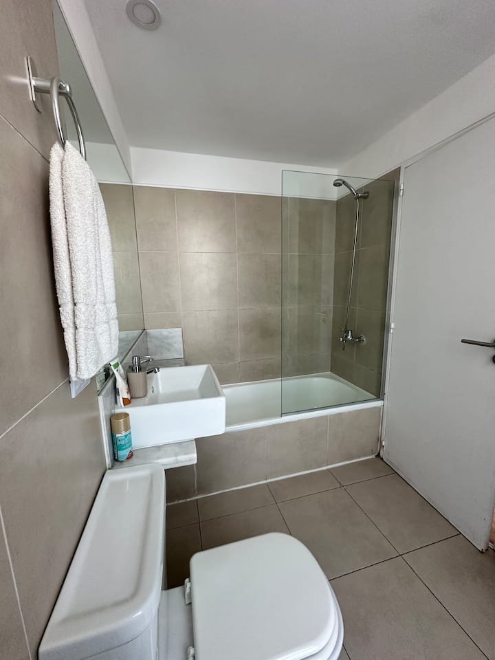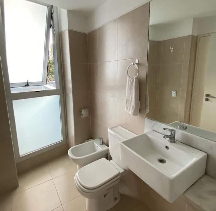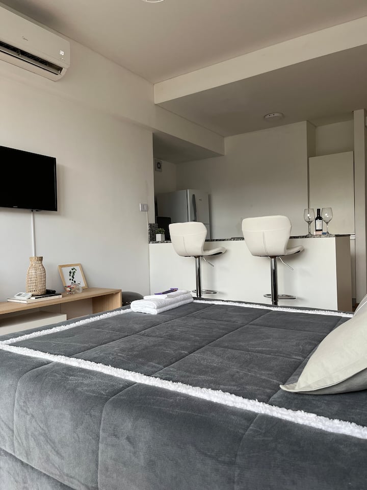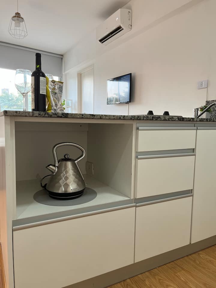 Квартира в Constitución с 2 спальнями. 13-этажная башня в современном минималистском стиле с круглосуточной охраной. Есть терраса с видом на город, зона гриля и прачечная. Кухня с барной стойкой для завтрака оборудована духовкой, электрочайником, керамической варочной панелью, холодильником с морозильной камерой и тостером. В спальной зоне двуспальная кровать, телевизор 40" Smart TV с Android, гардероб. В ванной — ванна, душевая перегородка, душ; указано отличное давление воды. Предоставляются п