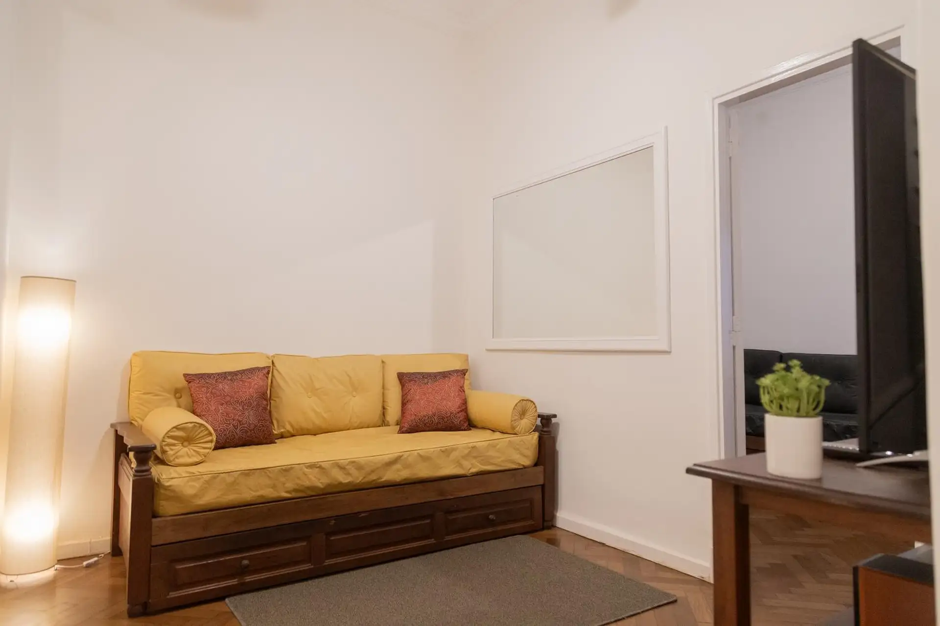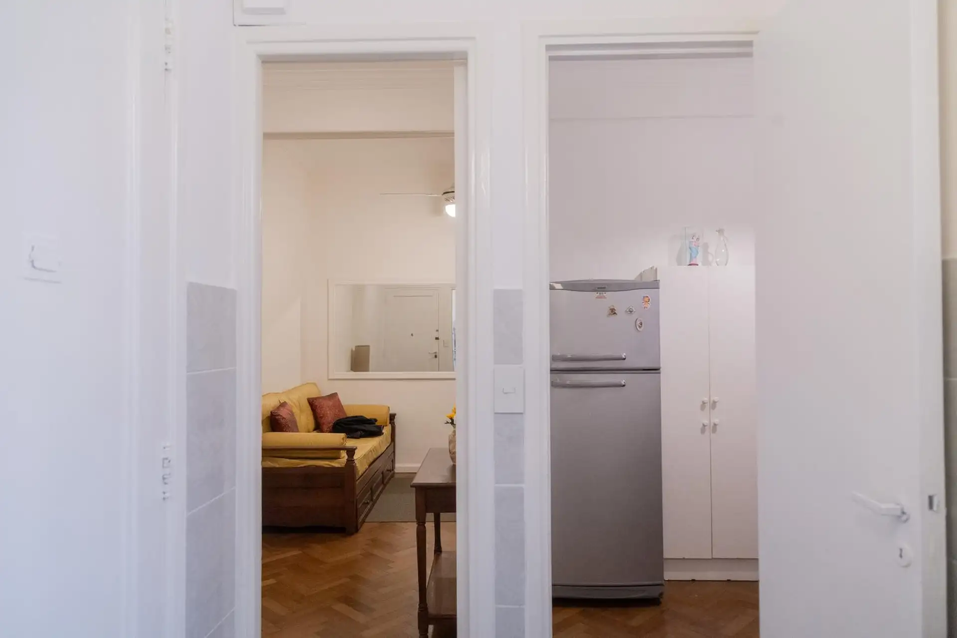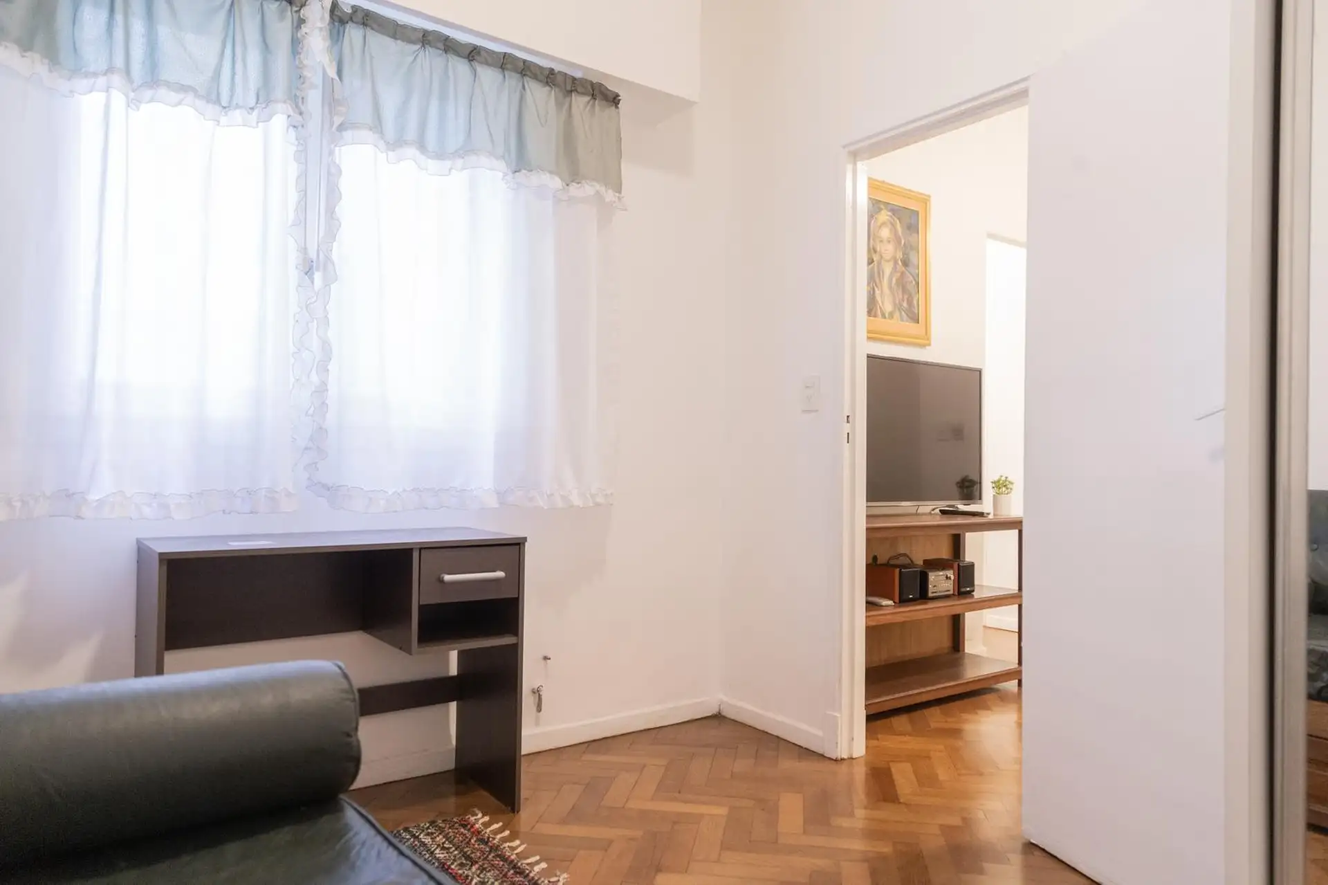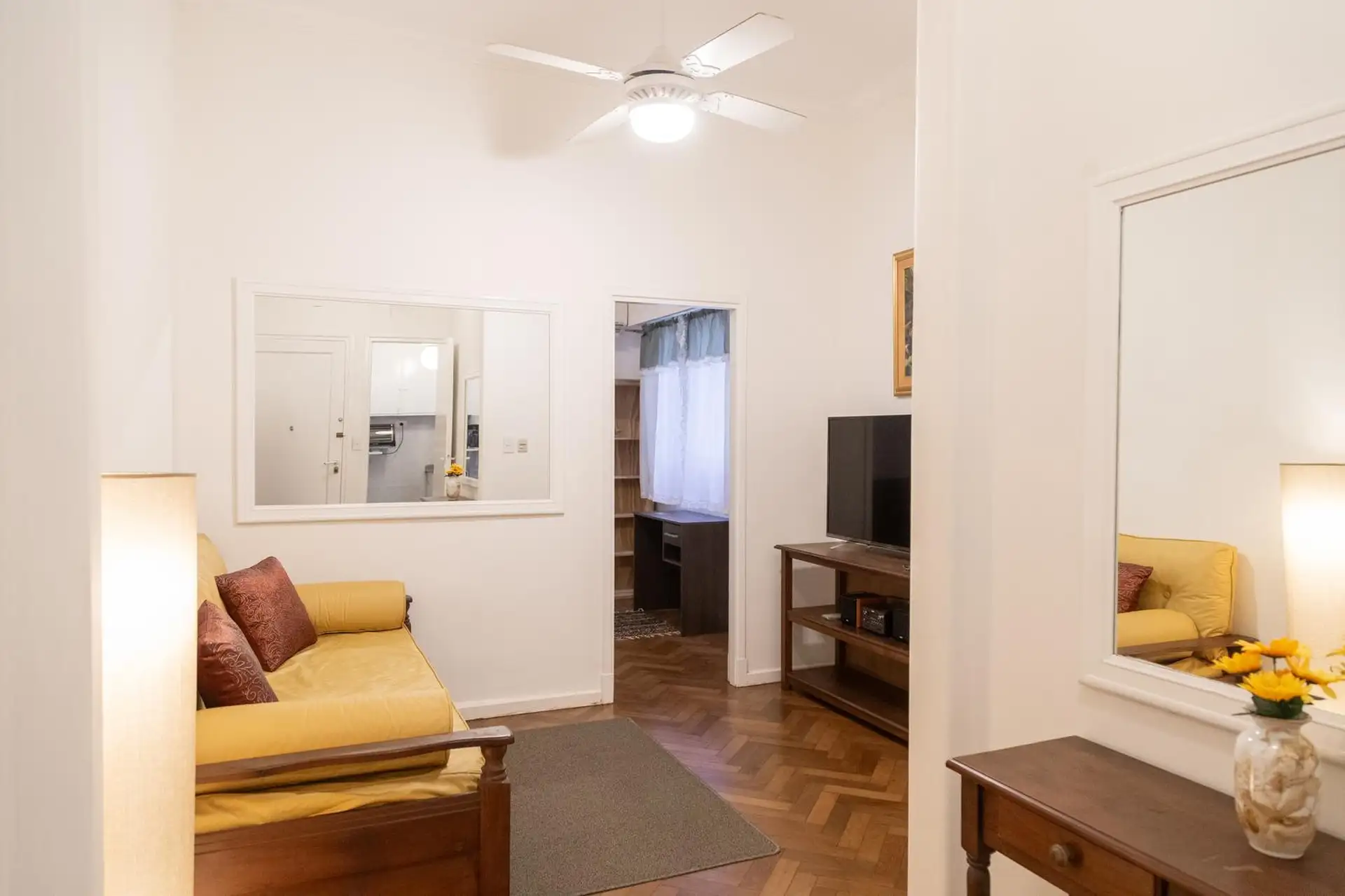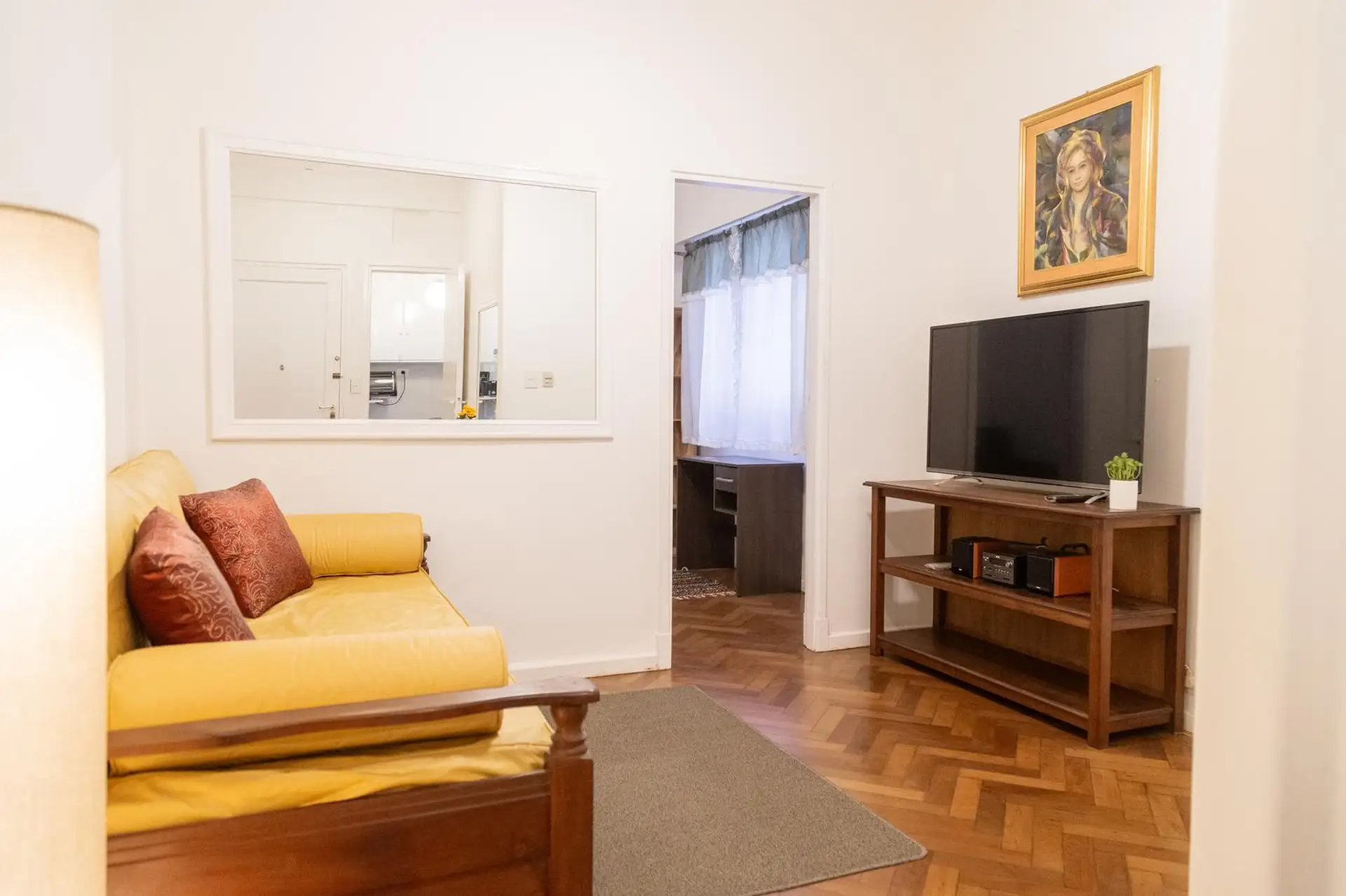 Квартира 3 ambientes (2 спальни) в Palermo, окна на улицу по Calle Guemes. Площадь и этаж не указаны; это первый этаж по лестнице, лифта нет. В квартире есть мебель: в гостиной диван-кровать с тележкой, телевизор и потолочный вентилятор; стол и стулья на 4 человека в обеденной зоне. Кухня полностью оборудована: электрическая духовка, электрический чайник, тостер, кофеварка и стиральная машина. В спальнях: главная с двуспальной кроватью, тумбами, шкафом, телевизором, потолочным вентилятором и кон