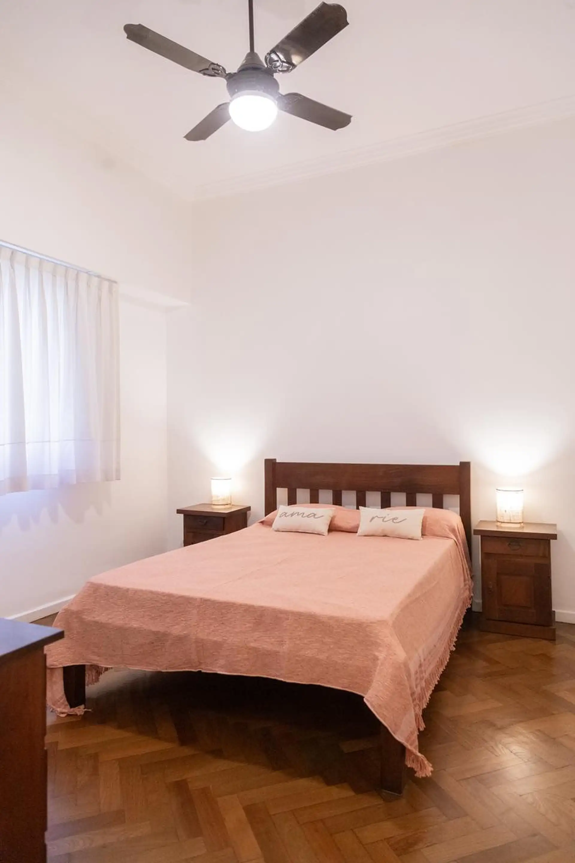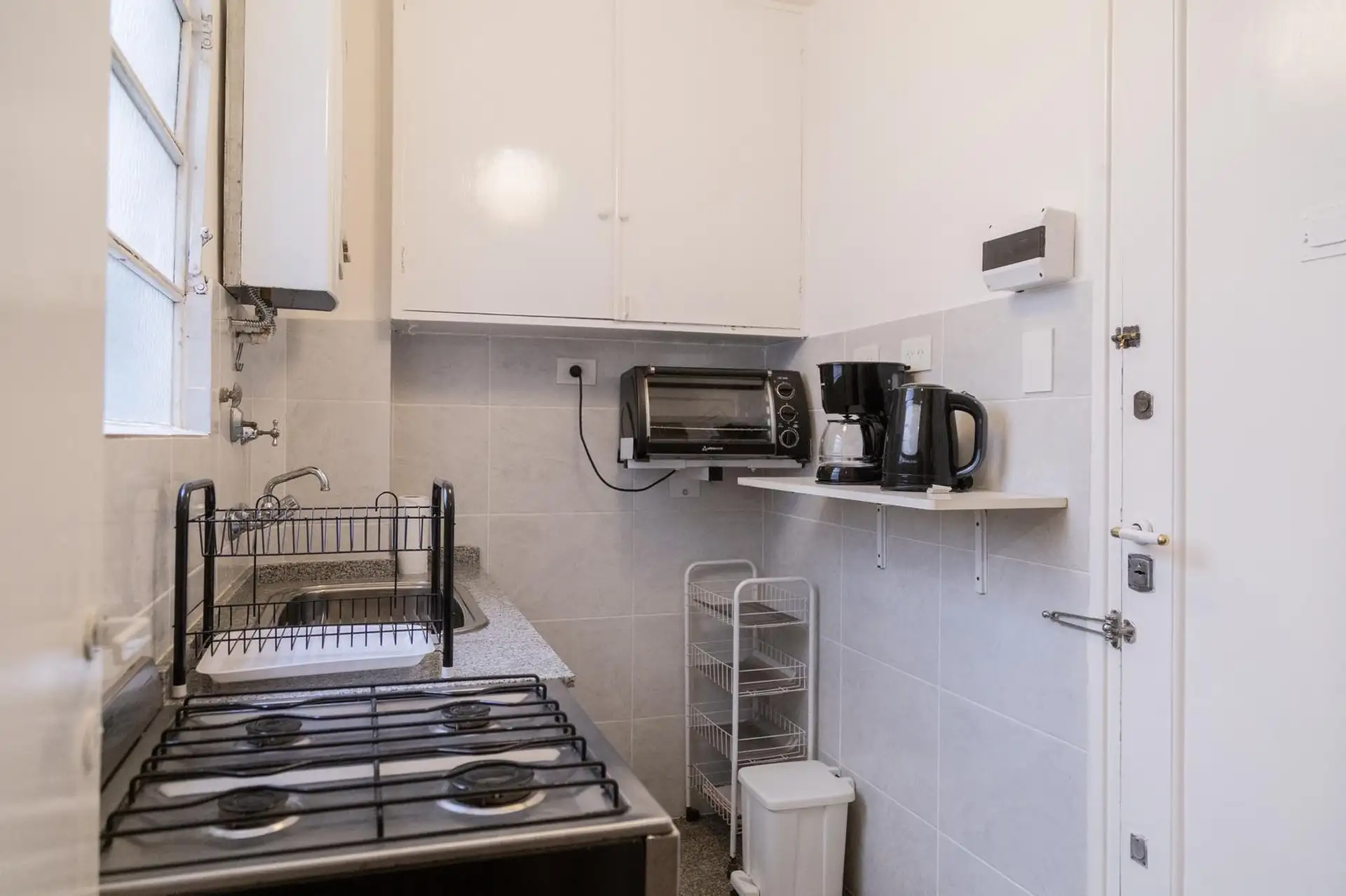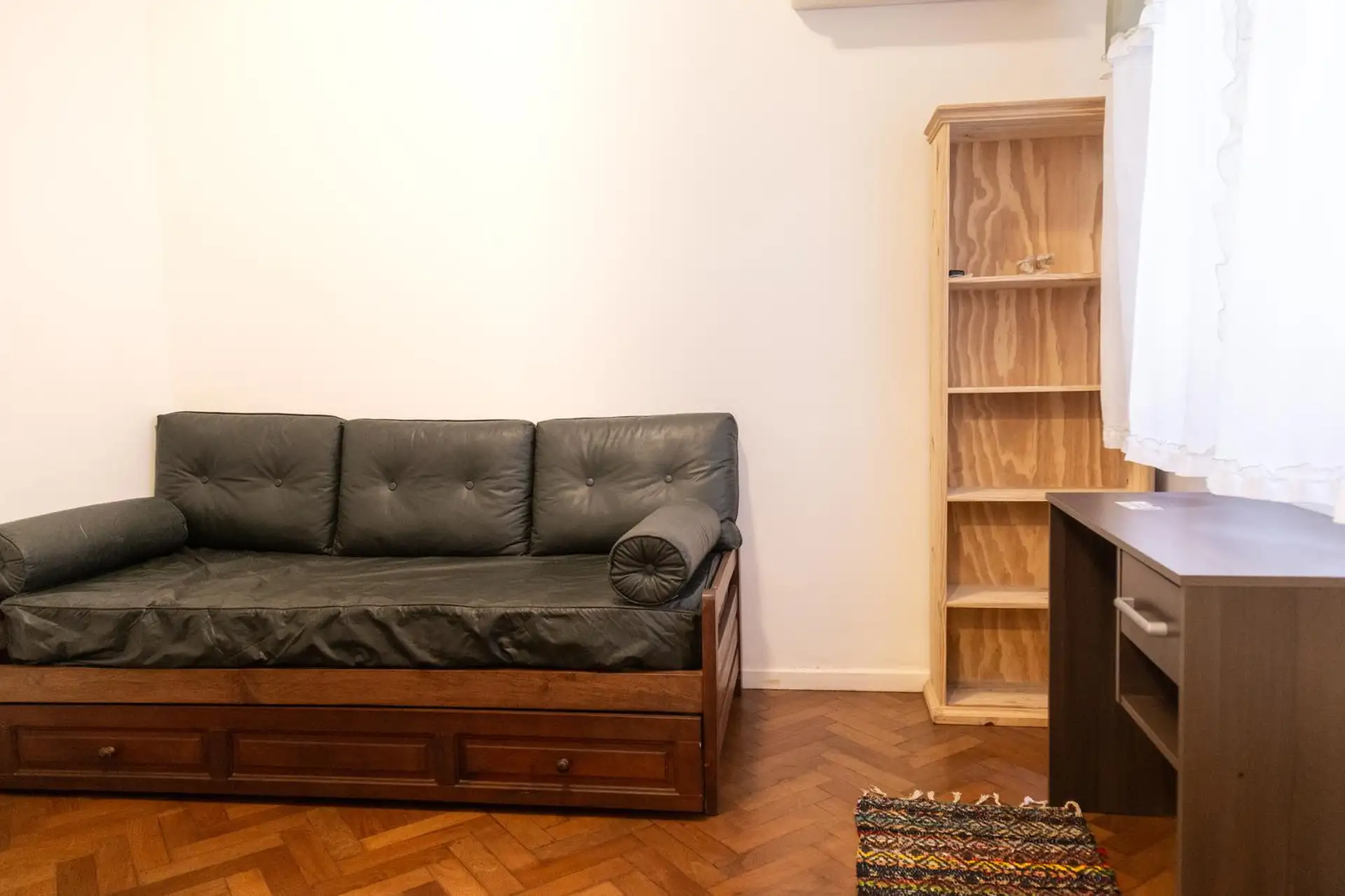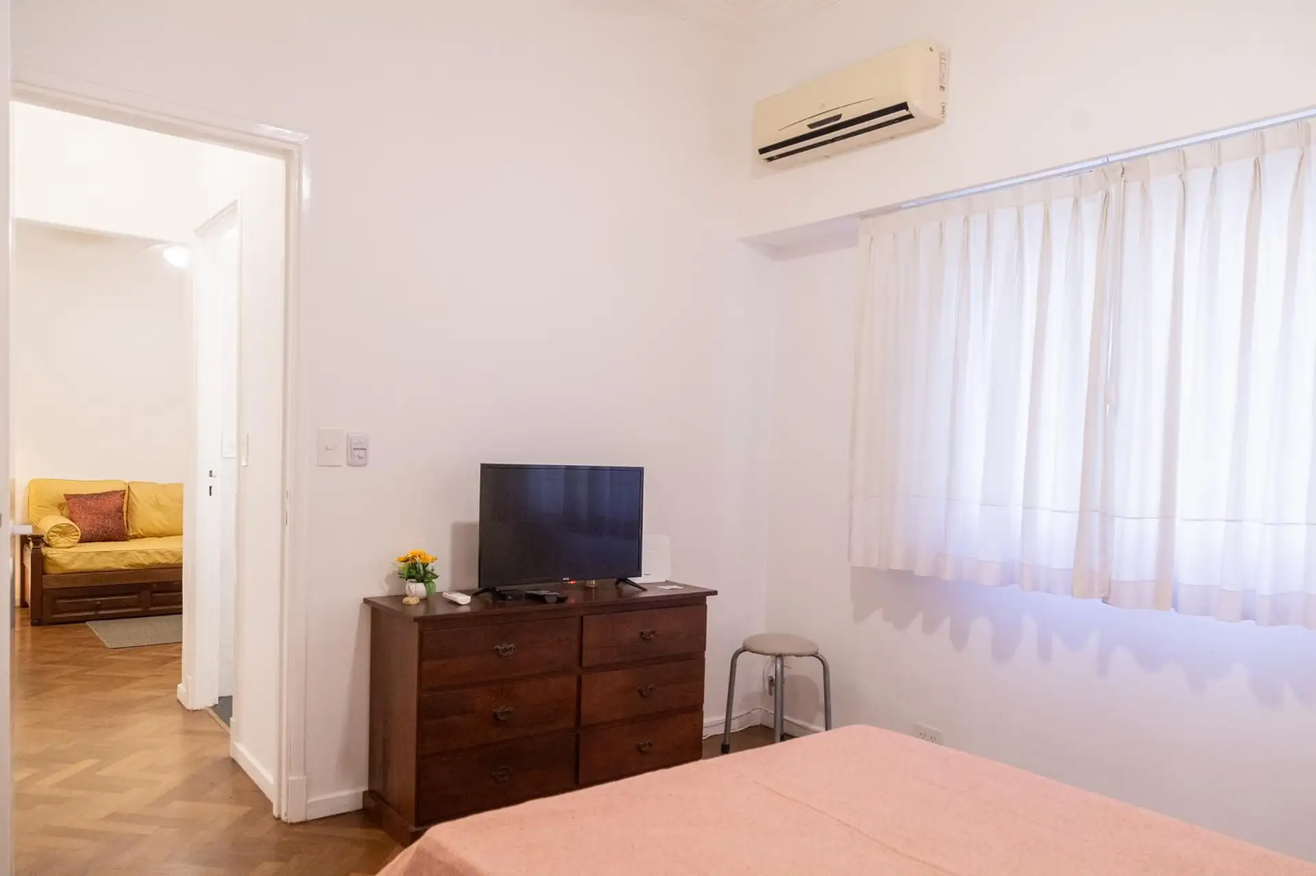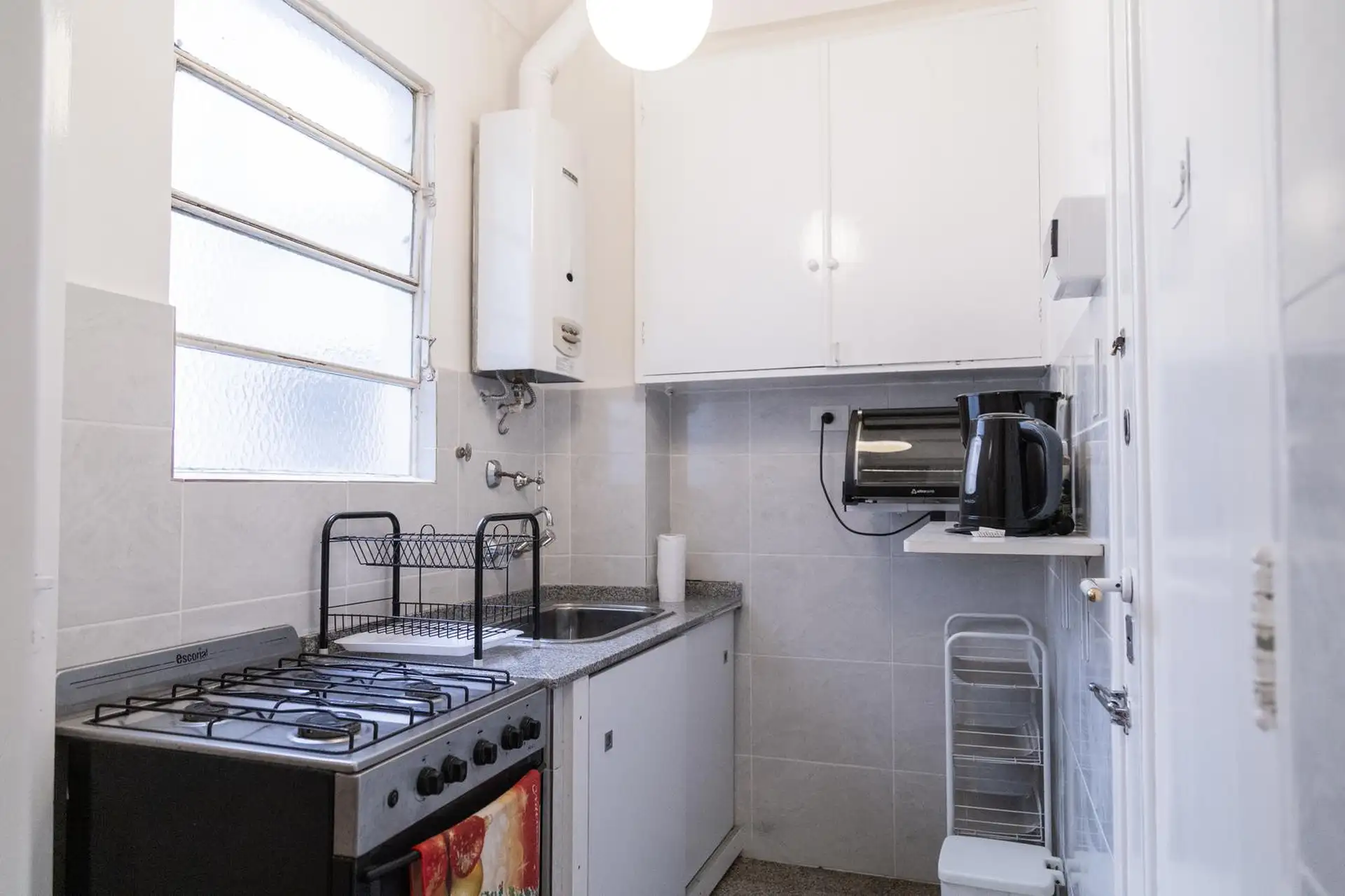 Квартира 3 ambientes (2 спальни) в Palermo, окна на улицу по Calle Guemes. Площадь и этаж не указаны; это первый этаж по лестнице, лифта нет. В квартире есть мебель: в гостиной диван-кровать с тележкой, телевизор и потолочный вентилятор; стол и стулья на 4 человека в обеденной зоне. Кухня полностью оборудована: электрическая духовка, электрический чайник, тостер, кофеварка и стиральная машина. В спальнях: главная с двуспальной кроватью, тумбами, шкафом, телевизором, потолочным вентилятором и кон