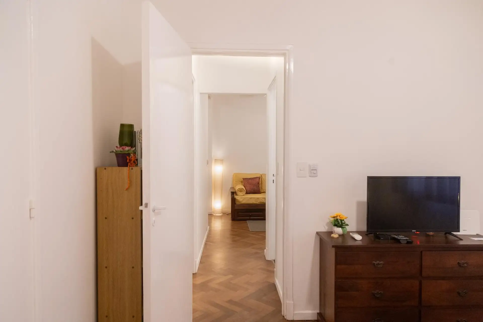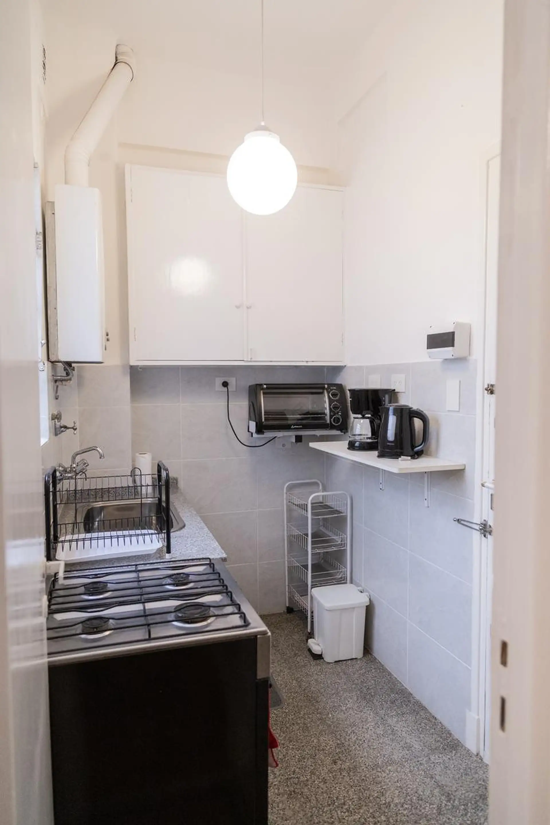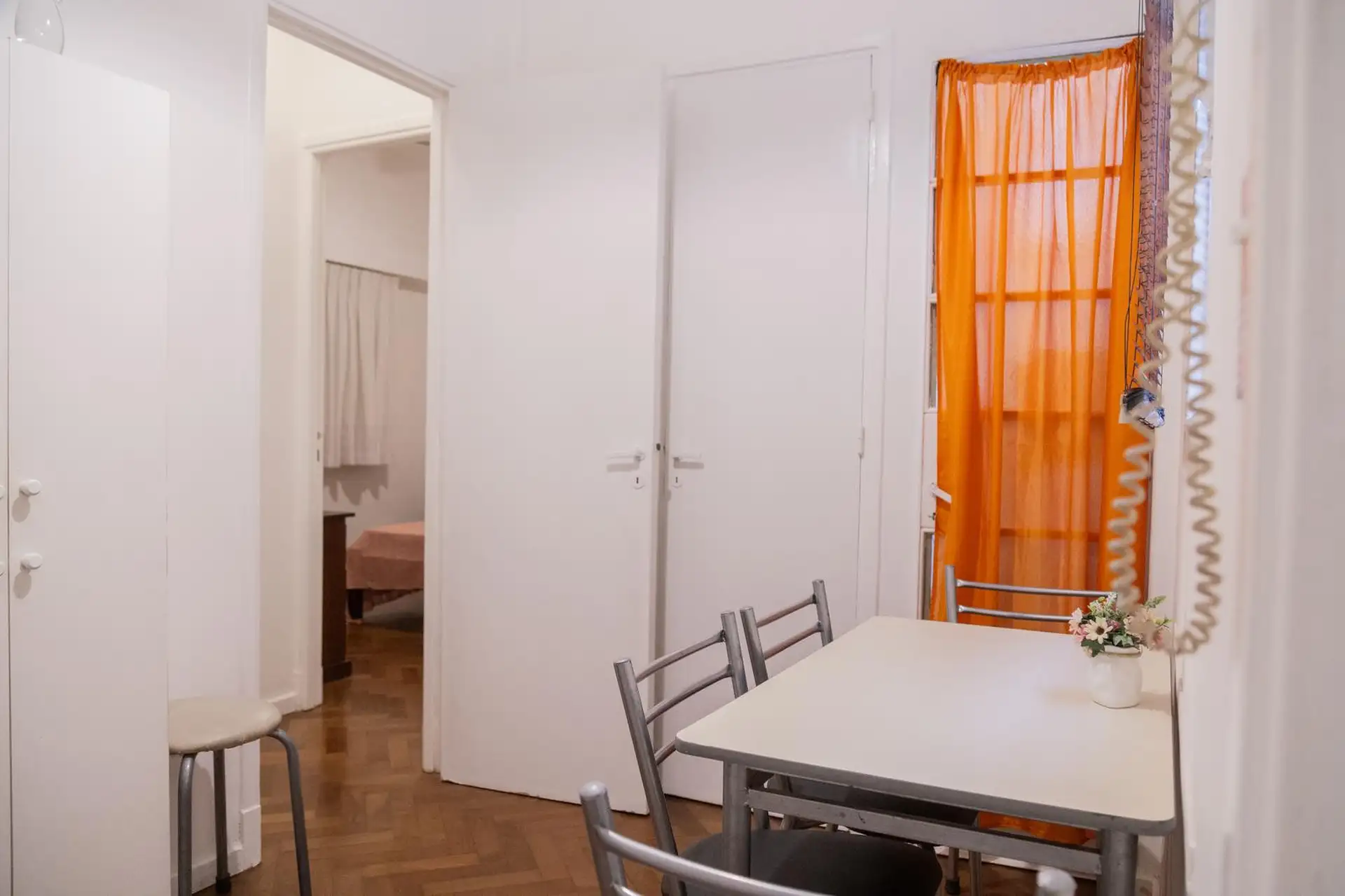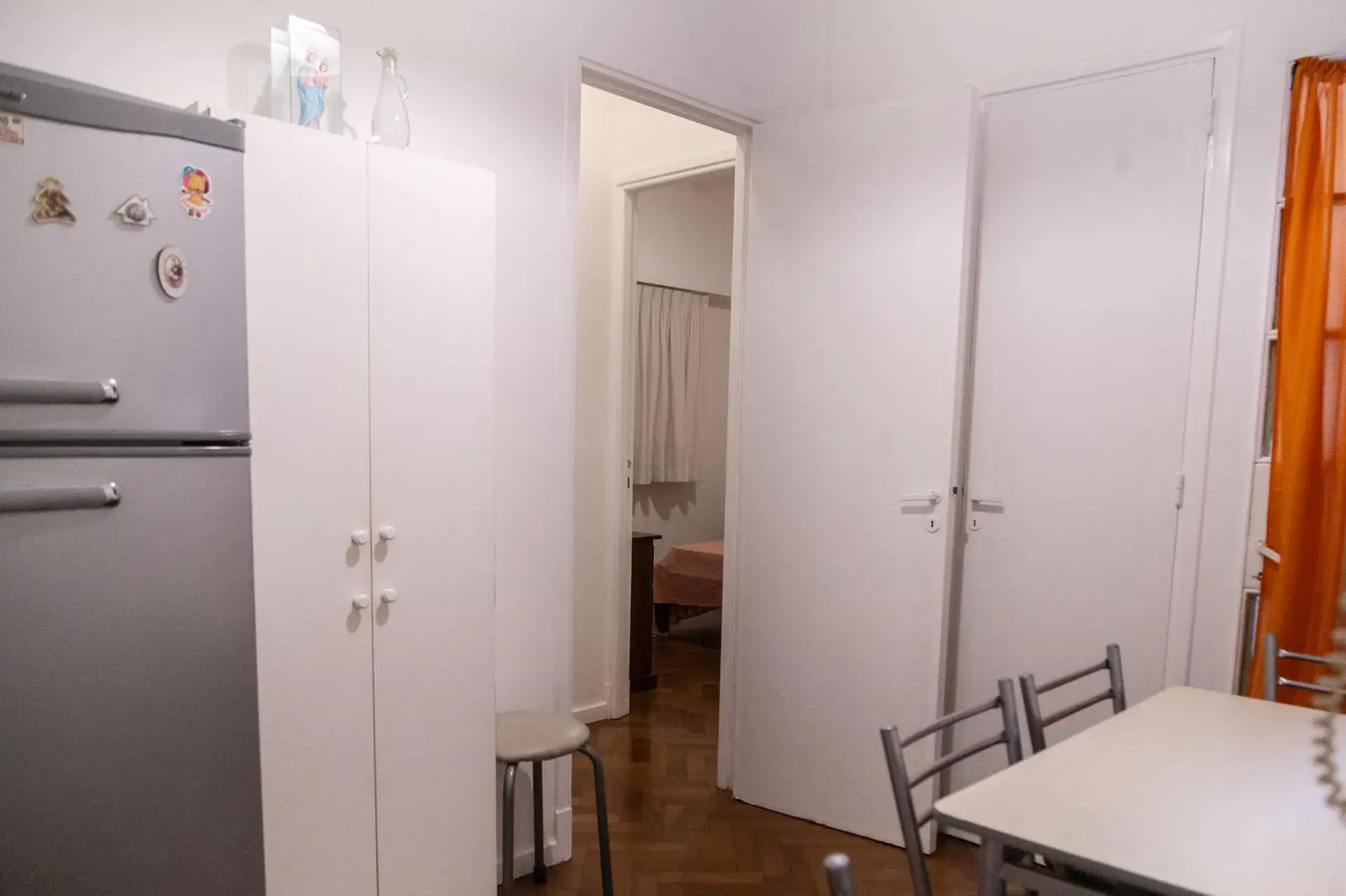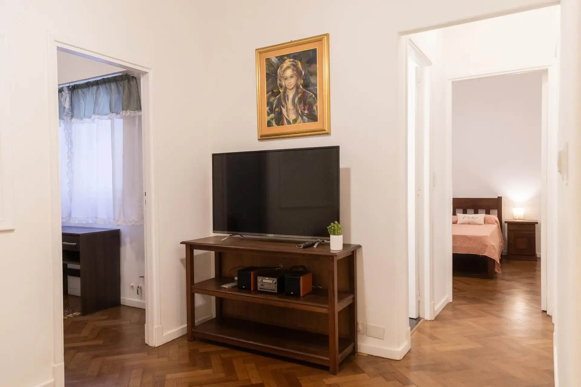 Квартира 3 ambientes (2 спальни) в Palermo, окна на улицу по Calle Guemes. Площадь и этаж не указаны; это первый этаж по лестнице, лифта нет. В квартире есть мебель: в гостиной диван-кровать с тележкой, телевизор и потолочный вентилятор; стол и стулья на 4 человека в обеденной зоне. Кухня полностью оборудована: электрическая духовка, электрический чайник, тостер, кофеварка и стиральная машина. В спальнях: главная с двуспальной кроватью, тумбами, шкафом, телевизором, потолочным вентилятором и кон