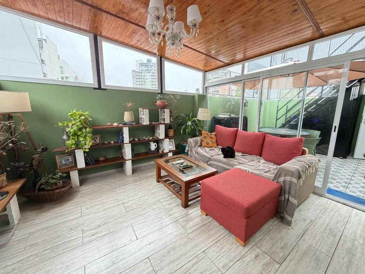 Квартира в Parque Chas в формате 3 ambientes на 1-м этаже по лестнице, с окнами во двор (contrafrente). Общая площадь 109 m²: 66 m² крытых и 43 m² открытых; квартира без мебели, в состоянии muy bueno, год постройки 1991, возраст здания 30 лет. Планировка включает гостиную (living), столовую, проходную кухню с нижними шкафами и местом для стирки, ванную с душем, спальню en suite с гардеробом и вторую комнату/кабинет с входом с террасы, а также дворик (patio) и террасу. Установлены 3 кондиционера