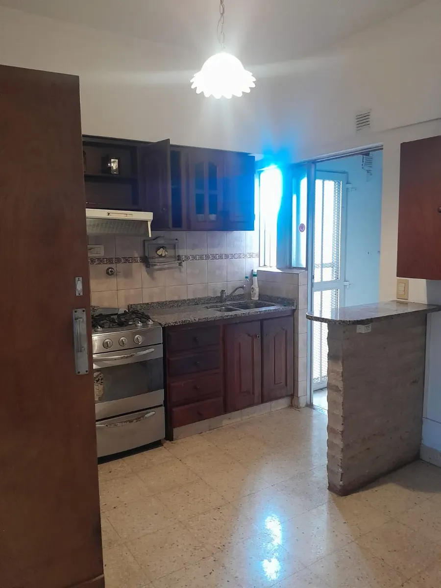 Квартира на 2-м этаже в Quilmes Centro, окна во двор (contrafrente). Находится в 2 кварталах от станции. В составе: гостиная-столовая, 2 спальни с встроенными шкафами и кондиционерами в обеих комнатах, отдельная кухня с плитой на газе, обеденной зоной и барной стойкой, отдельный внутренний дворик и помещение для стирки с мойкой. Полная ванная комната с тумбой (vanitory) и душевой кабиной.