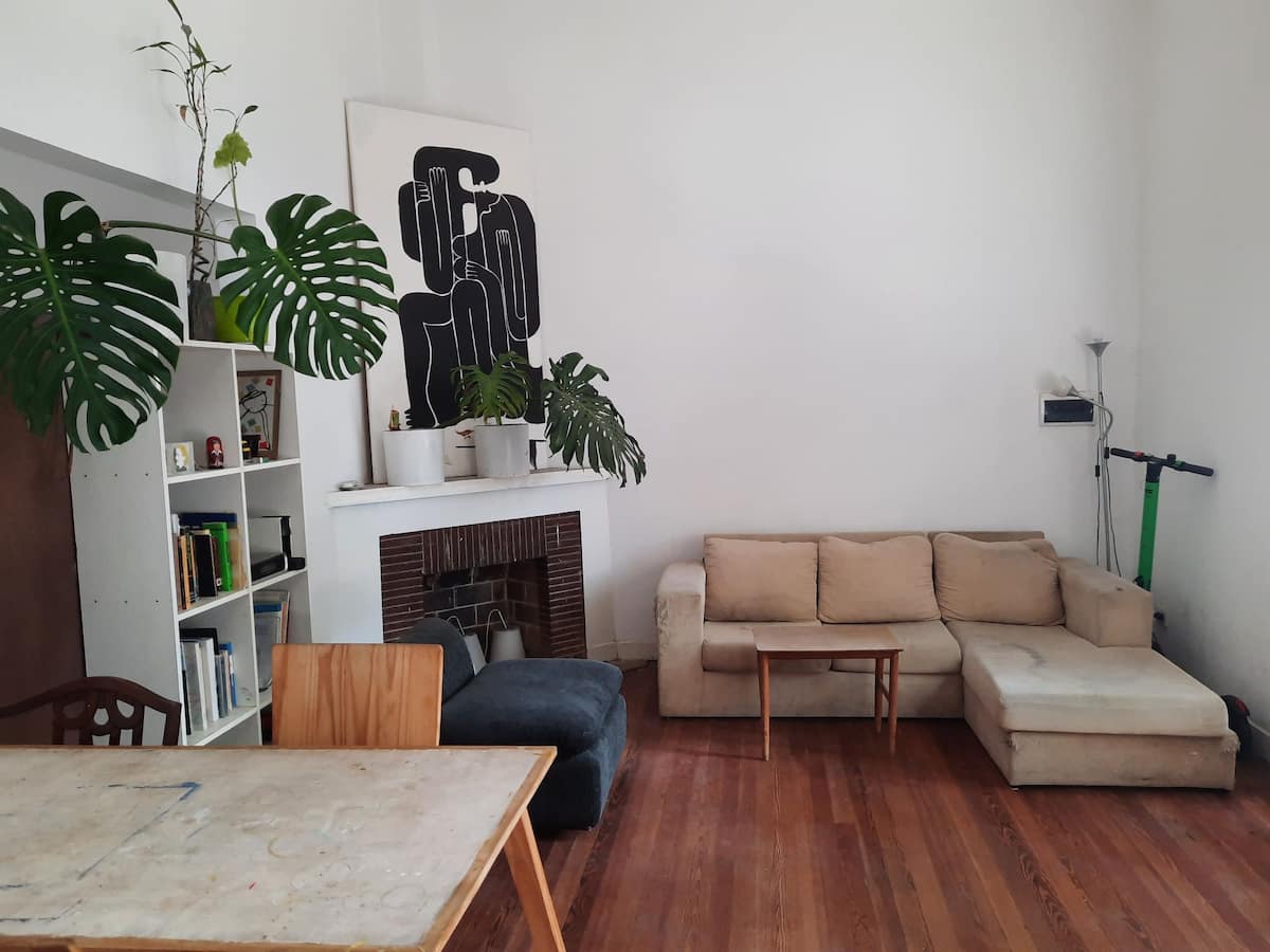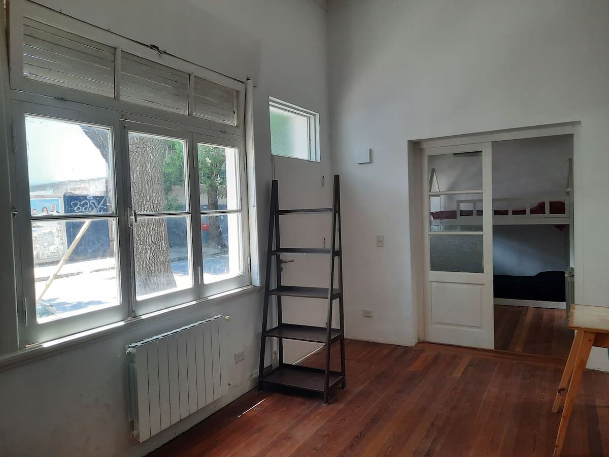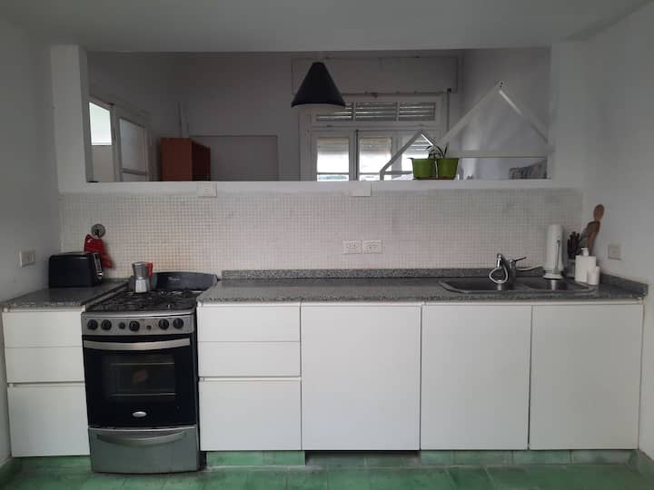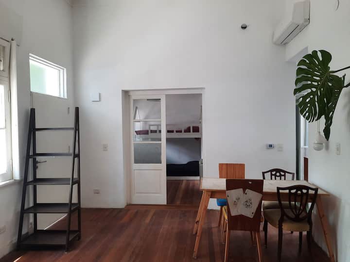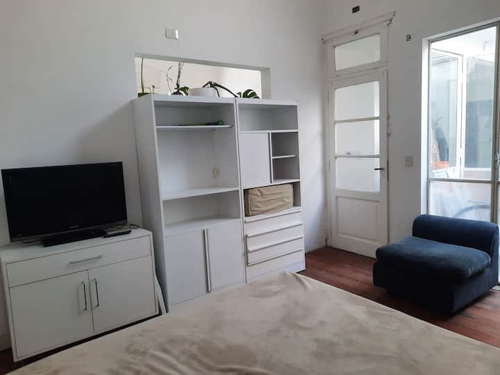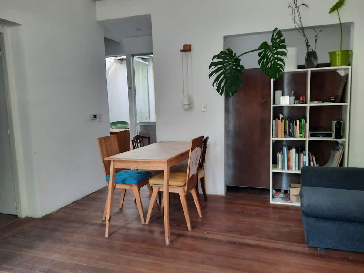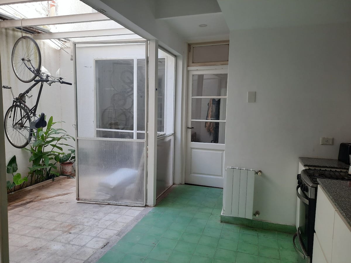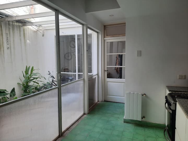 Квартира с 3 комнатами и небольшим внутренним патио в Saavedra, в районе с озеленёнными улицами. Патио выходит наружу; дом находится примерно в 3 кварталах от Saavedra Park. В объявлении отмечено, что на фото есть расхождения с текущей обстановкой: обновлён обеденный стол и вместо кресла установлены 2 кресла. Фактическое расположение указано вблизи Cabildo, около 5 кварталов, а также рядом с северным выездом из города в сторону реки или дельты.