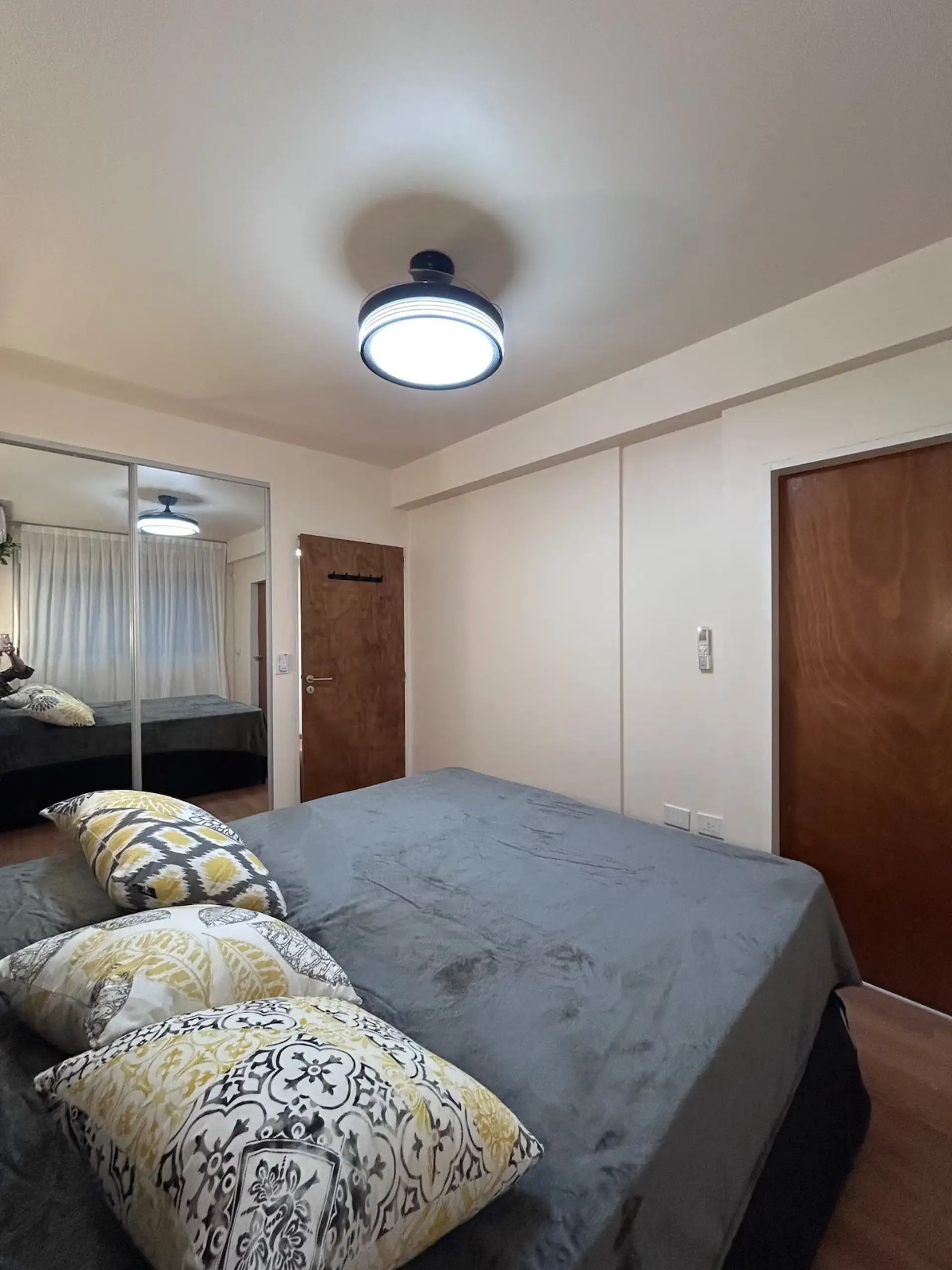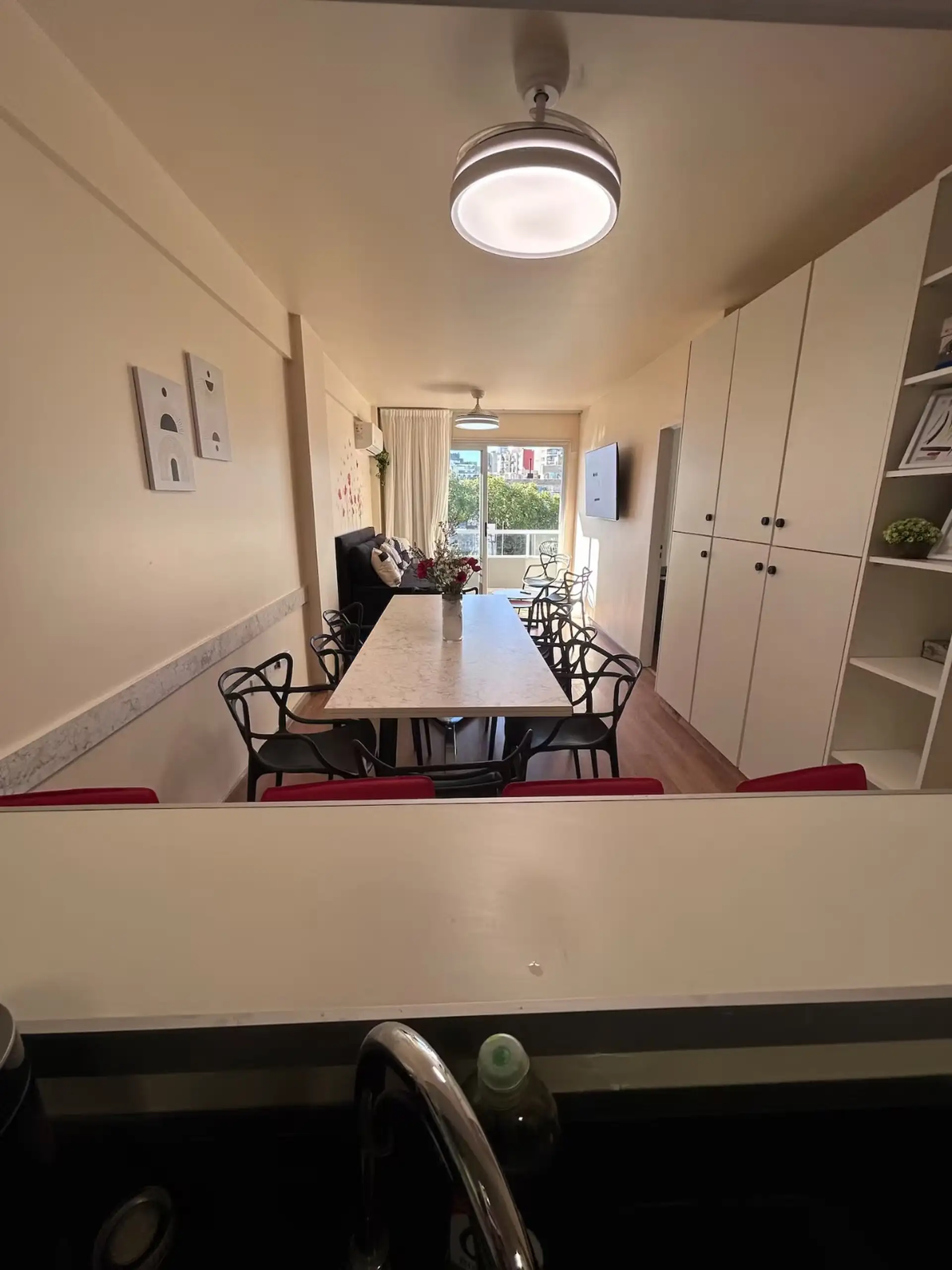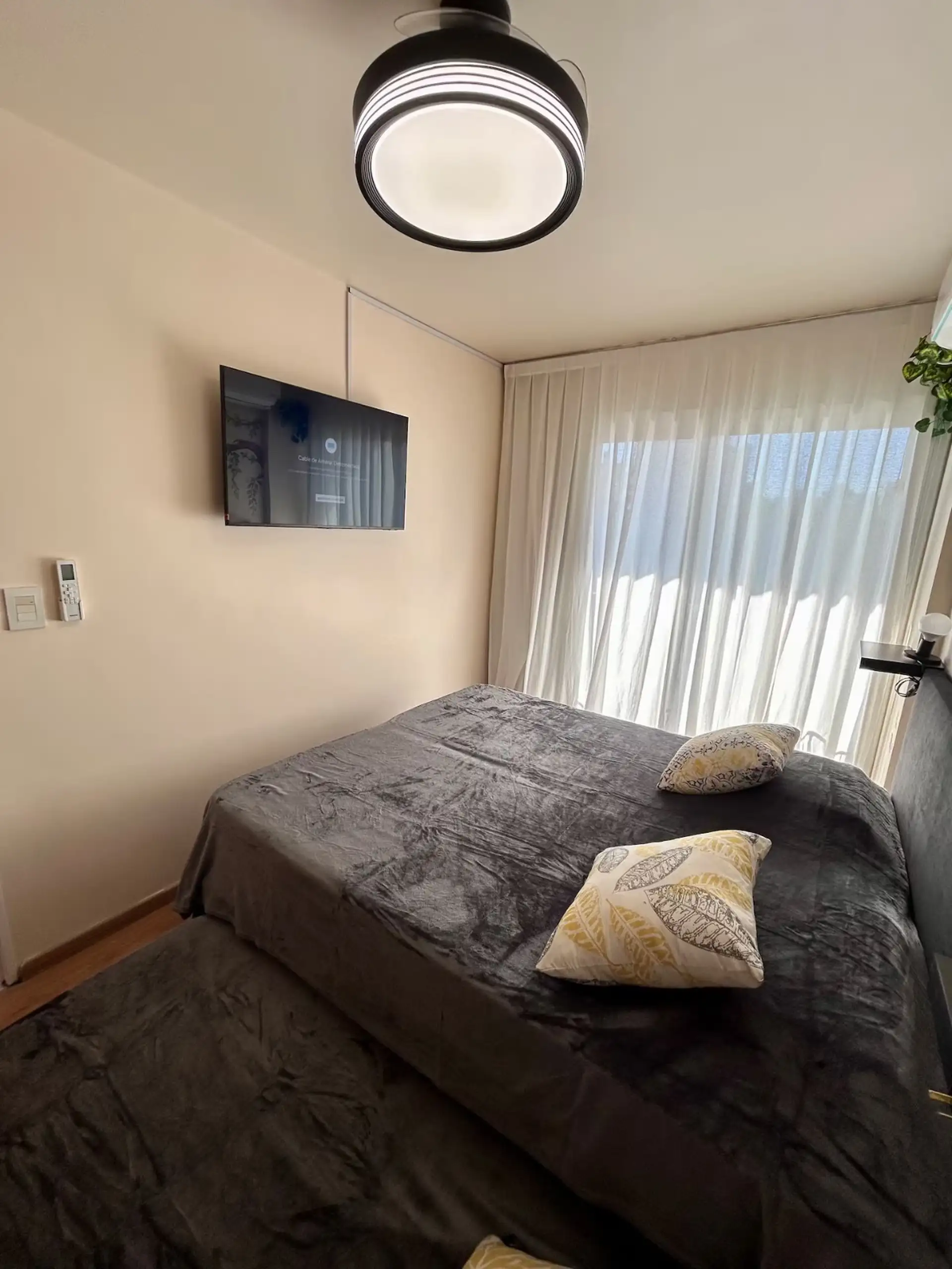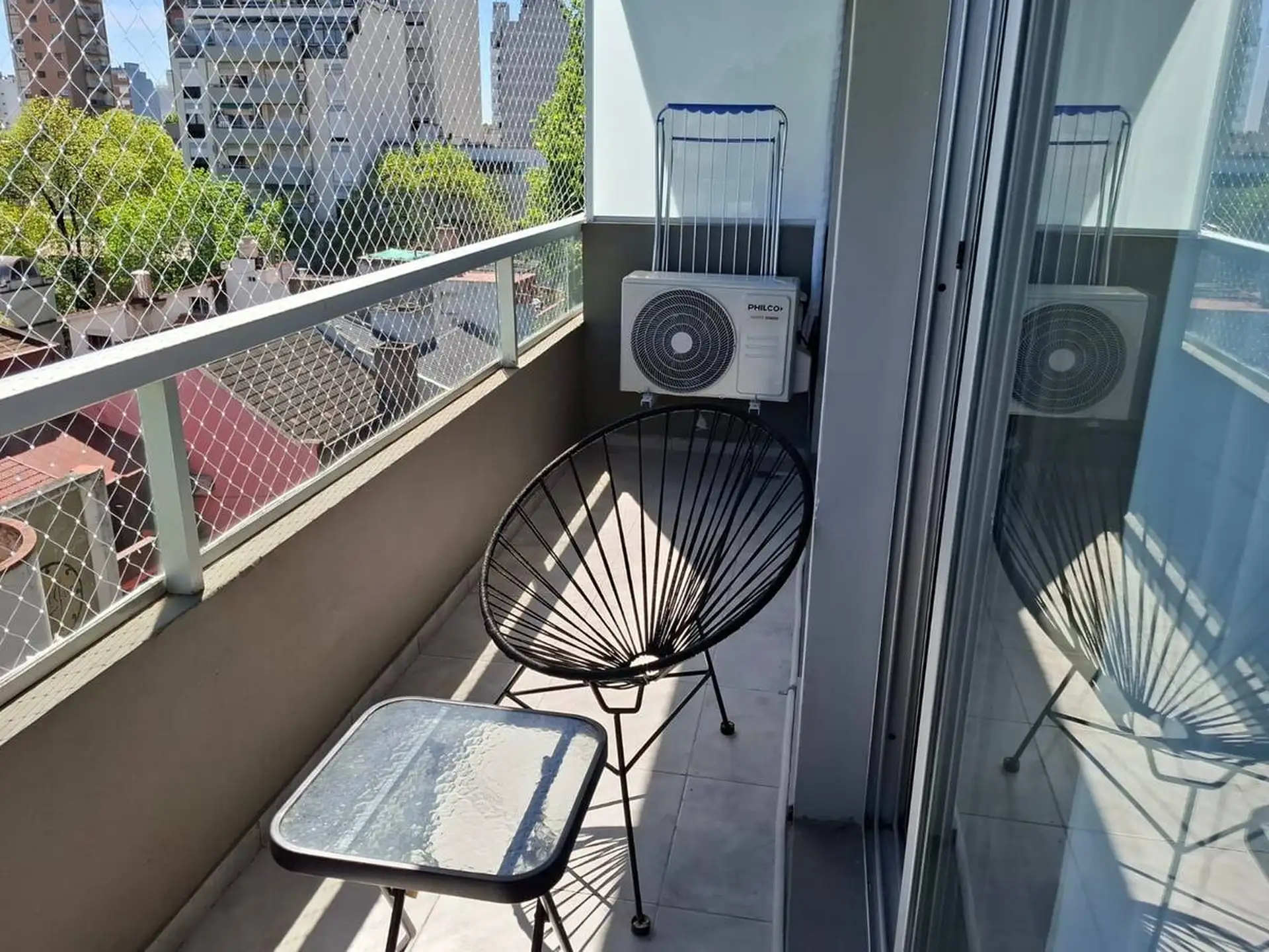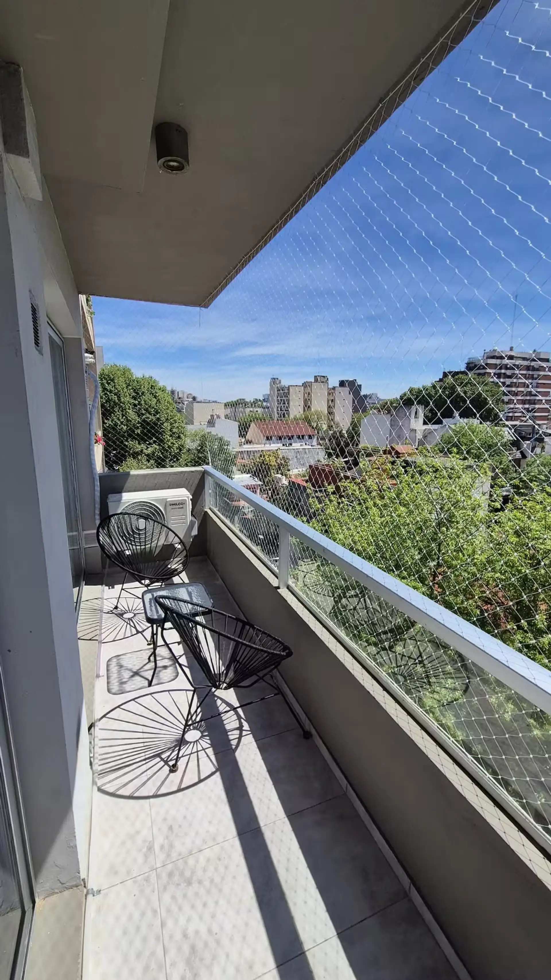 Квартира в аренду на временный срок в Nuñez между Ciudad de la Paz и Amenabar. Планировка с 2 спальнями (в одной из них предусмотрены ванные комнаты в suite) и балконом с окнами и защитным ограждением. В гостиной установлены столы для обеда, телевизор Samsung 50" и адаптеры для международных розеток, предусмотрено рабочее место. В квартире есть 3 кондиционера холод/тепло (2 новых inverter) и потолочные вентиляторы, кухня полностью оборудована: холодильник с морозильной камерой, микроволновая печ
