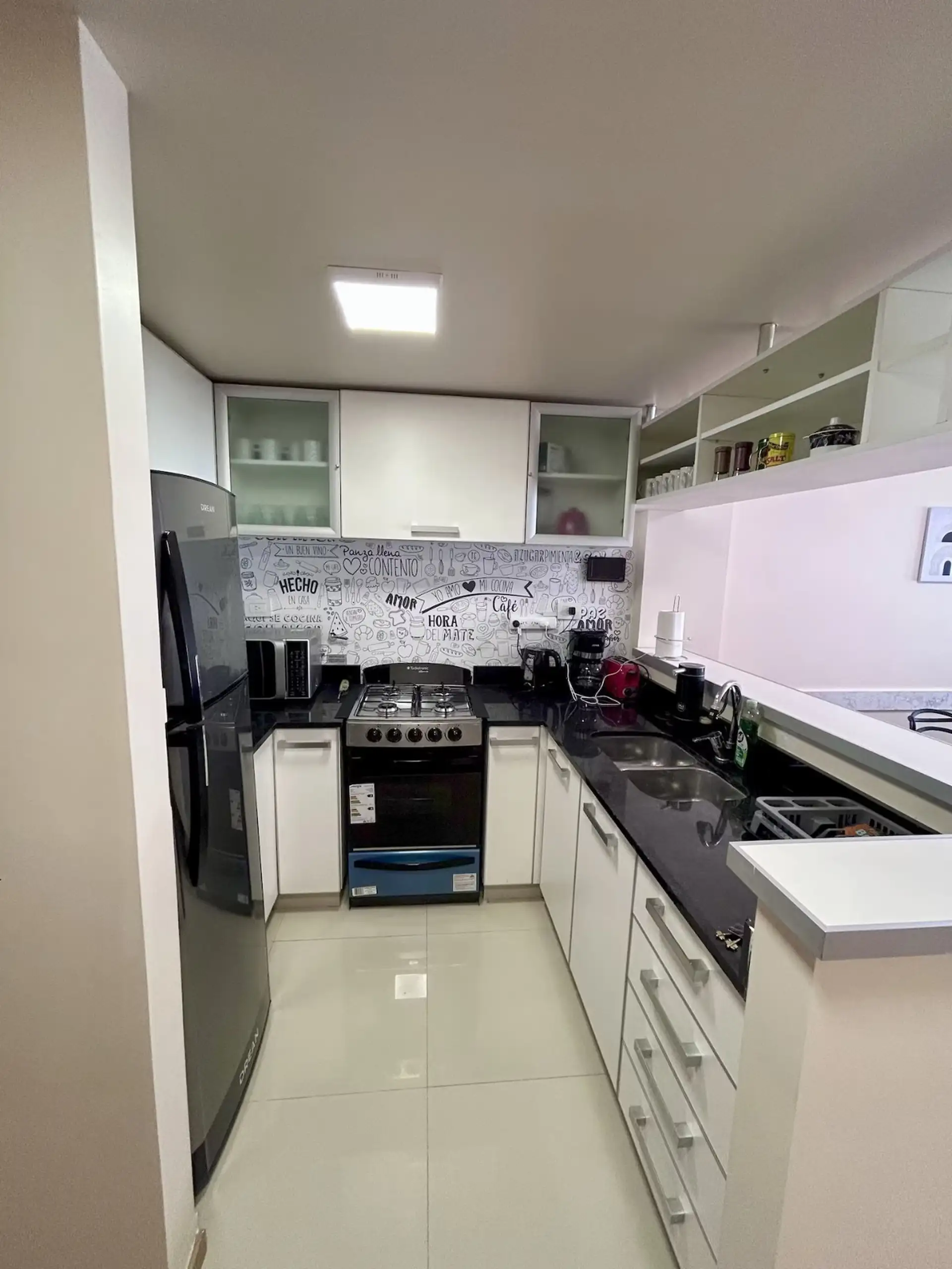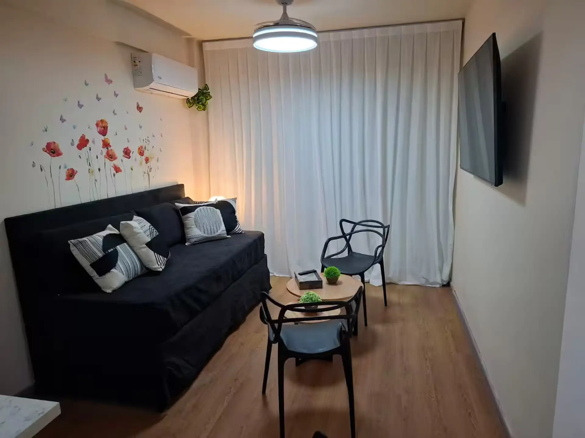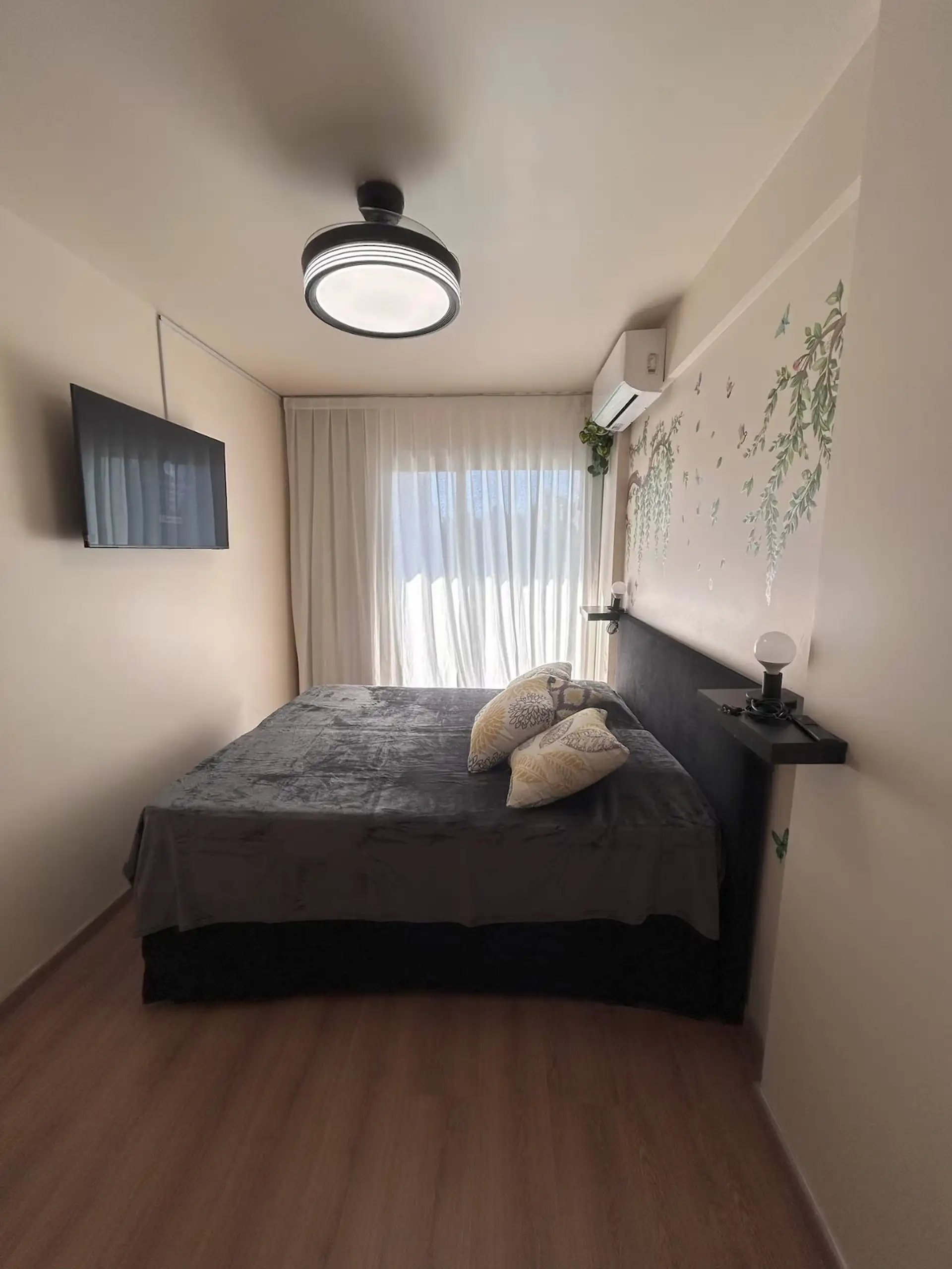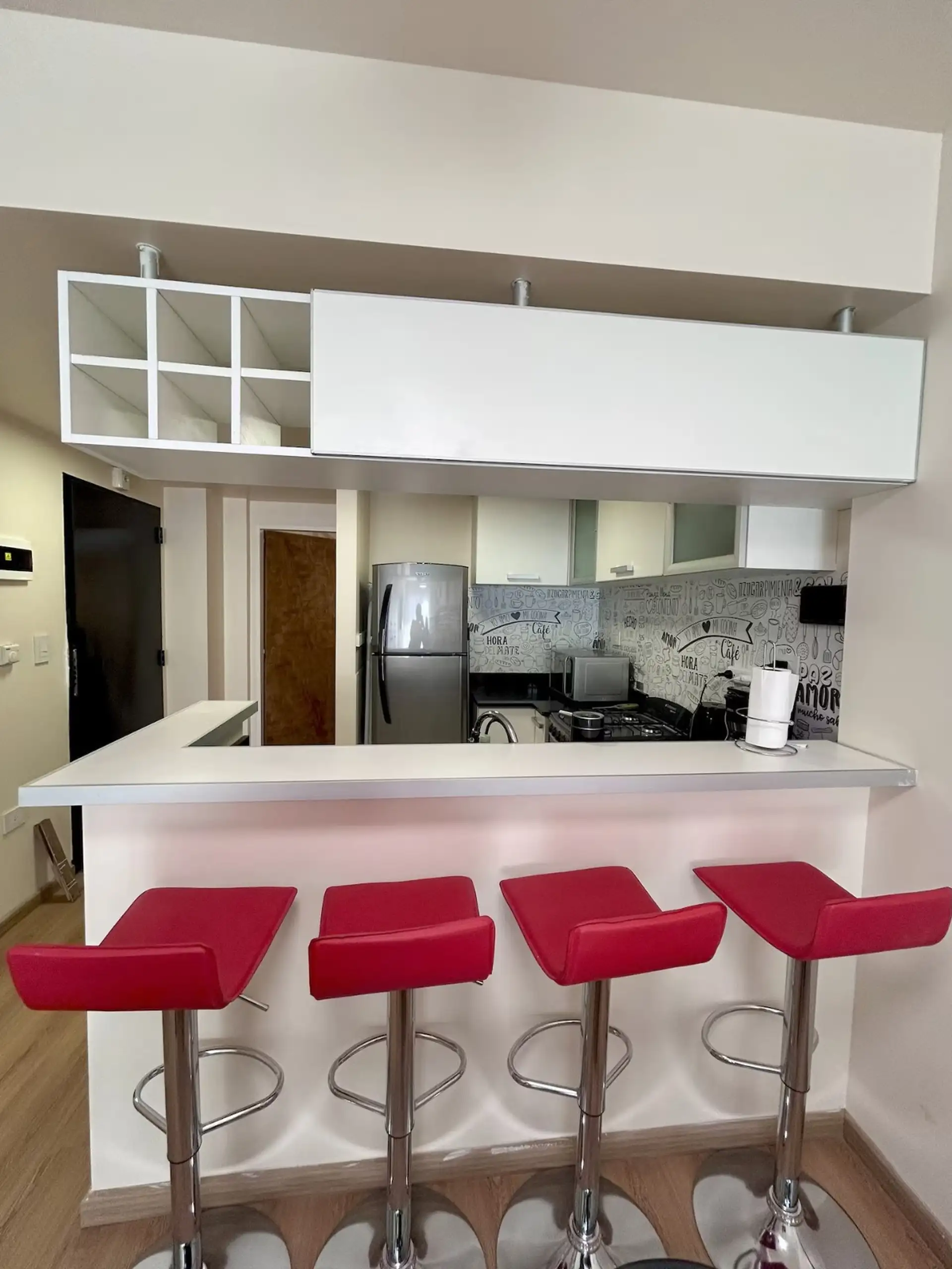 Квартира в аренду на временный срок в Nuñez между Ciudad de la Paz и Amenabar. Планировка с 2 спальнями (в одной из них предусмотрены ванные комнаты в suite) и балконом с окнами и защитным ограждением. В гостиной установлены столы для обеда, телевизор Samsung 50" и адаптеры для международных розеток, предусмотрено рабочее место. В квартире есть 3 кондиционера холод/тепло (2 новых inverter) и потолочные вентиляторы, кухня полностью оборудована: холодильник с морозильной камерой, микроволновая печ