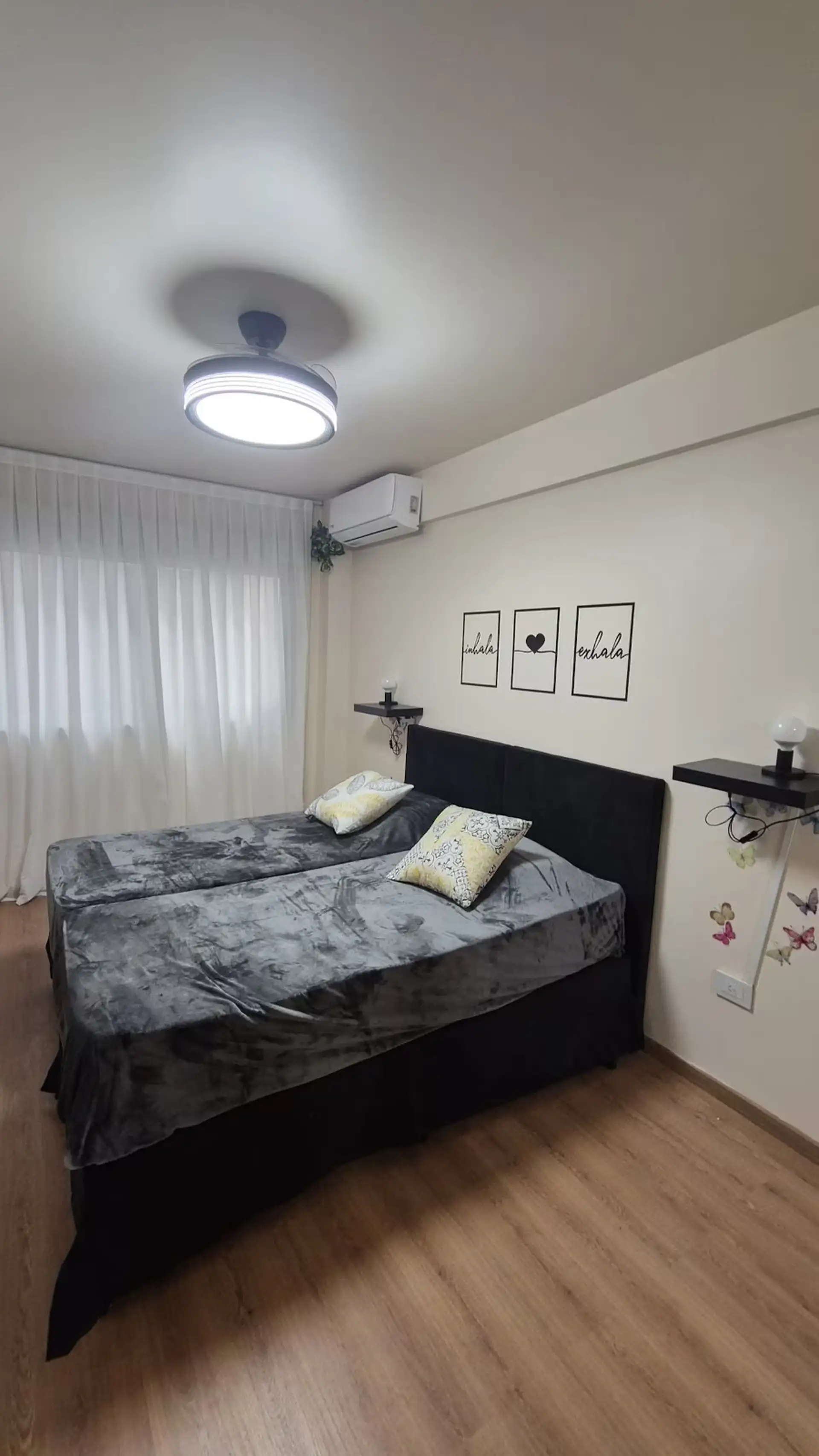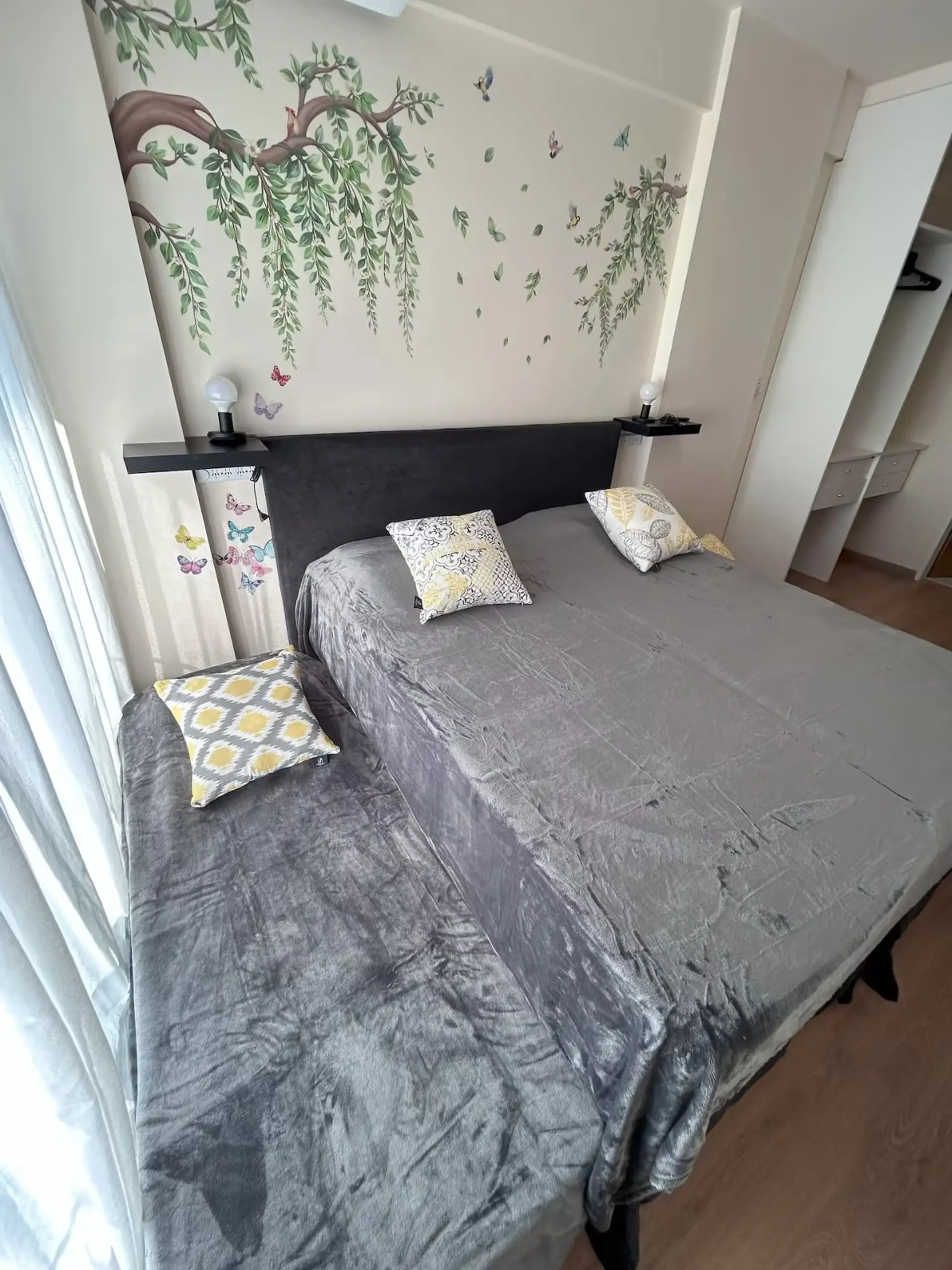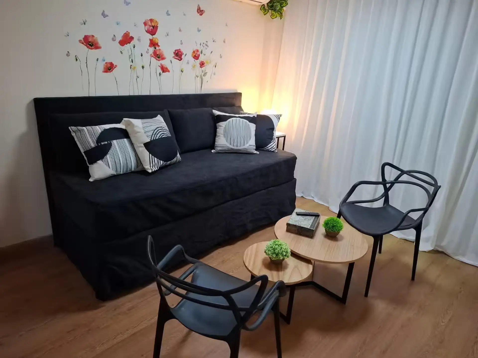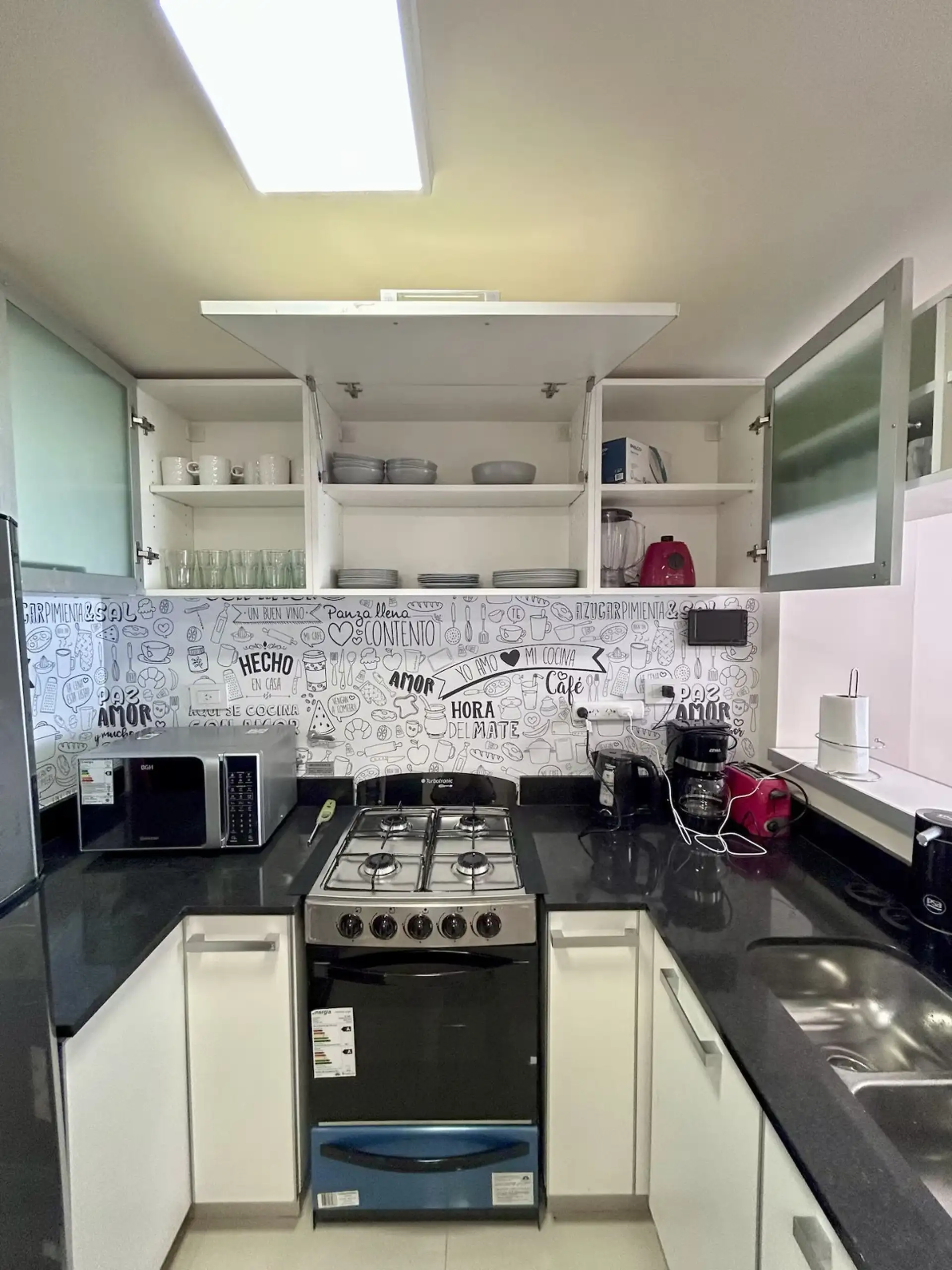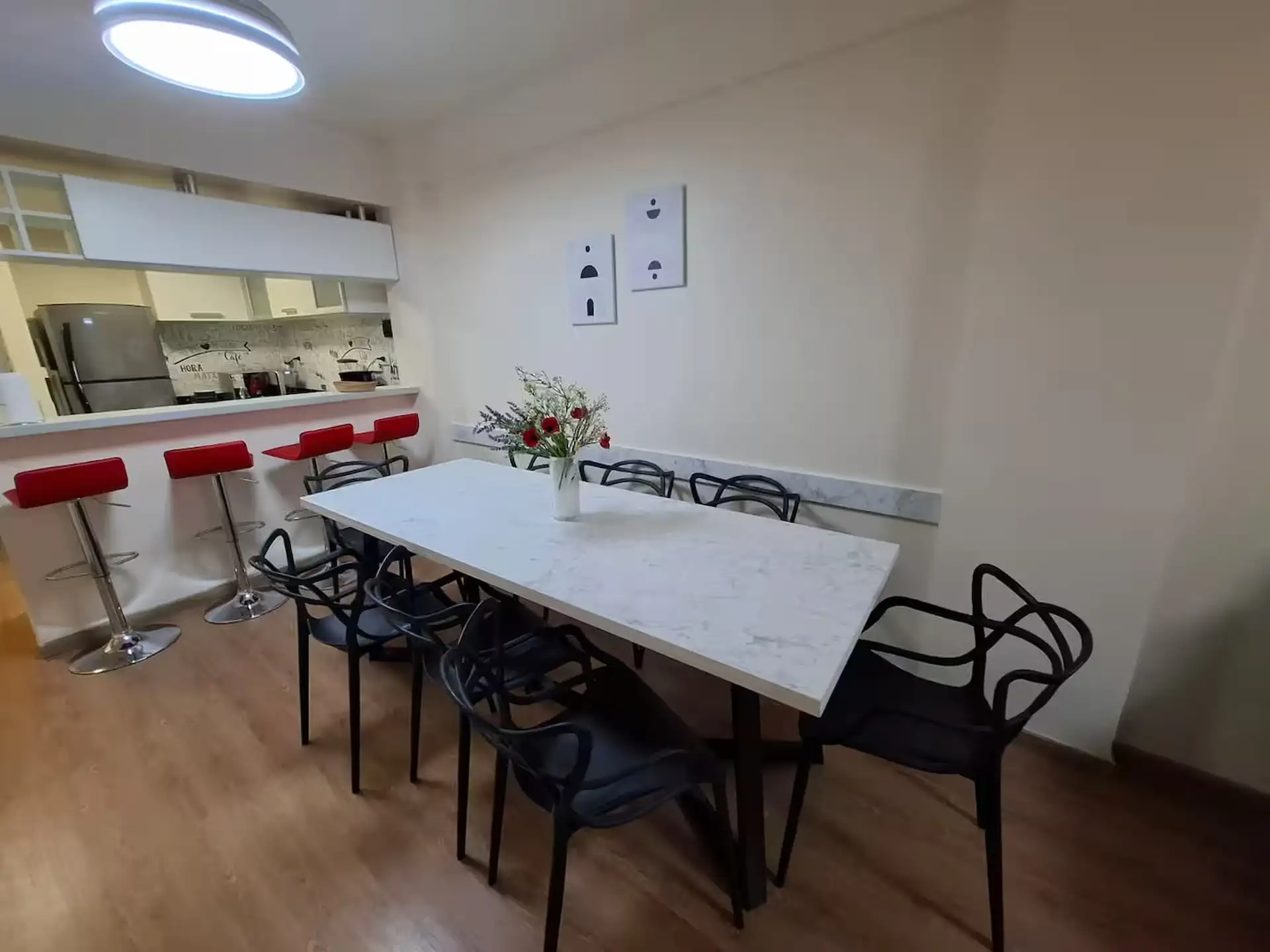 Квартира в аренду на временный срок в Nuñez между Ciudad de la Paz и Amenabar. Планировка с 2 спальнями (в одной из них предусмотрены ванные комнаты в suite) и балконом с окнами и защитным ограждением. В гостиной установлены столы для обеда, телевизор Samsung 50" и адаптеры для международных розеток, предусмотрено рабочее место. В квартире есть 3 кондиционера холод/тепло (2 новых inverter) и потолочные вентиляторы, кухня полностью оборудована: холодильник с морозильной камерой, микроволновая печ