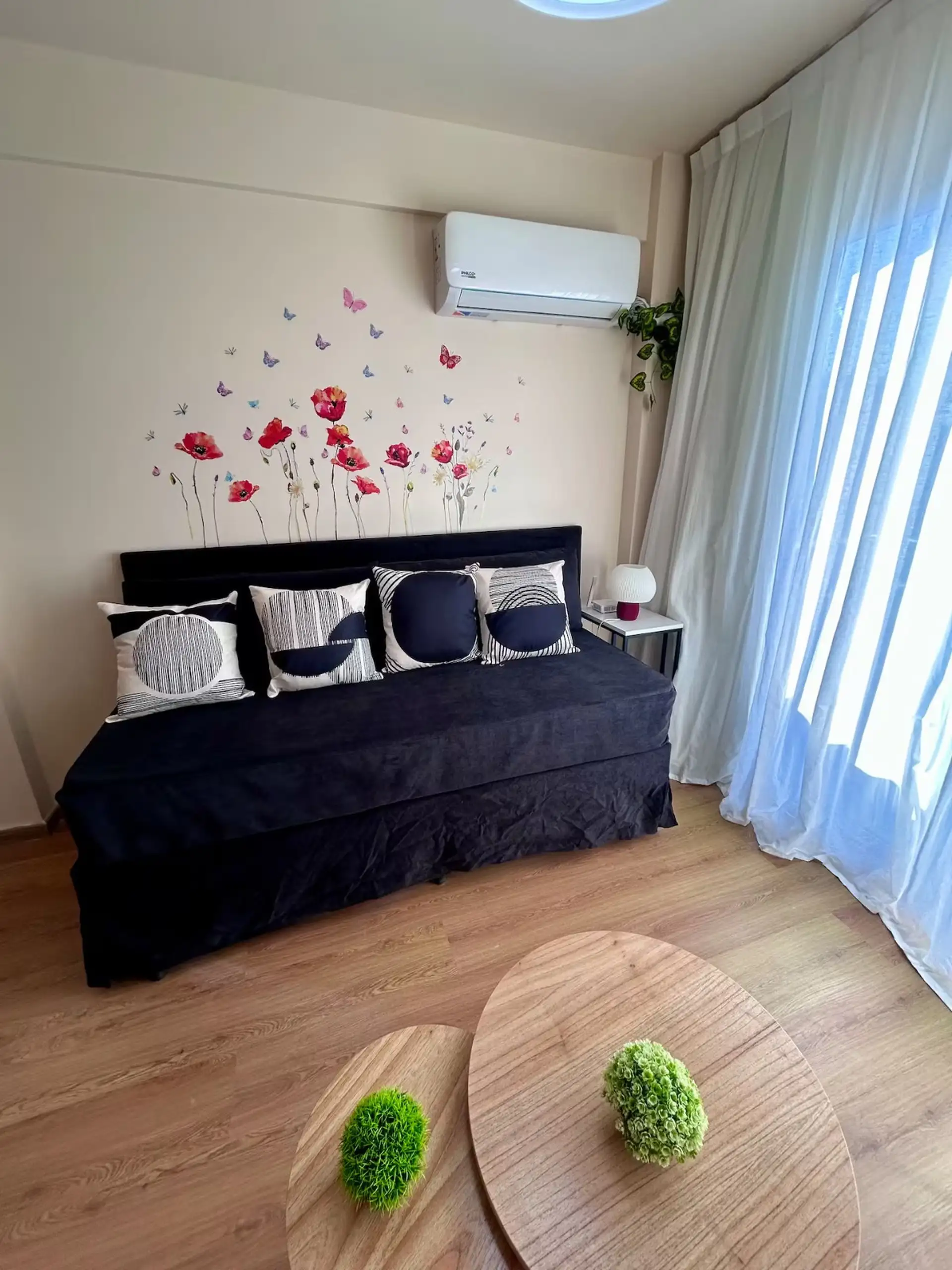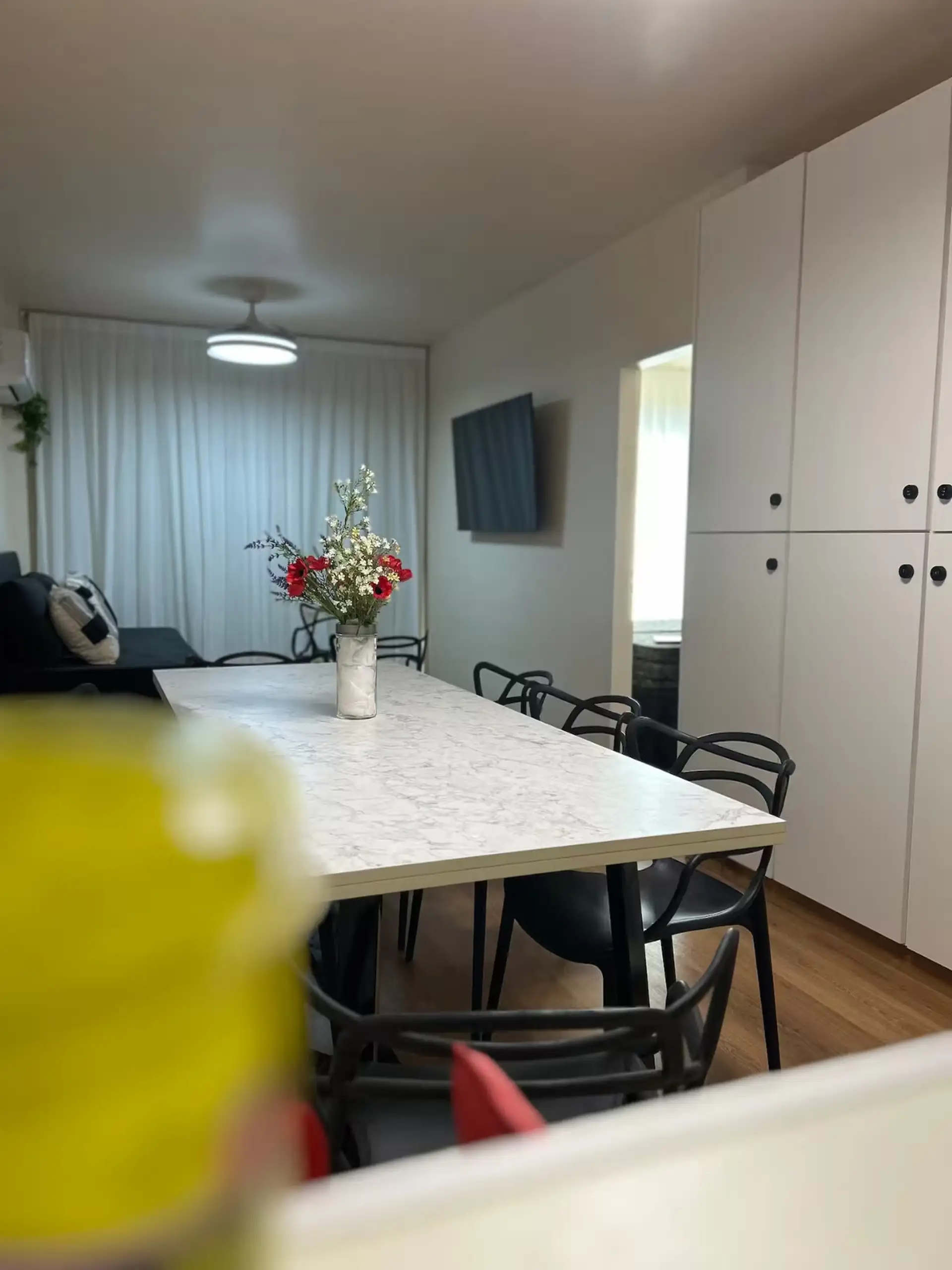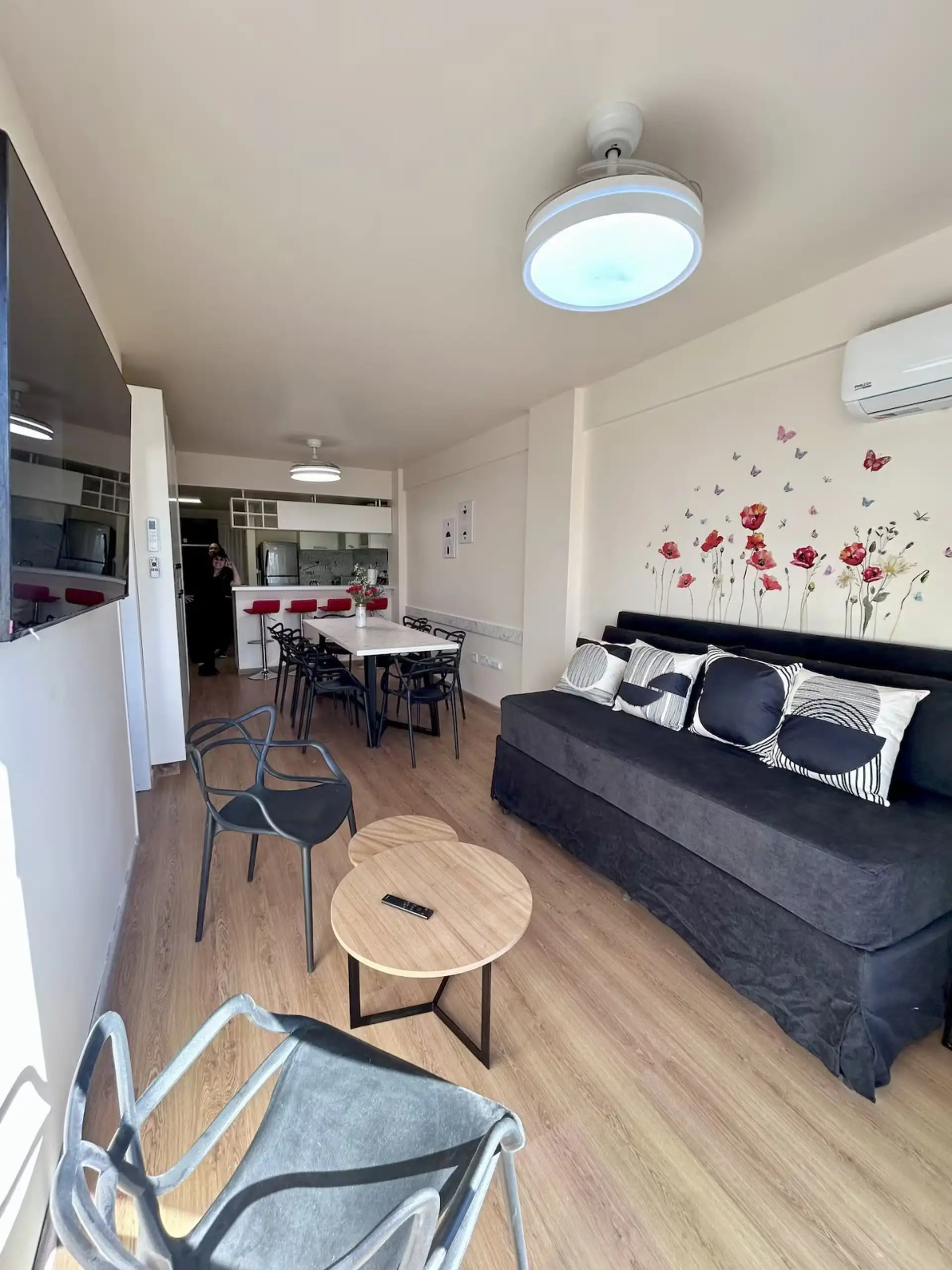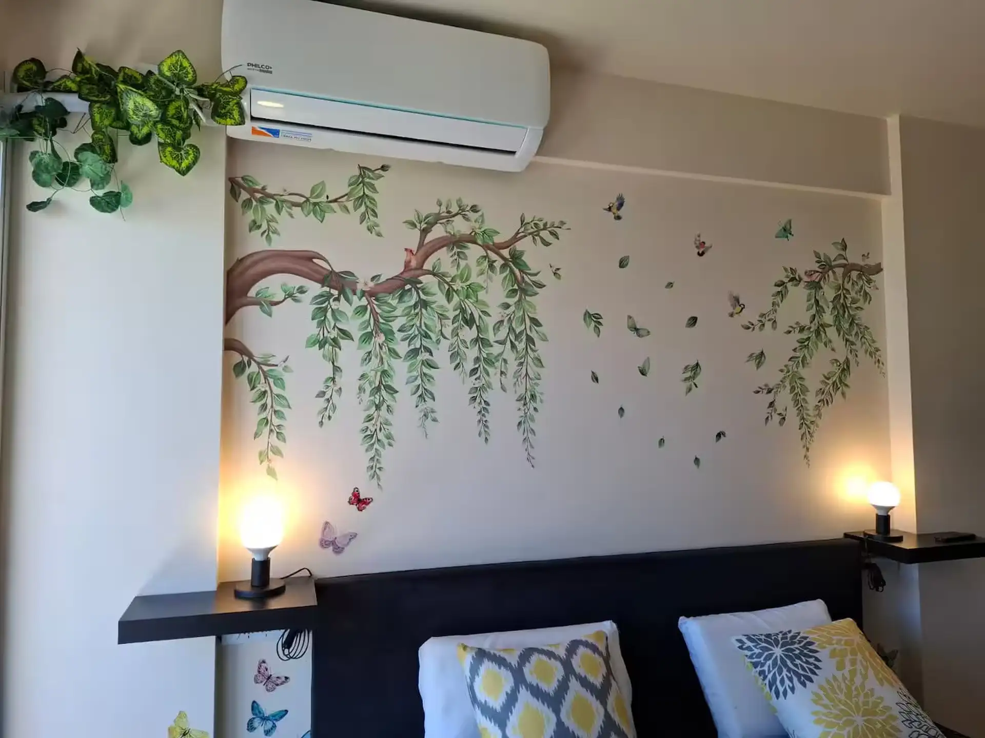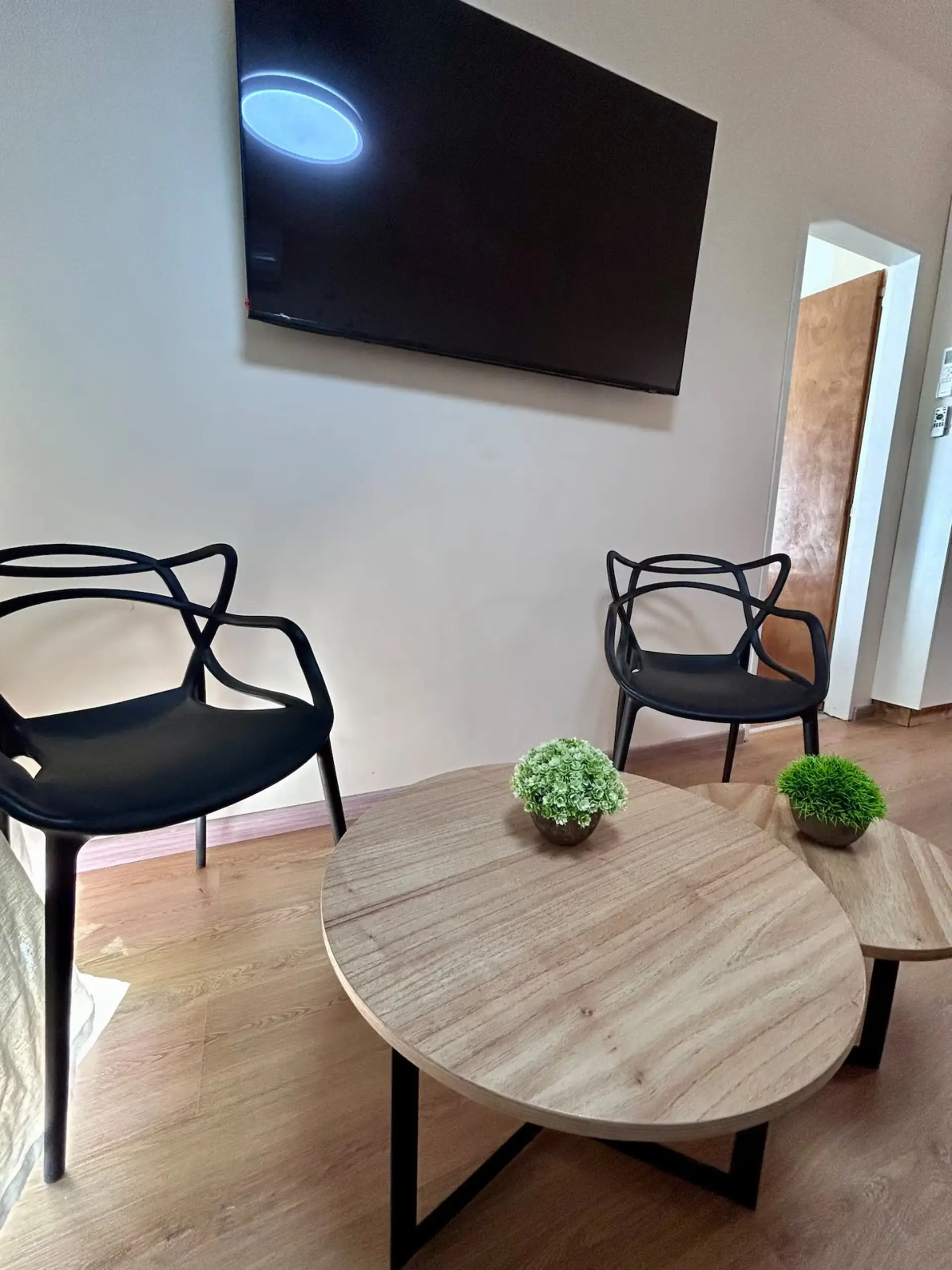 Квартира в аренду на временный срок в Nuñez между Ciudad de la Paz и Amenabar. Планировка с 2 спальнями (в одной из них предусмотрены ванные комнаты в suite) и балконом с окнами и защитным ограждением. В гостиной установлены столы для обеда, телевизор Samsung 50" и адаптеры для международных розеток, предусмотрено рабочее место. В квартире есть 3 кондиционера холод/тепло (2 новых inverter) и потолочные вентиляторы, кухня полностью оборудована: холодильник с морозильной камерой, микроволновая печ
