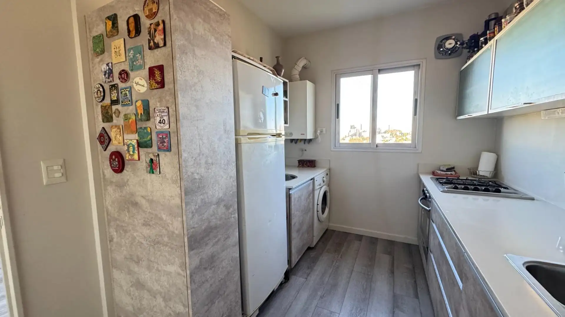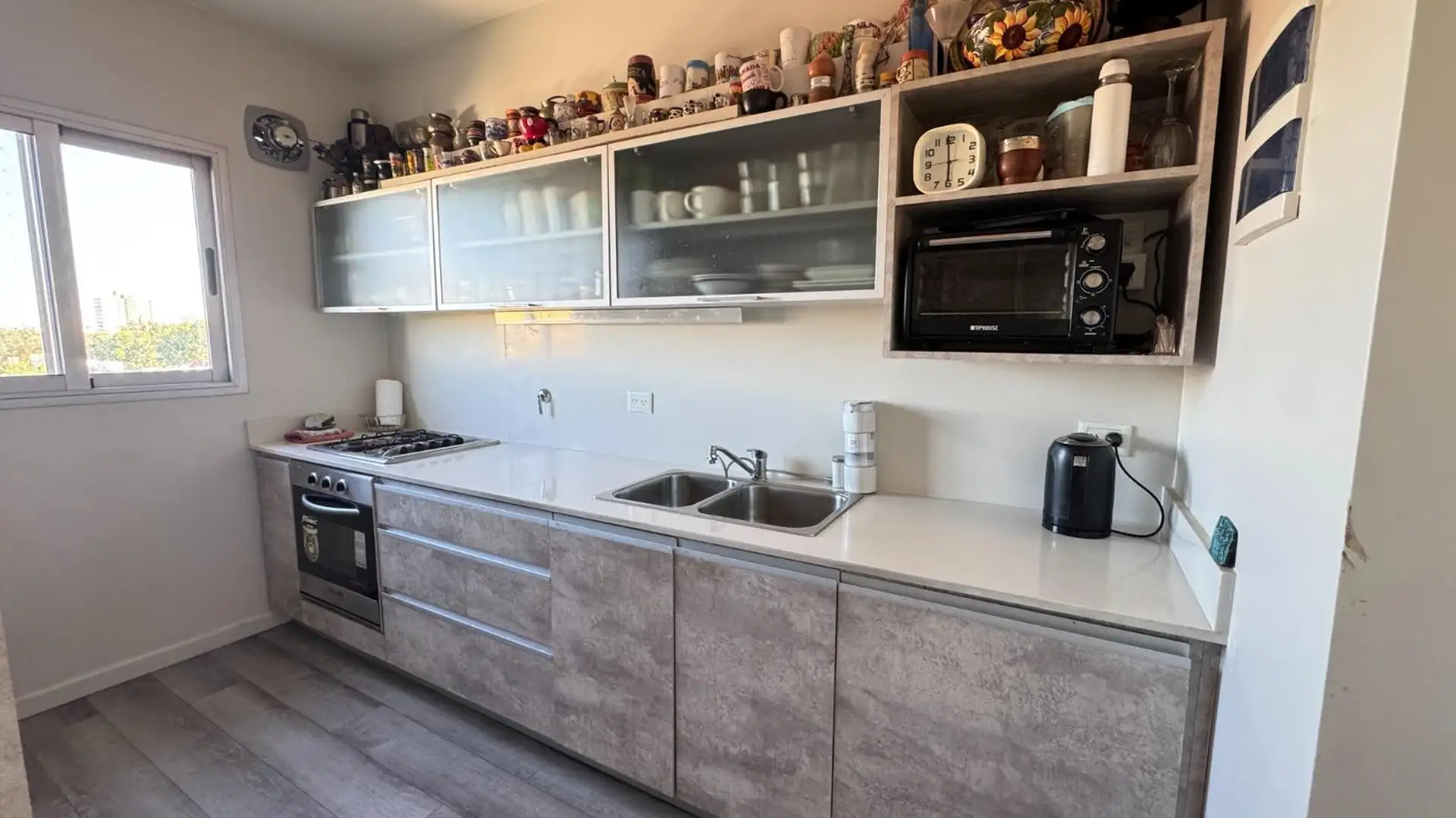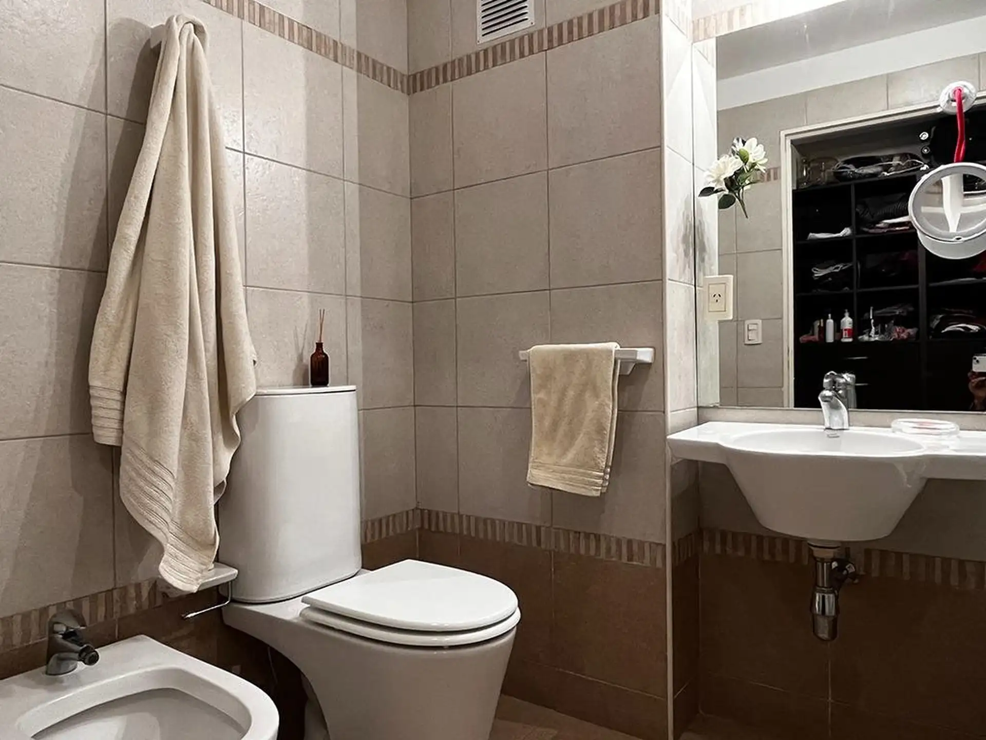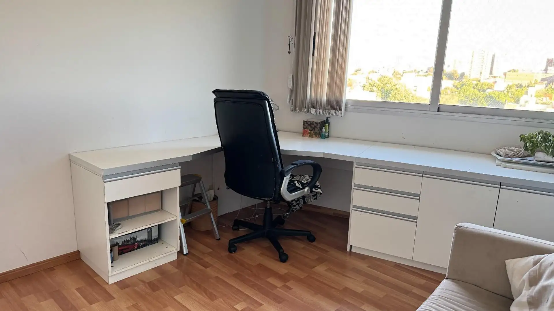 Квартира в аренду на время в комплексе Tronador в Saavedra: 3 комнаты, 86 m² крытых, 2 ванных комнаты. Окна с ориентацией юг/восток, балкон с открытым видом; мебель и техника включены. В квартире установлены цифровой замок и москитные сетки на всех окнах, кондиционер в каждой комнате, есть Wi‑Fi. Спальни: в главной кровать Queen, во второй комнате/кабинете двуспальный диван-кровать, рабочий стол и шкаф. Кухня полностью оборудована: холодильник, электрическая духовка и газовые конфорки, стиральна