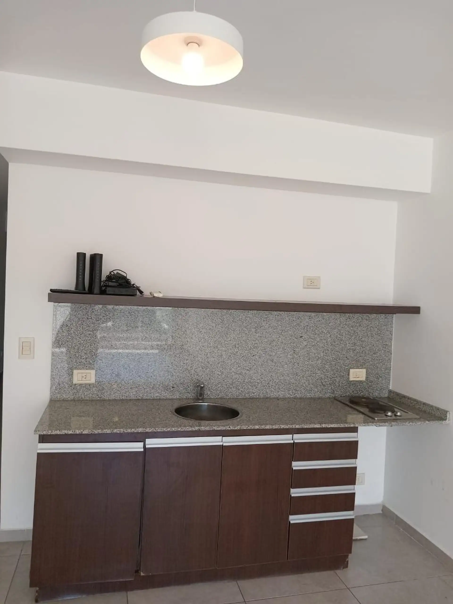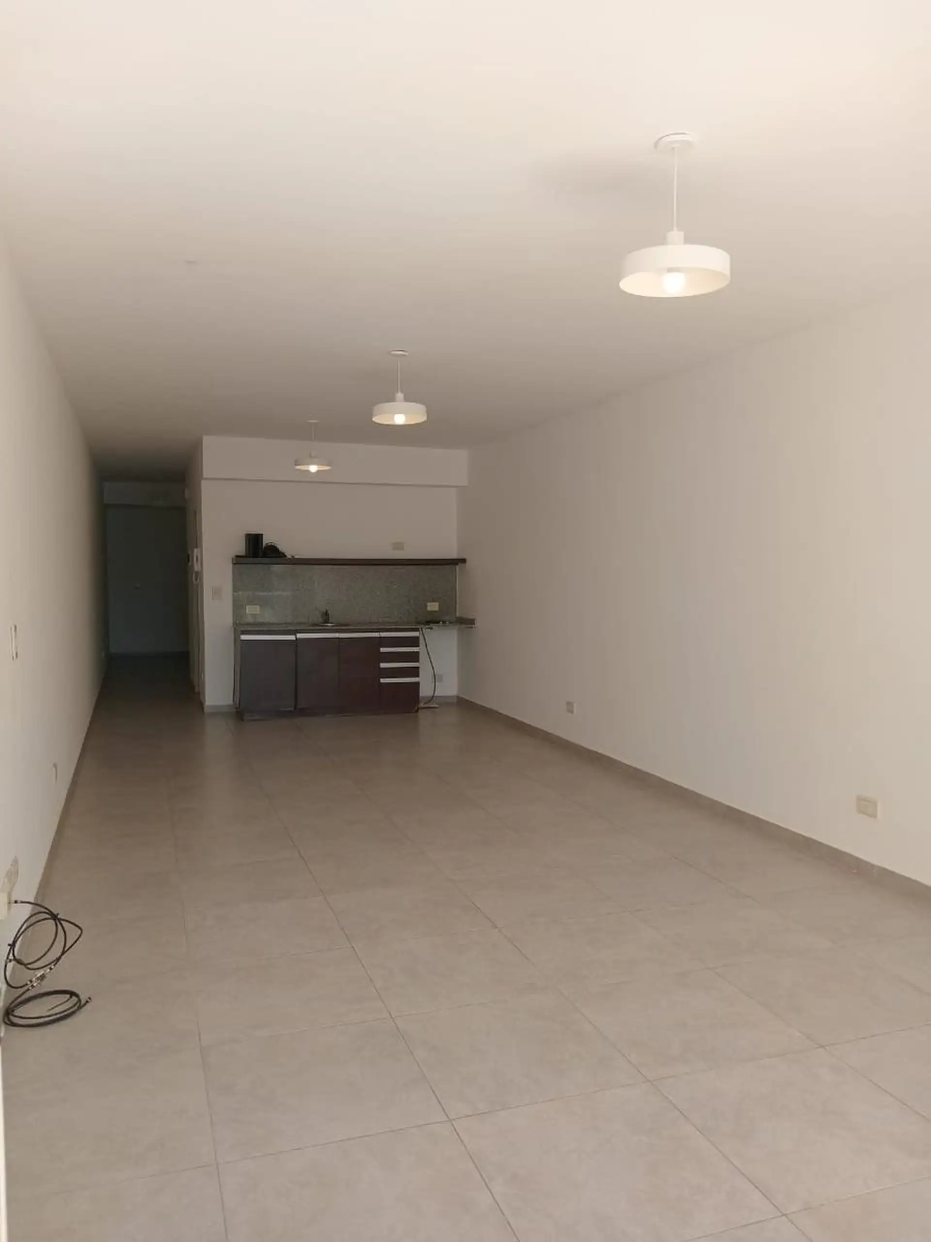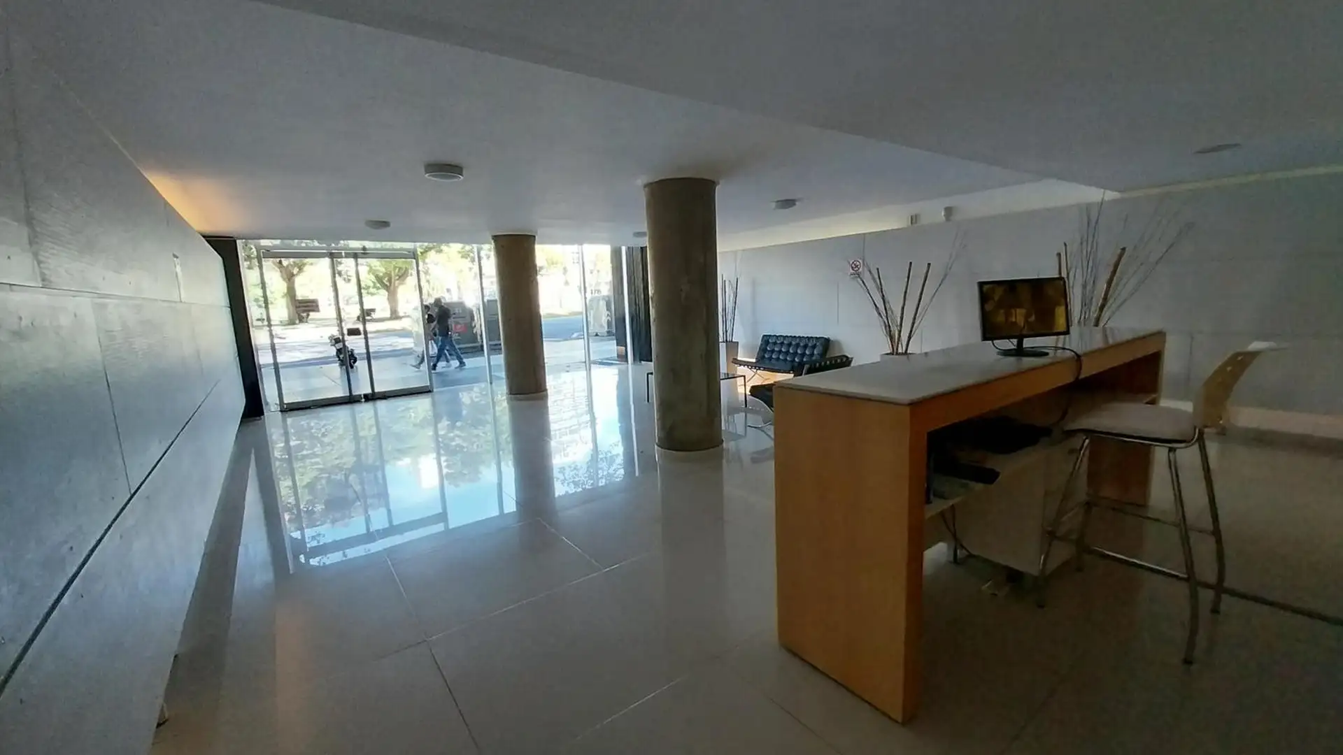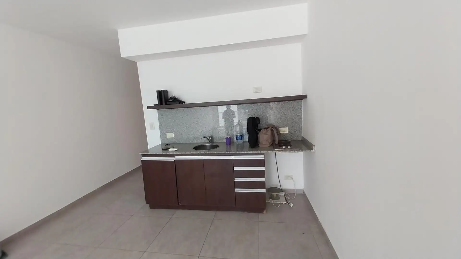 Квартира-студия площадью в описании не указана, с окнами на север. В гостиной есть кафельный пол белого цвета и большое окно с выходом на балкон. Кухня в американском стиле: гранитная столешница серого цвета, нижние тумбы с навесными секциями и электрическая варочная панель на 2 конфорки. Полная ванная комната с умывальником и ванной, установлен кондиционер холод/тепло (сплит). Коммунальные платежи здания включают AYSA. В здании несколько лет назад отделка, есть общая терраса с зоной гриля и общ
