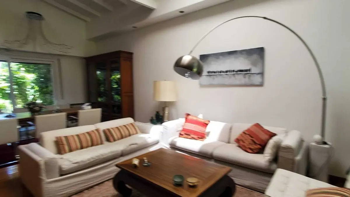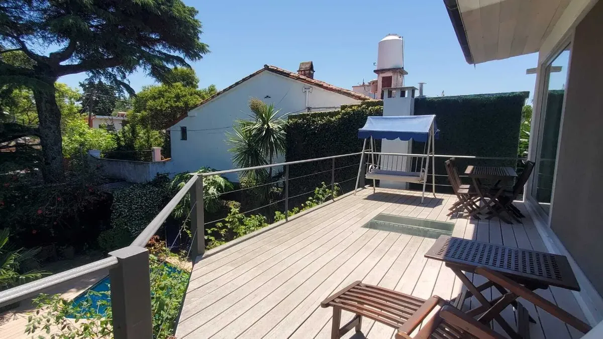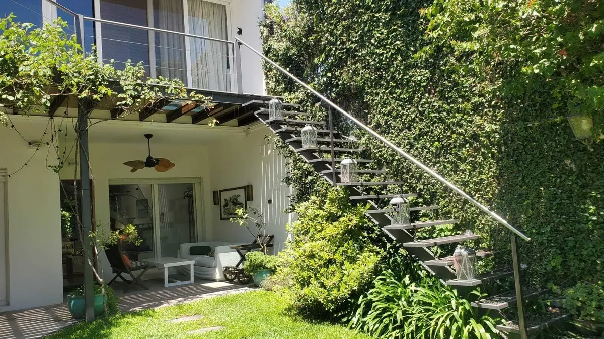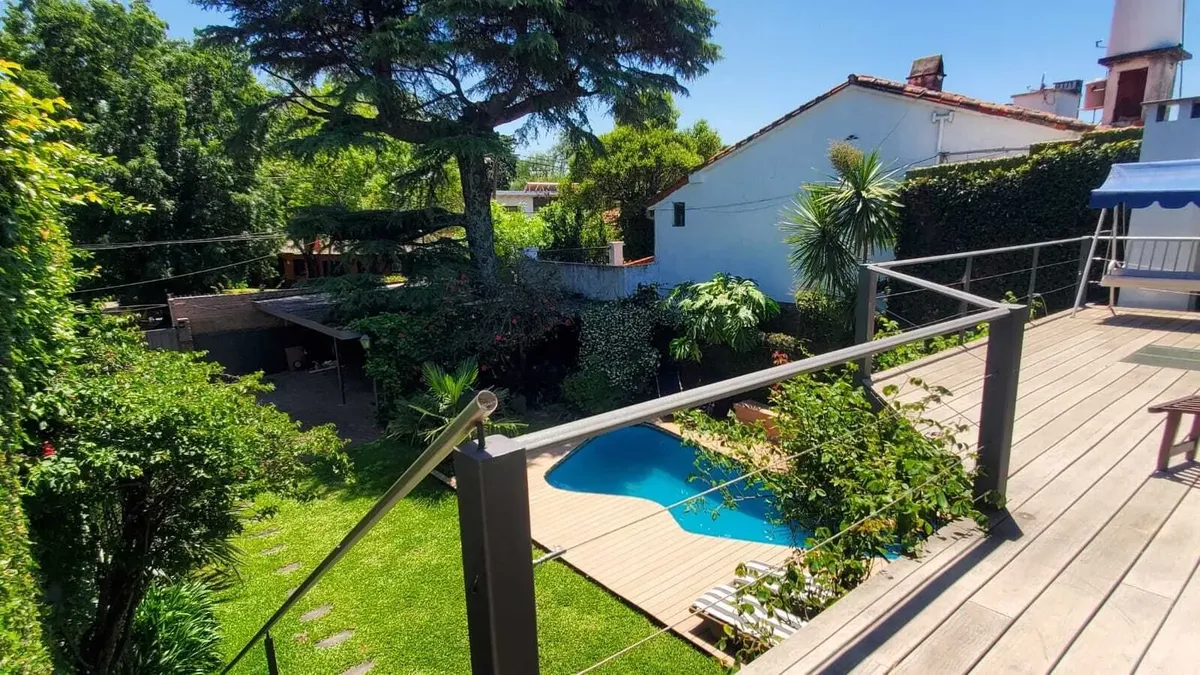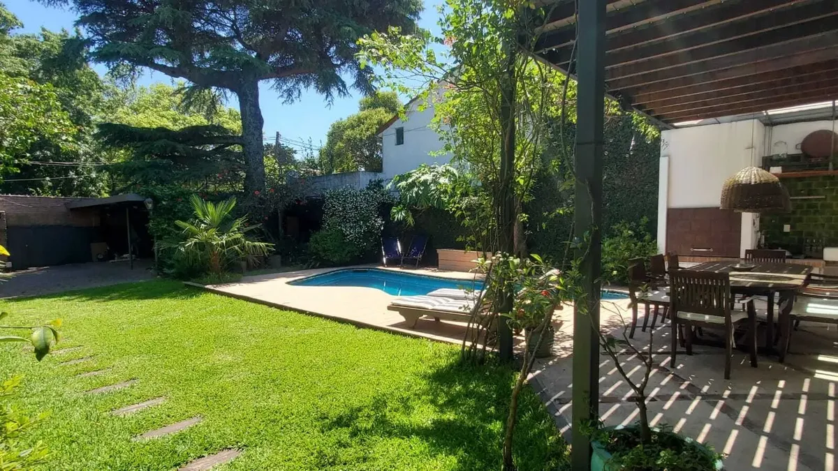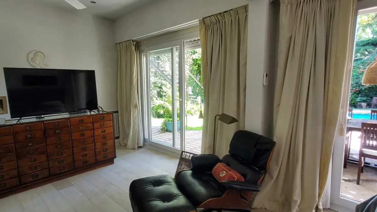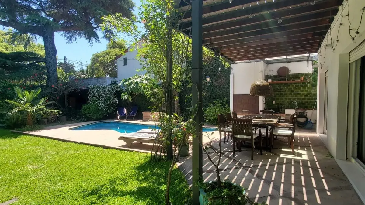 Арендный дом в Acassuso, San Isidro, с 3 спальнями и мебелью. В описании указано расположение в 1 квартале от Libertador со стороны реки. Планировка включает гостиную-столовую с выходом в сад, гостевой туалет, полностью оборудованную кухню и отдельную прачечную; на первом этаже также две спальни ванных комнатами (одна master suite с гардеробной и обновлённой ванной, вторая — с отдельной ванной) с выходом в сад. На втором этаже находятся playroom с выходом на террасу и прямым сообщением с садом,
