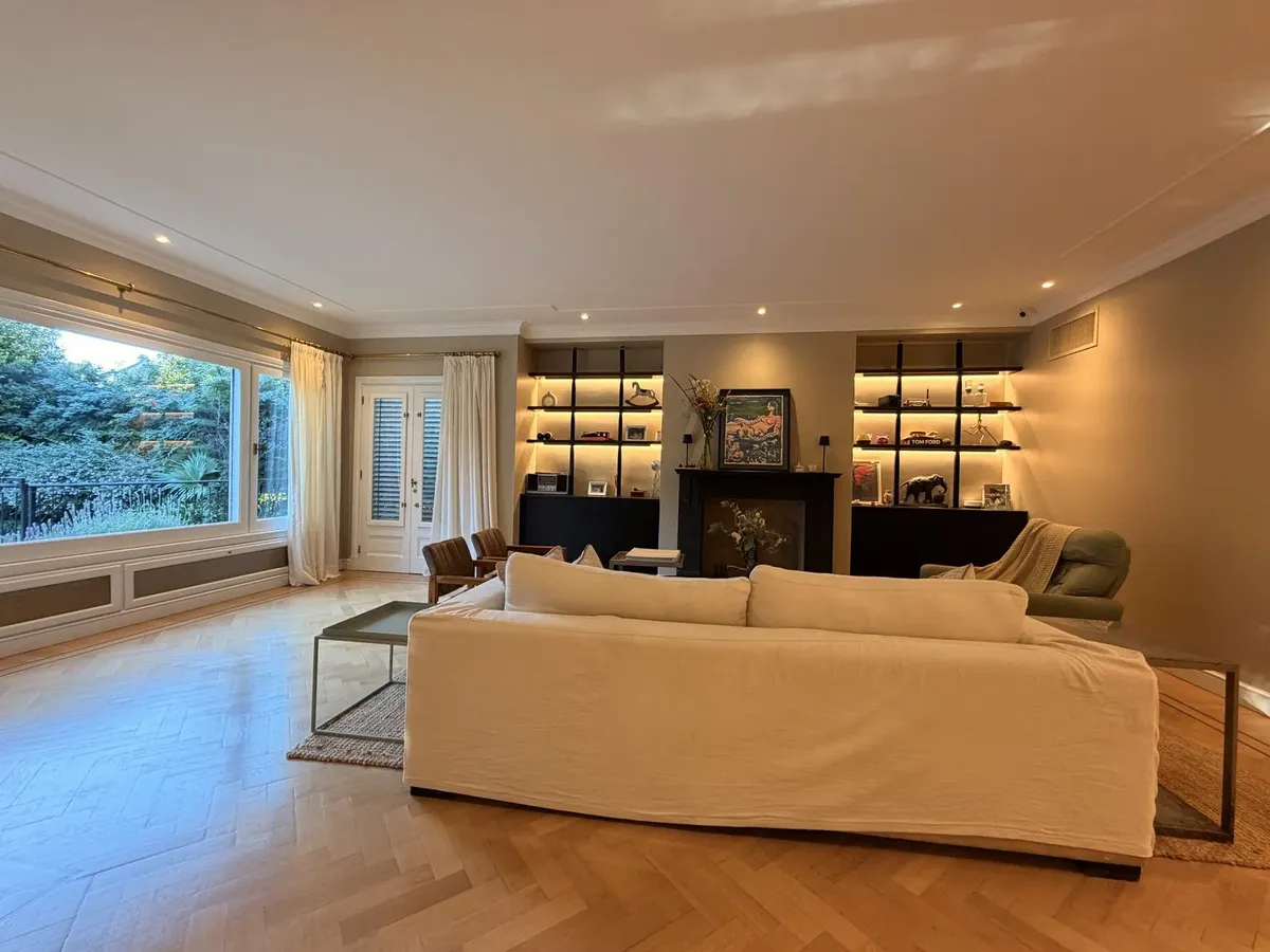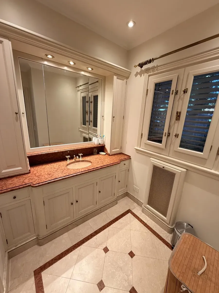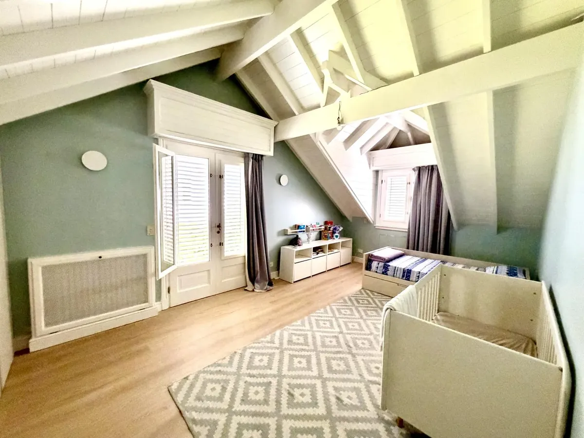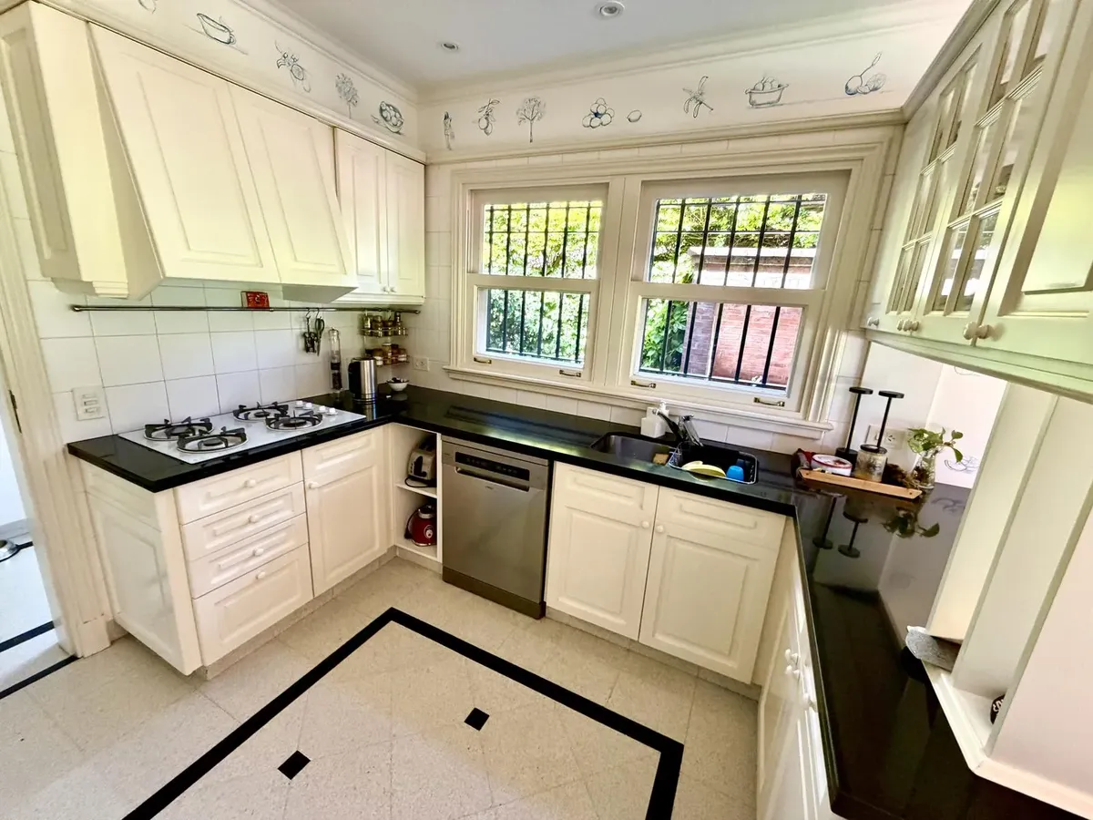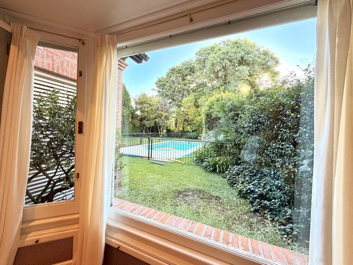 Квартира в Acassuso в Barrio Parque Aguirre в английском стиле, проект архитектора Donaldson. 3 спальни: master suite на первом этаже и 2 спальни наверху, одна примерно 6 x 3,5 m, вторая 3 x 3 m, с общей ванной комнатой с джакузи. Центральное кондиционирование Carrier и отопление радиаторами с котлом Peisa; в ванных — мрамор, деревянные оконные блоки, электрические жалюзи. На первом этаже: просторная приёмная с туалетом, большая гостиная-столовая с выходом в сад, отдельная мастер-спальня с гарде