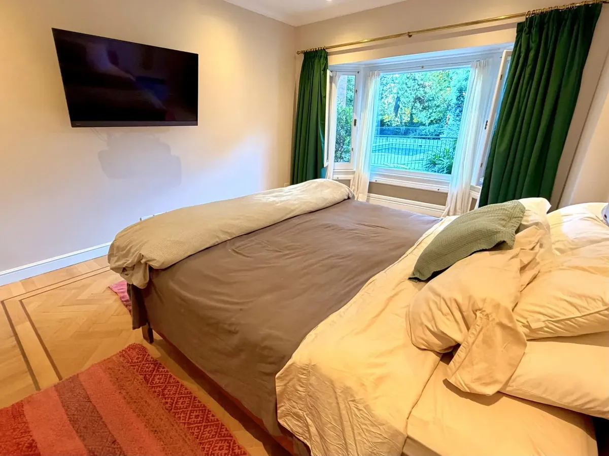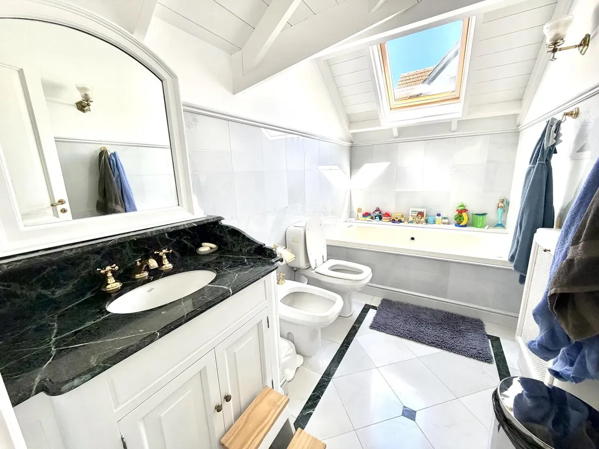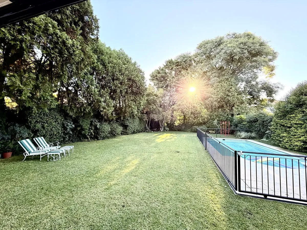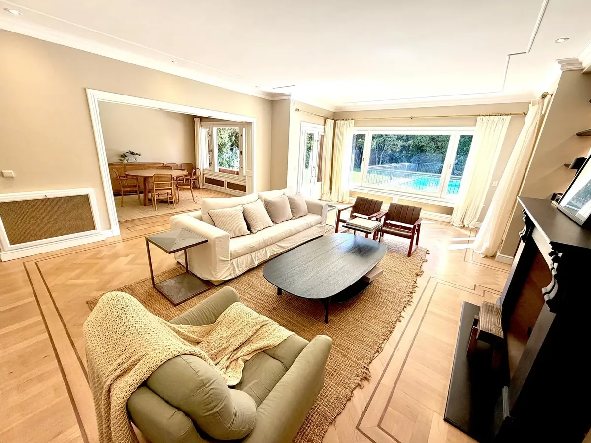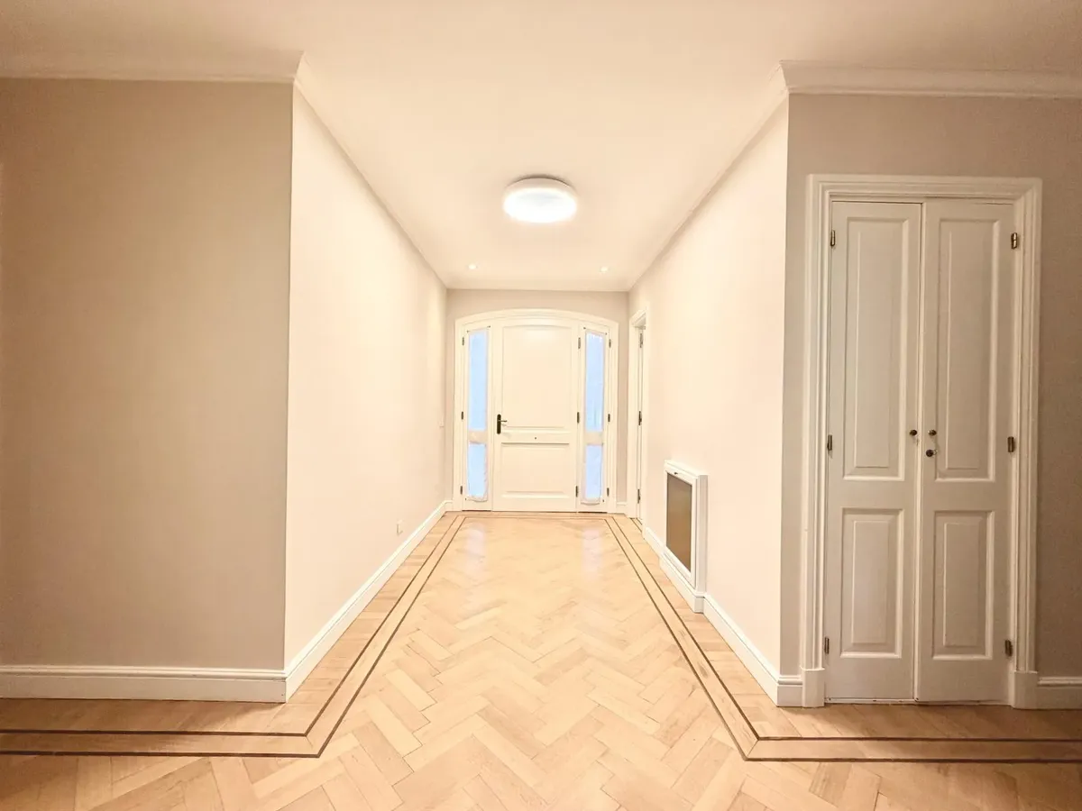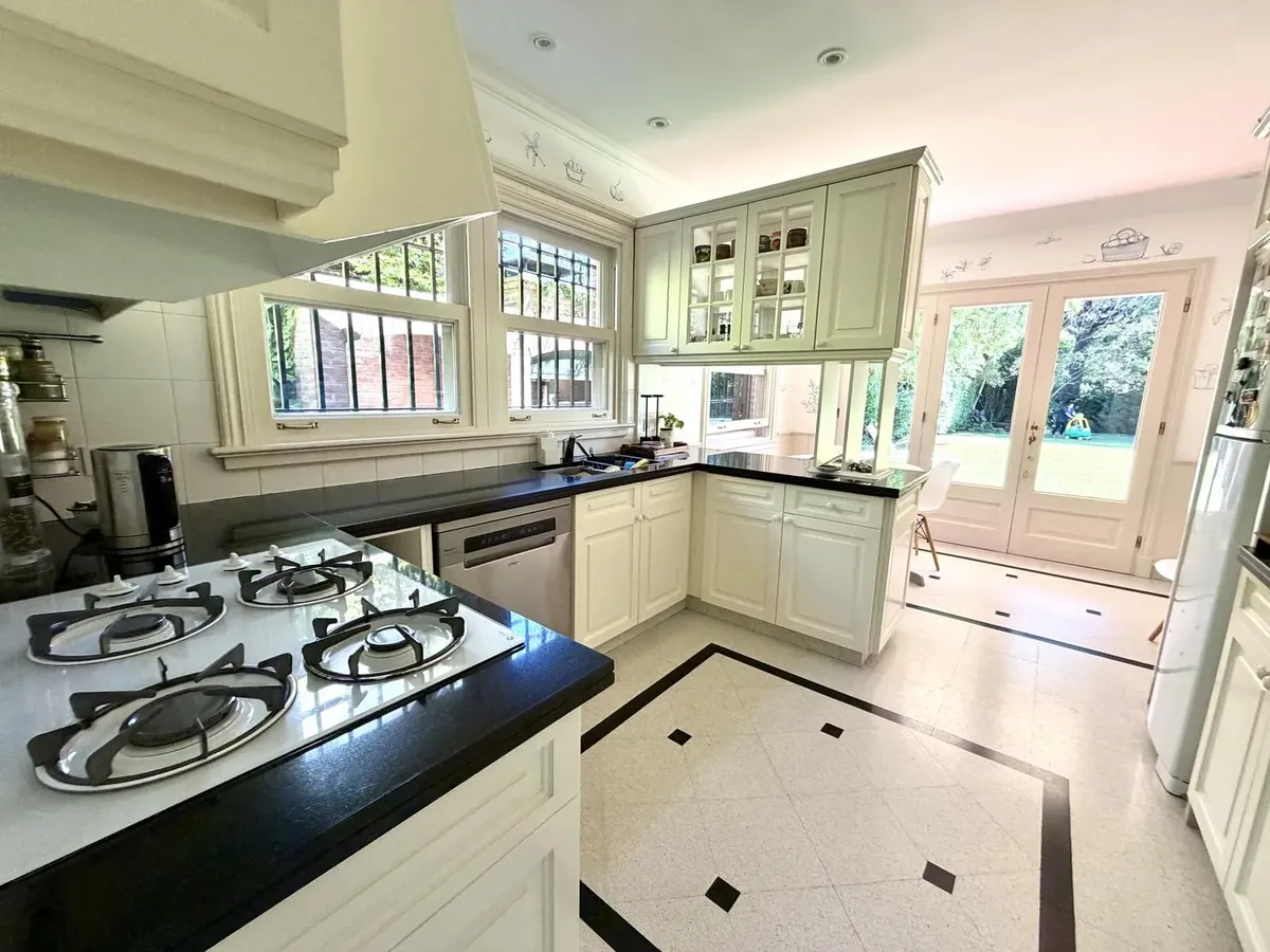Квартира в Acassuso в Barrio Parque Aguirre в английском стиле, проект архитектора Donaldson. 3 спальни: master suite на первом этаже и 2 спальни наверху, одна примерно 6 x 3,5 m, вторая 3 x 3 m, с общей ванной комнатой с джакузи. Центральное кондиционирование Carrier и отопление радиаторами с котлом Peisa; в ванных — мрамор, деревянные оконные блоки, электрические жалюзи. На первом этаже: просторная приёмная с туалетом, большая гостиная-столовая с выходом в сад, отдельная мастер-спальня с гарде