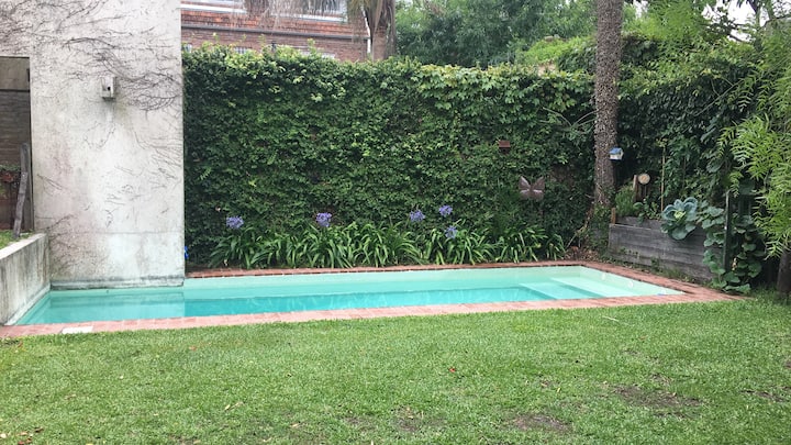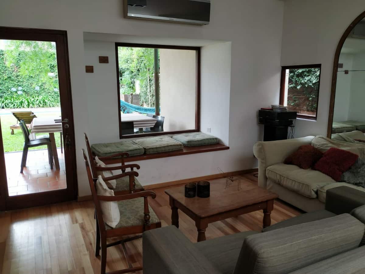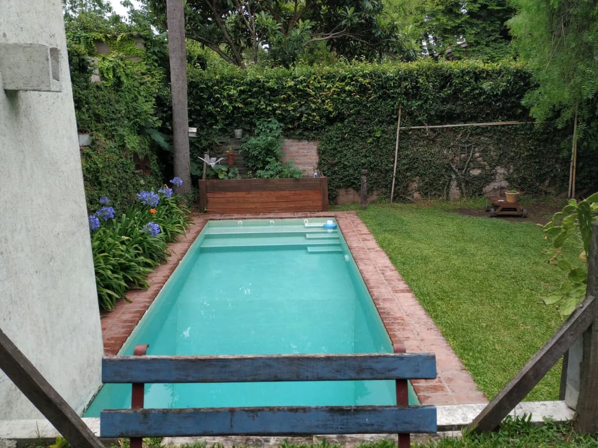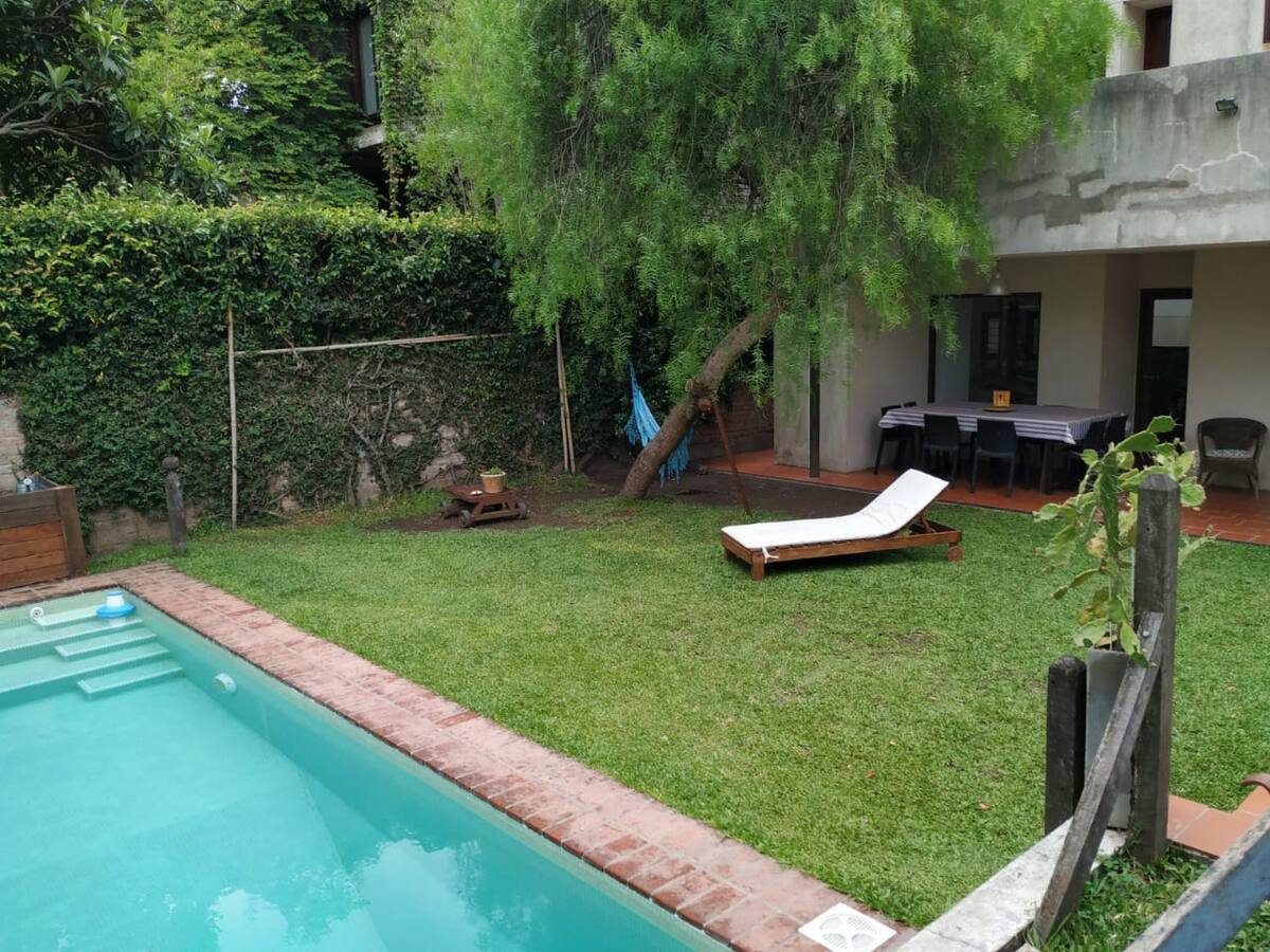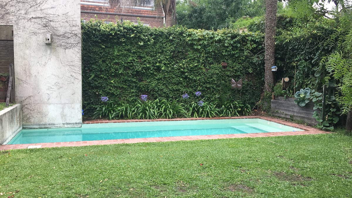Двухэтажный дом в Beccar, San Isidro, с садом, зоной гриля, галереей и бассейном. Рассчитан на 6 человек, включает 3 спальни и 4 ванные комнаты, одна из них находится снаружи у бассейна. Есть кондиционер в каждой комнате, а также на кухне и в гостиной. На территории предусмотрена парковка и система безопасности.