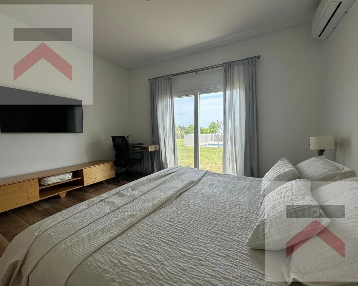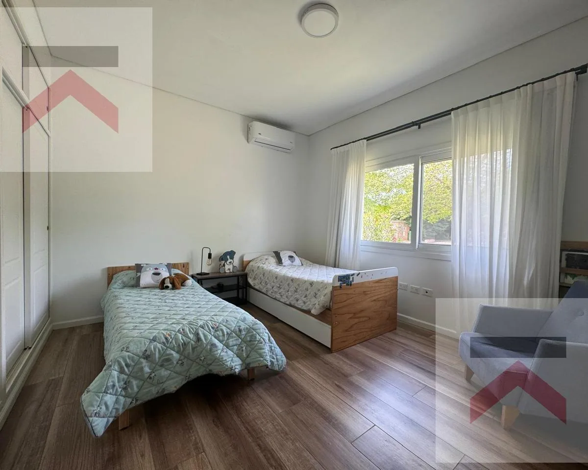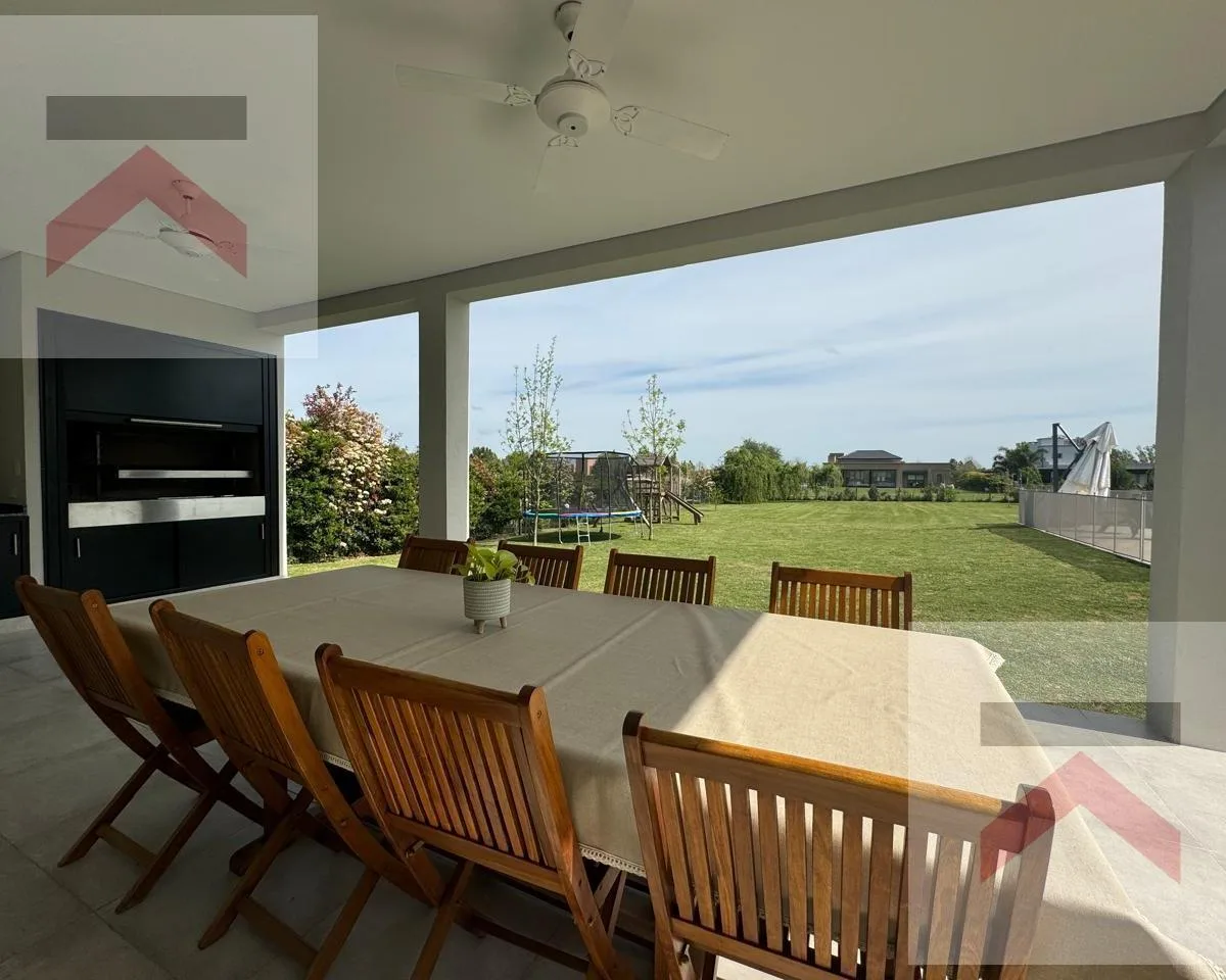 Дом без мебели в Campana, в закрытом комплексе Chacras de la Reserva. Площадь участка 1900 m², ориентация на север. В доме: прихожая, большая гостиная и столовая, гостевой туалет, кухня с дневной столовой, прачечная, а также помещение с отдельным входом, сейчас используется как кабинет. 3 спальни, одна из них с ванной комнатой и гардеробной, ещё 2 полноценных ванных. Есть галерея с зоной гриля и деревянная игровая конструкция, крытый/внутренний паркинг не указан. На участке бассейн с защитой, си