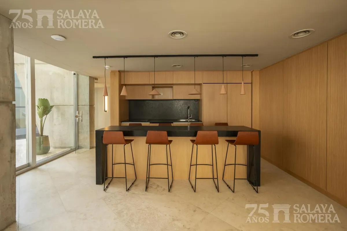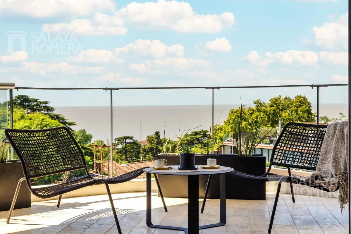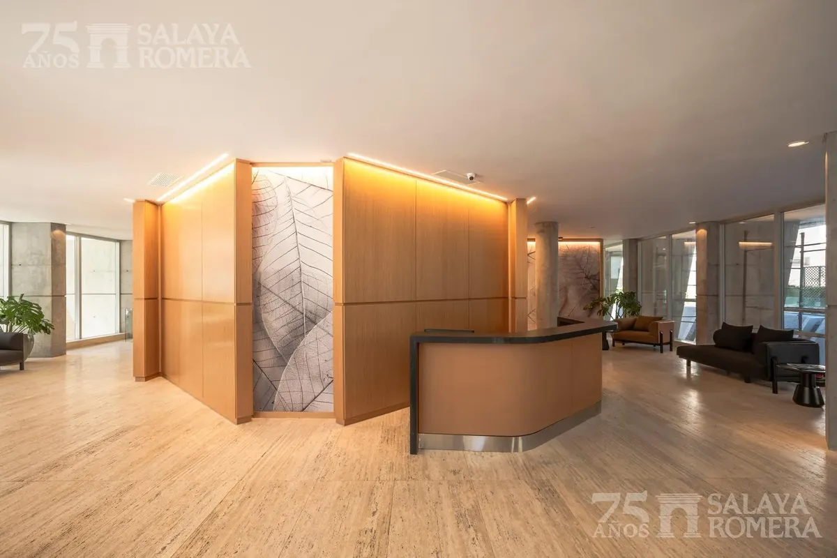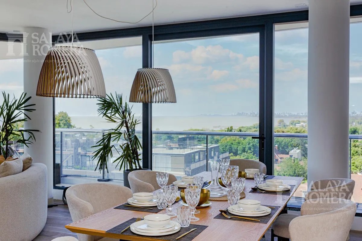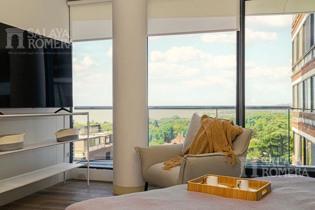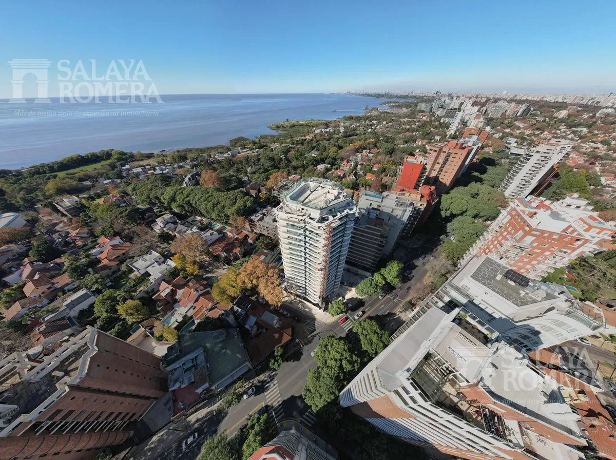 Полуэтажная квартира 5 комнат в La Lucila на высоком этаже, с отдельным лифтовым холлом (palier privado). Окна выходят на Río de la Plata и город. Квартира сдаётся новой (a estrenar), с мебелью для въезда: установлены светильники и шторы. В планировке есть master suite, 2 спальни с собственными ванными комнатами и встроенными шкафами, а также отдельная зависимость с собственным санузлом. Есть две зоны отдельного входа в кухню: отдельная кухня с обеденной зоной, кладовая/прачечная (lavadero) и за