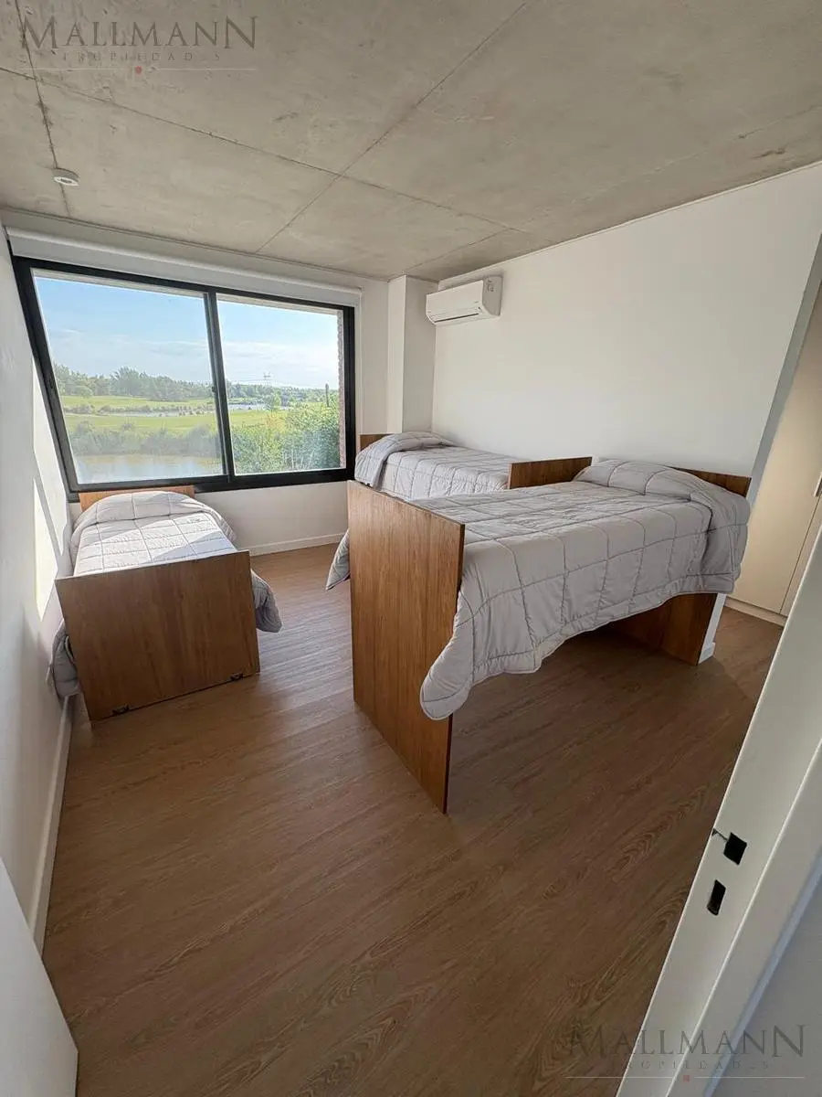 Двухуровневая квартира с 3 спальнями в Pilar с видом на поле для гольфа. На первом уровне: гостиная с видом на поле, кухня с барной стойкой, спальня с отдельным входом, галерея с зоной гриля, благоустроенный участок с многоярусным ландшафтом и камин-гриль (fogonero). На втором уровне: открытый кабинет, главная спальня с ванной комнатой и балконом-террасой, третья спальня с ванной комнатой. В комплексе предусмотрены бассейн, общая гостиная для жильцов (SUM) и раздевалки.