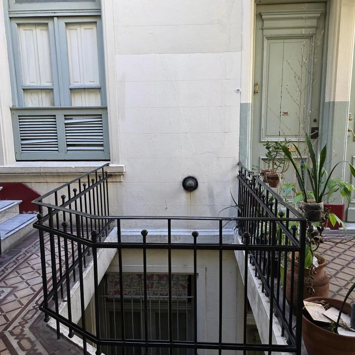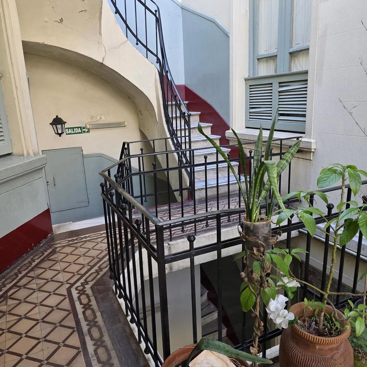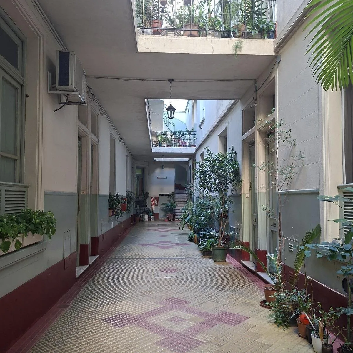 PH в Monserrat, 4 ambientes, на 1-м этаже без лифта. Окна во двор, с застеклённой галереей. В планировке 3 спальни, совмещённая гостиная и столовая, отдельная кухня и полноценная ванная. Есть чердак (guardilla). По данным объявления, Aysa включена в коммунальные платежи здания, животных не допускают, доступ к квартире описан как неудовлетворительный (no accesible).