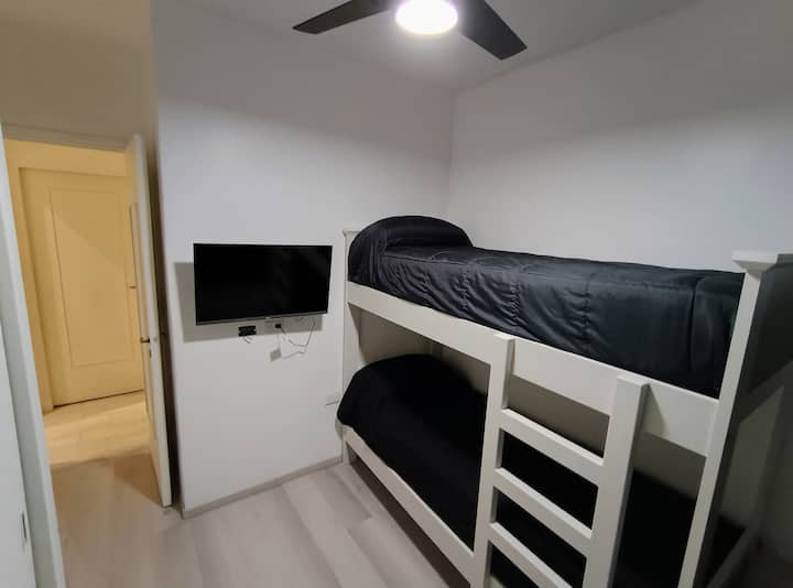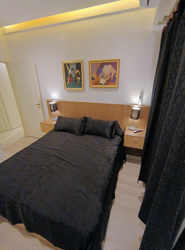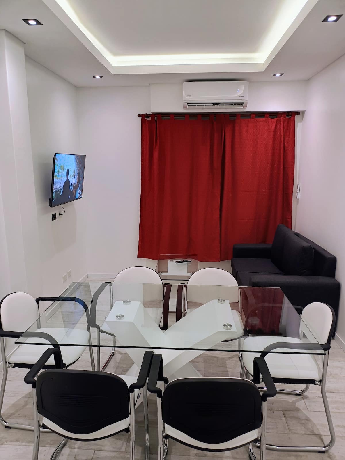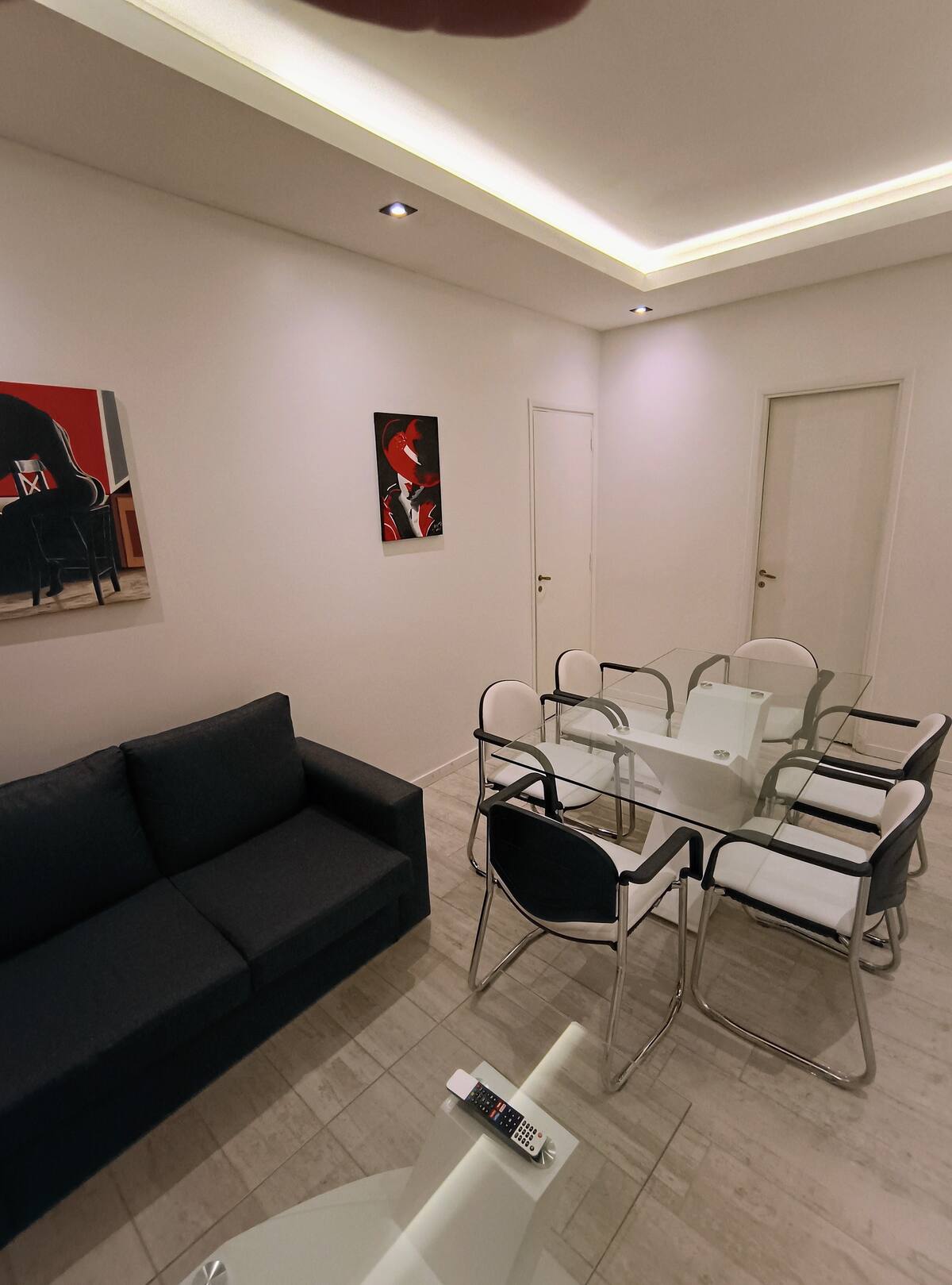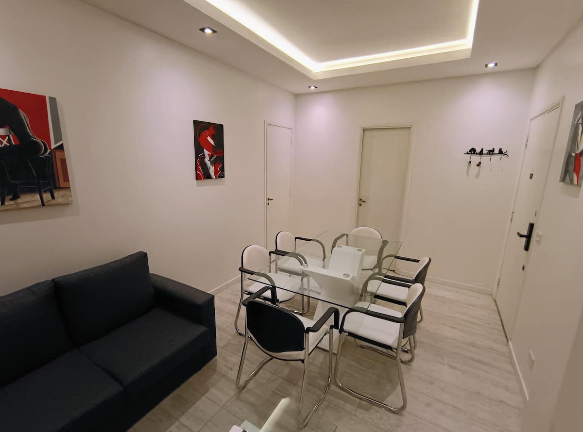 Квартира с 4 комнатами расположена на первом этаже 8-этажного здания после полной реконструкции. В гостиной установлен обеденный стол на 6 человек, телевизор с диагональю 43 дюйма, кресло и журнальный столик. В квартире 3 спальни: в главной спальне двуспальная кровать, в другой — двухъярусная кровать, в спальне в глубине помещения — односпальная кровать; во всех спальнях есть телевизор, в спальне в глубине есть ванная комната. Кухня оборудована для приготовления пищи, предусмотрена барная стойка