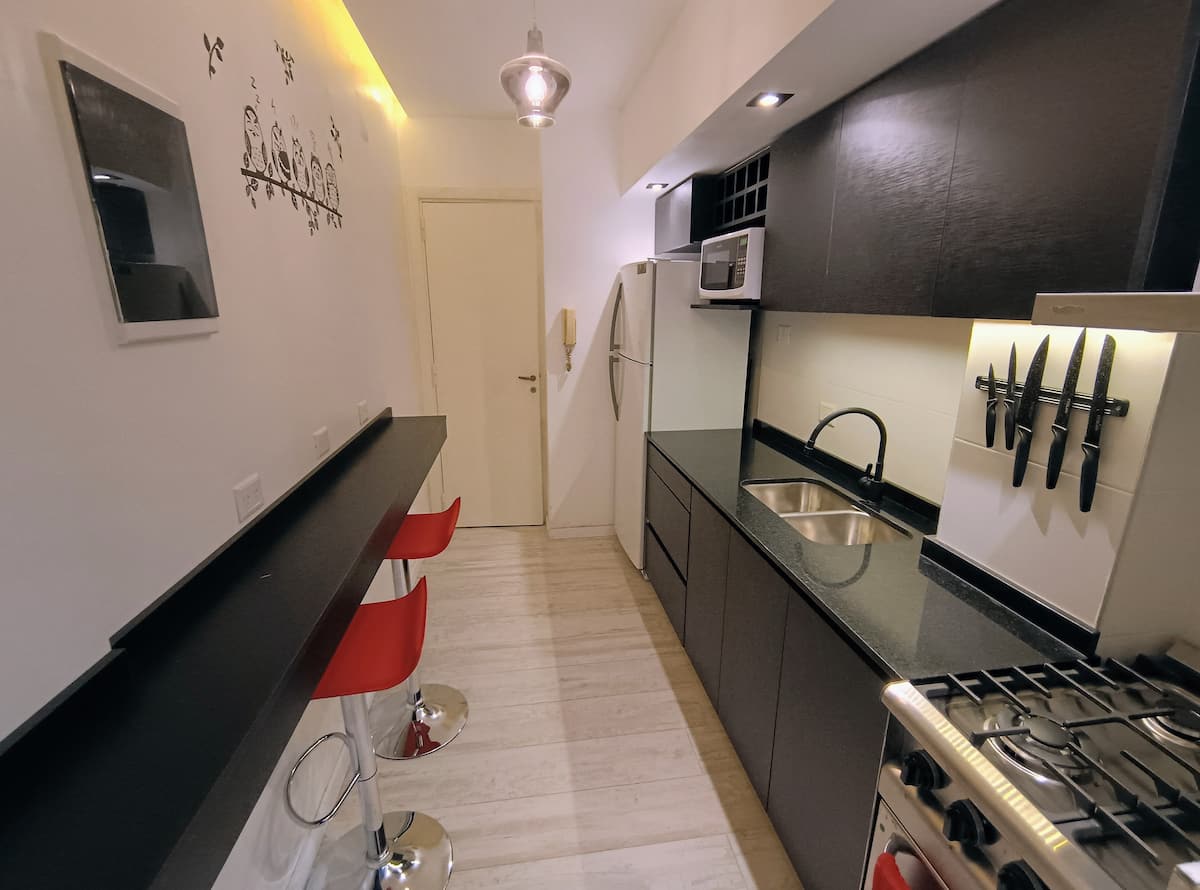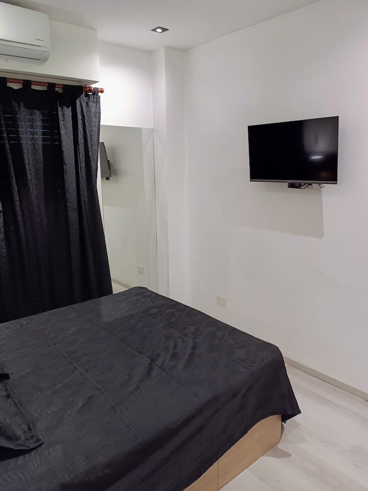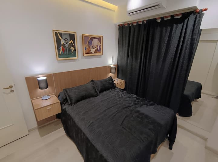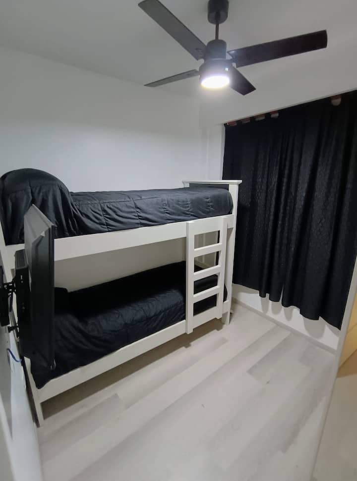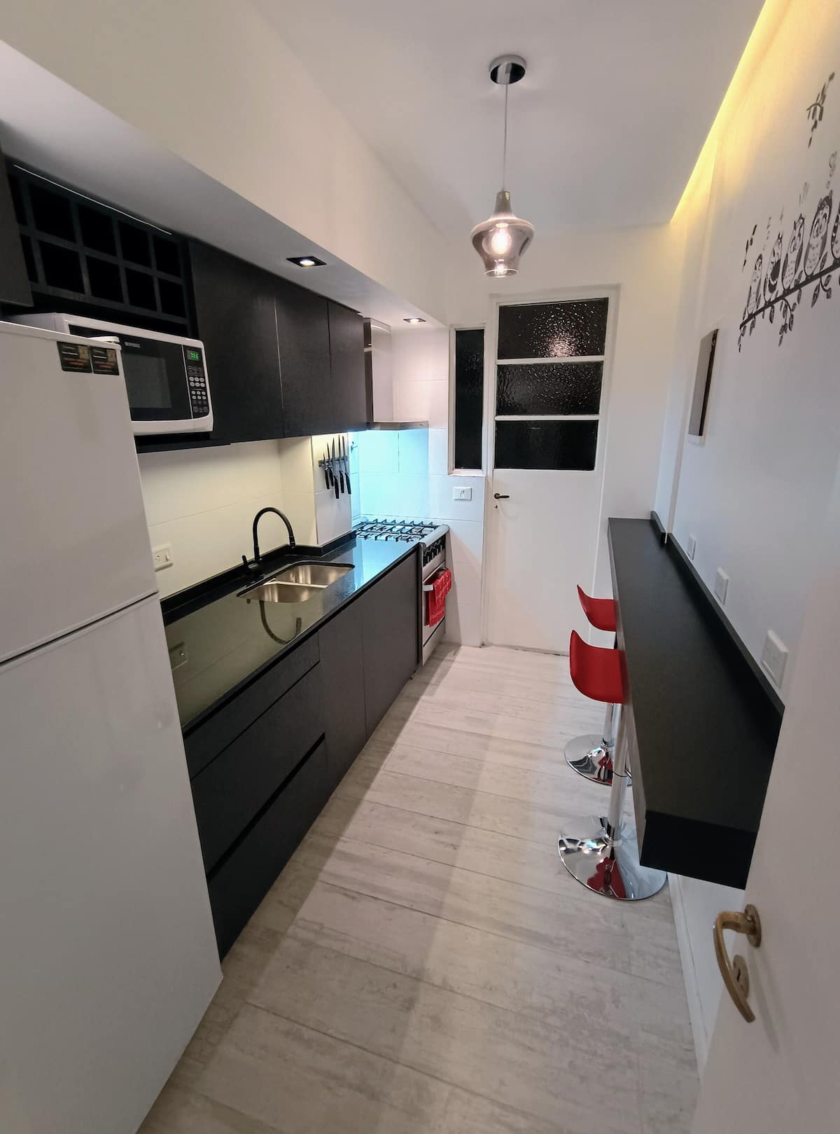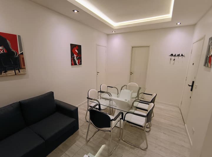Квартира с 4 комнатами расположена на первом этаже 8-этажного здания после полной реконструкции. В гостиной установлен обеденный стол на 6 человек, телевизор с диагональю 43 дюйма, кресло и журнальный столик. В квартире 3 спальни: в главной спальне двуспальная кровать, в другой — двухъярусная кровать, в спальне в глубине помещения — односпальная кровать; во всех спальнях есть телевизор, в спальне в глубине есть ванная комната. Кухня оборудована для приготовления пищи, предусмотрена барная стойка